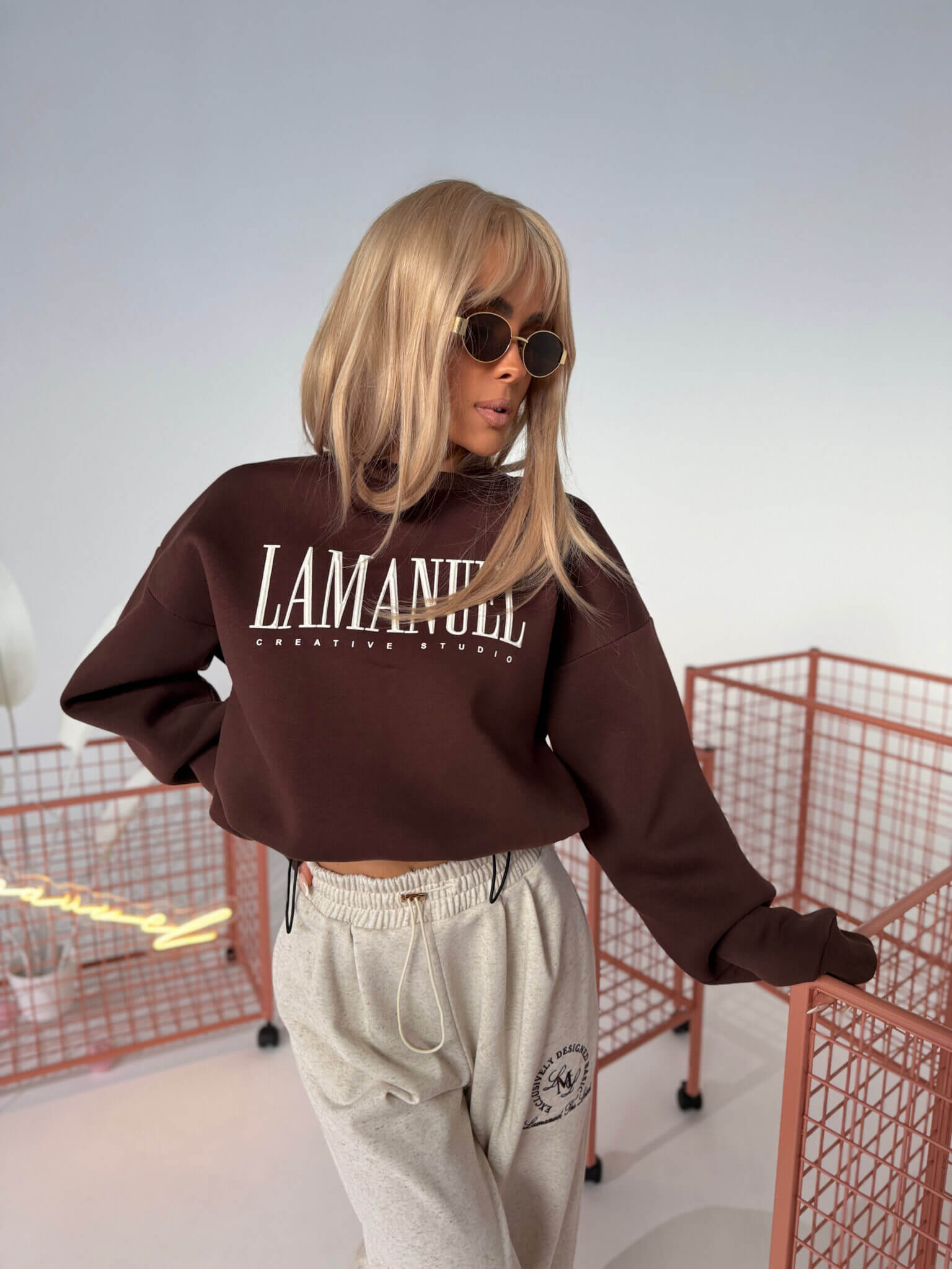 Krój oparty na klasycznej formie z delikatnym efektem crop. Mięsista dzianina drapana – miękka od spodu, trzyma objętość bez uczucia ciężkości. Z przodu przestrzenne logo z gumy – pod palcami wyczuwalna faktura, na żywo robi wrażenie. Dół regulowany – możesz ją nosić luźno albo ściągnąć do formy bombki. Rękawy szerokie, wykończone elastycznym ściągaczem. Prosty model, który działa przez detal.