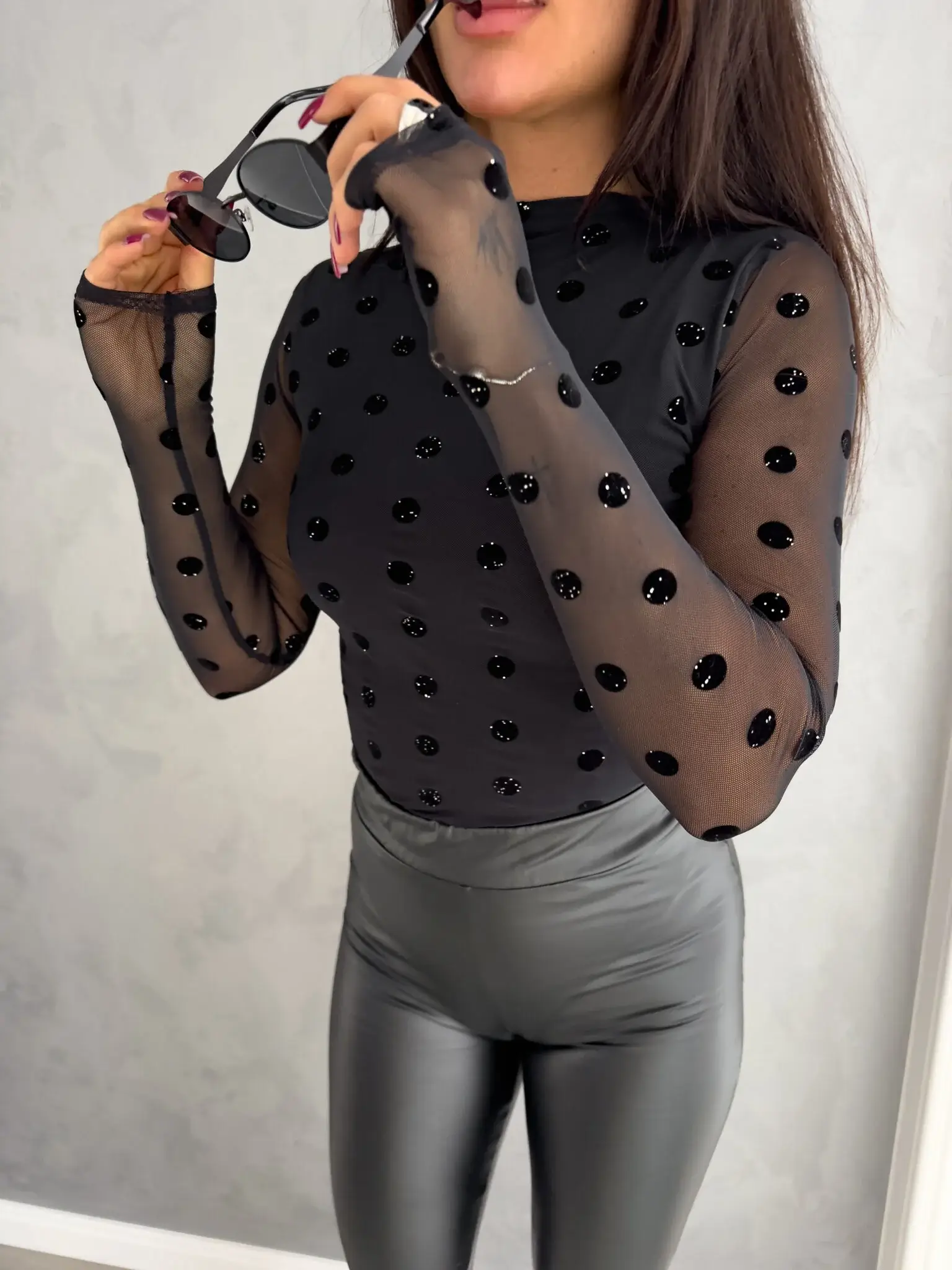 Bluzka Sabrina o dopasowanym kroju sprawdzi się jako baza do wielu różnorodnych stylizacji. Charakteryzuje się rękawem typu long sleeve. Delikatna stójka.