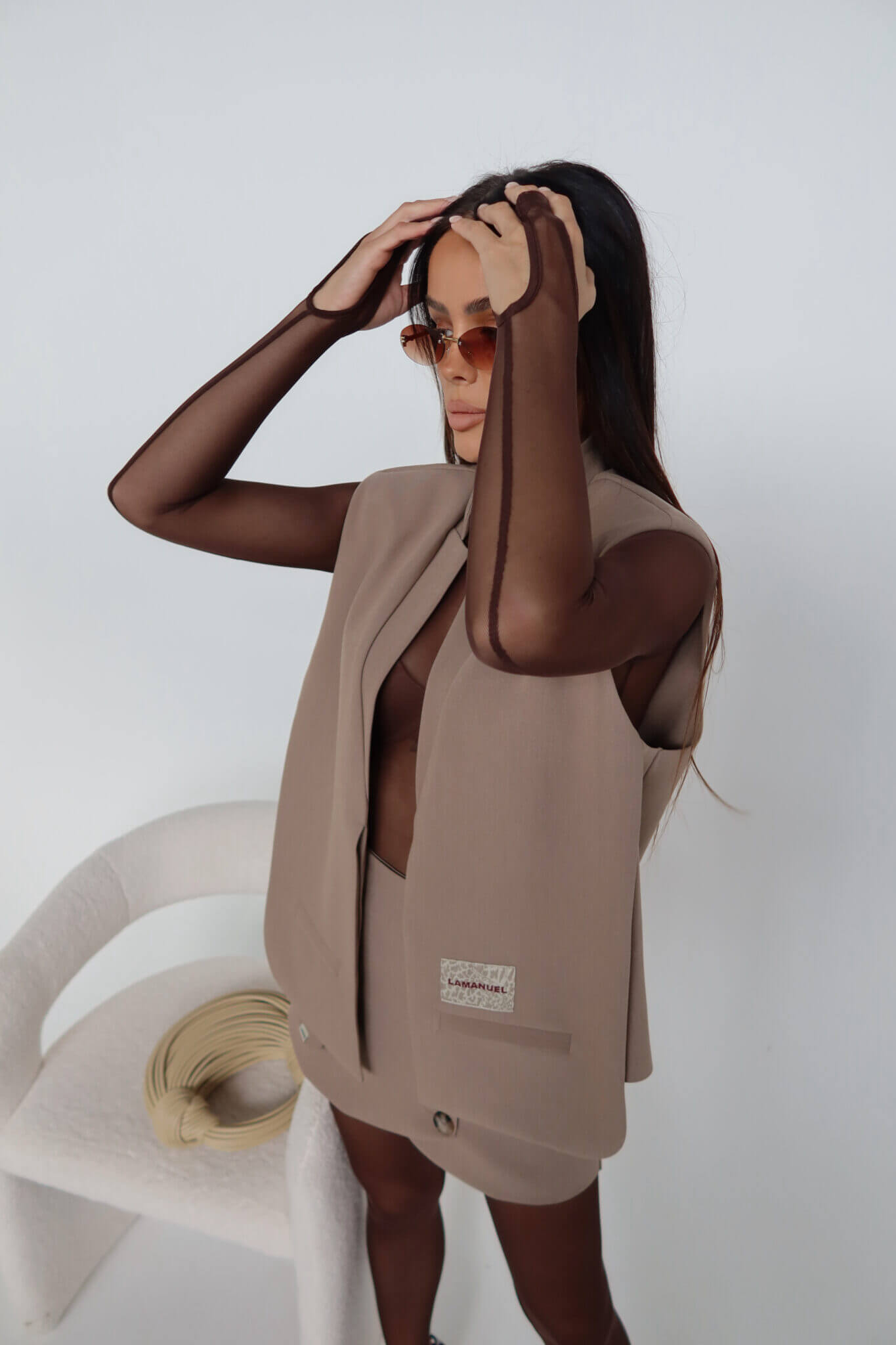 Kamizelka FOLD LAMANUEL o prostym, pudełkowym kroju, bez zapięcia, z mocno zaznaczoną linią ramion. Minimalistyczna forma przełamana kontrastową naszywką z logo LAMANUEL, umieszczoną przy jednej z atrap kieszeni. Model wykonany z lekko strukturalnej tkaniny garniturowej – sztywniejsza forma dobrze trzyma linię i dodaje sylwetce wyrazistości. Sprawdzi się jako uzupełnienie stylizacji ze spódnicą, spodniami lub warstwowo – na koszulę, golf czy siateczkowy top.