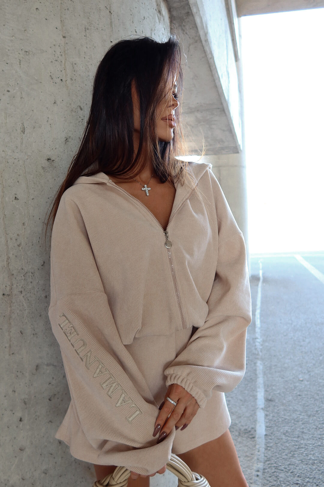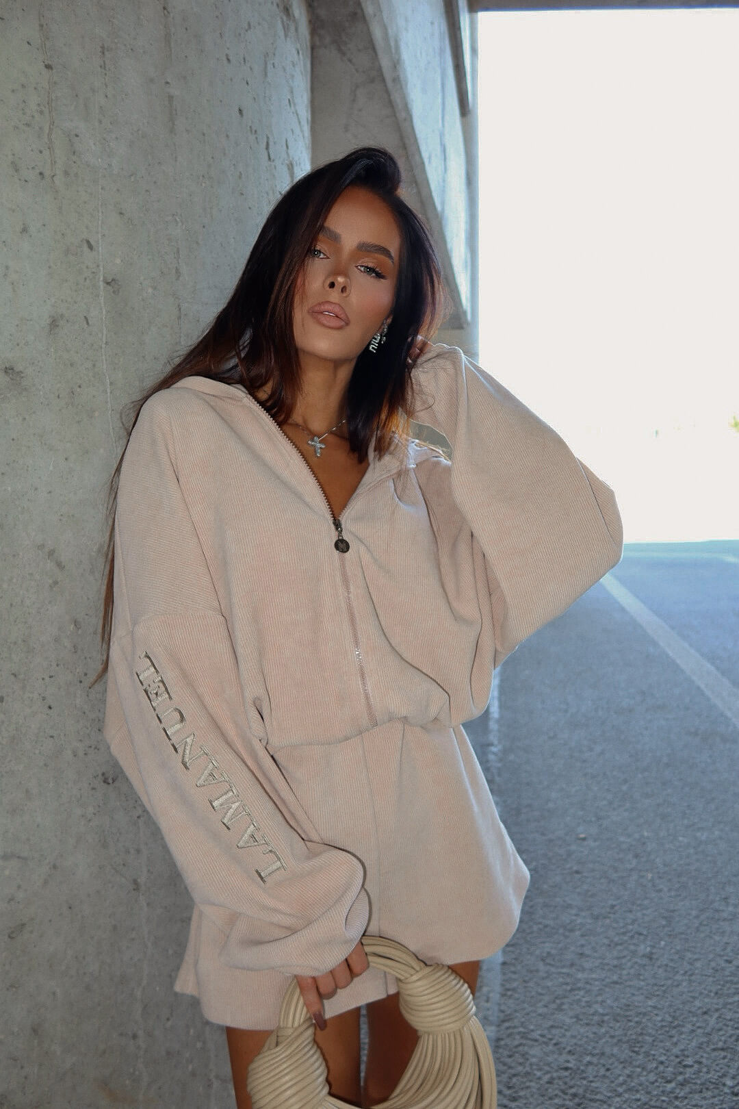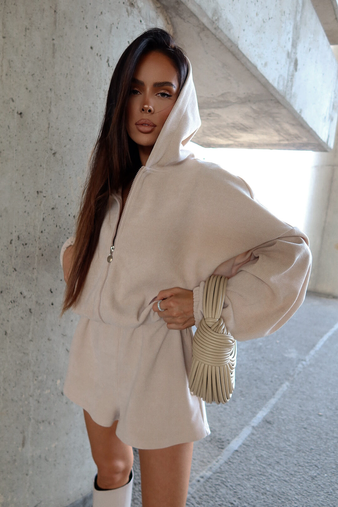 Jednoczęściowy kombinezon z prążkowanej dzianiny BUTTER LAMANUEL, który łączy styl i wygodę w miejskim wydaniu. Luźna góra z kapturem i zamkiem kontrastuje z krótkimi nogawkami, tworząc sylwetkę o lekkim, nowoczesnym charakterze. Model w rozmiarze one size — dzięki elastycznej talii z regulacją świetnie dopasowuje się do różnych sylwetek, również w rozmiarze L.