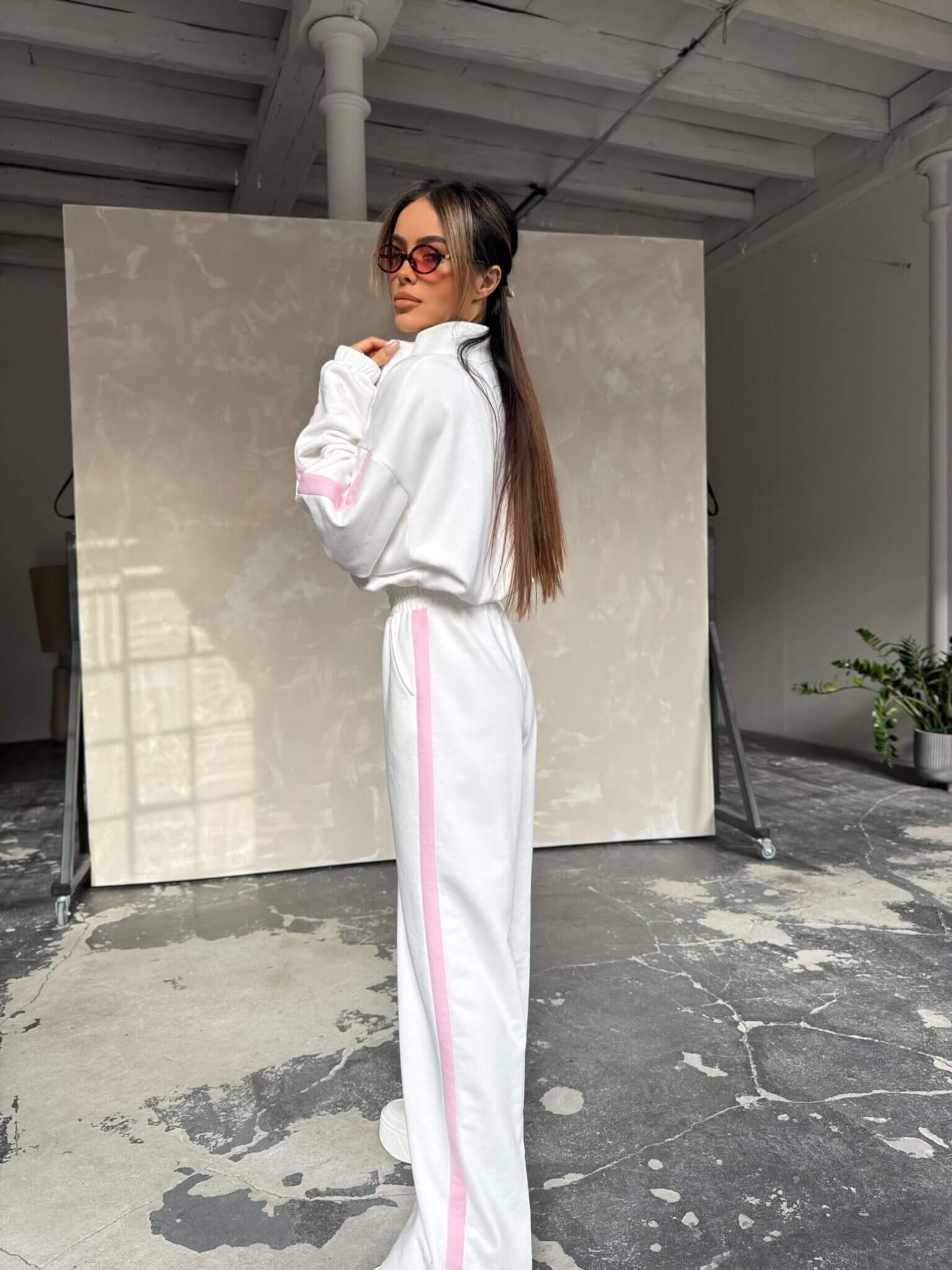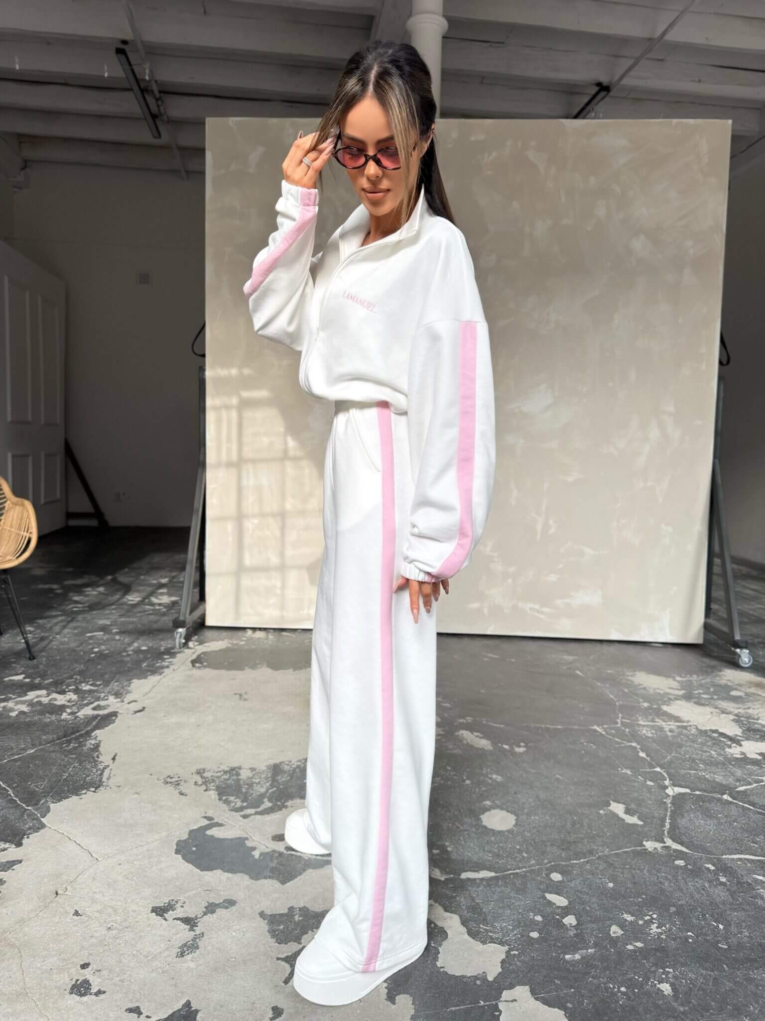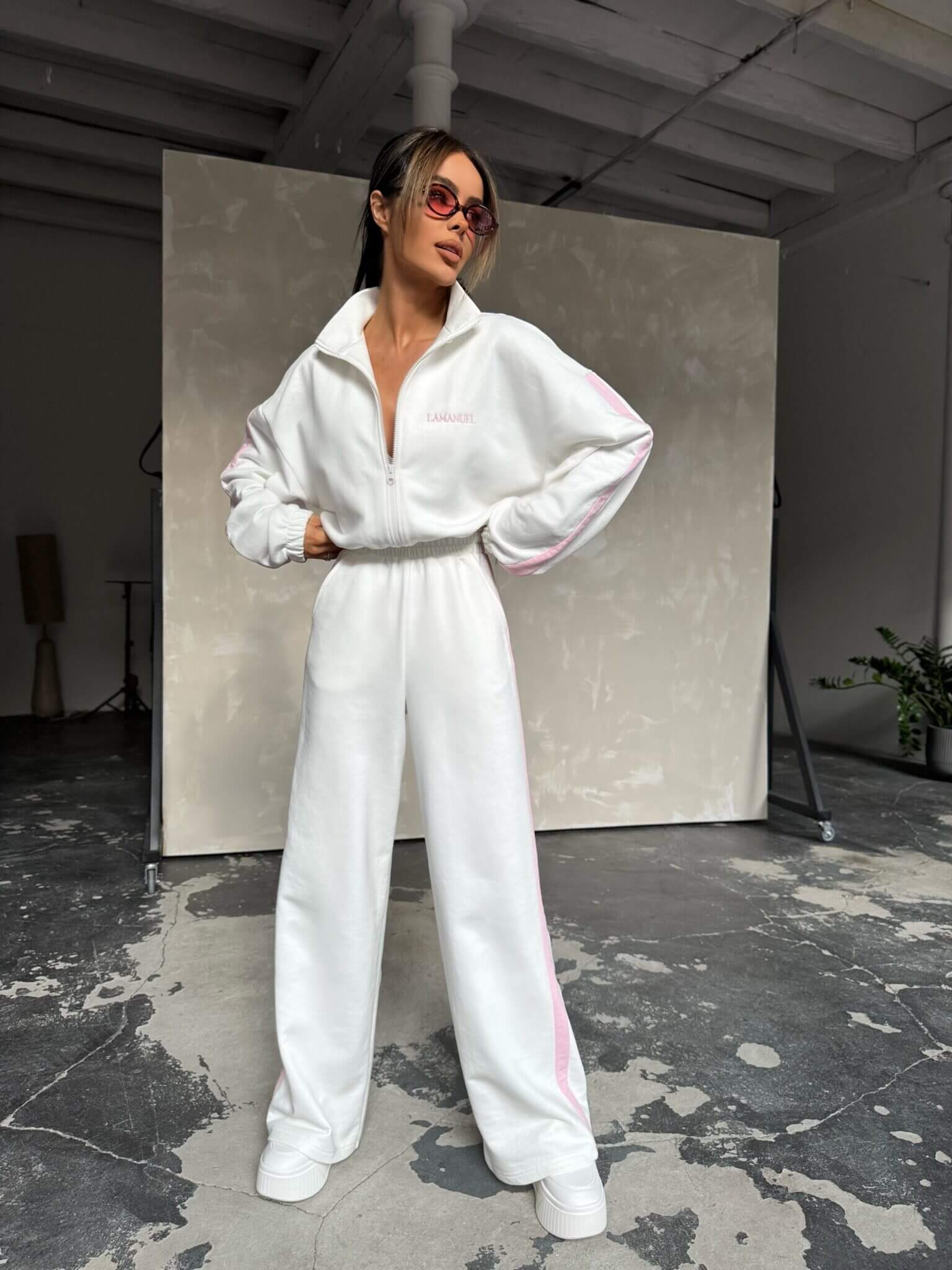 Stylowy design łączy sportową elegancję z subtelnym logo na bluzie. Materiał jest miękki i przyjemny w dotyku, co sprawia, że kombinezon doskonale sprawdzi się na każdą porę roku. Oversize’owy krój dodaje luzu i nowoczesnego wyglądu, a szerokie nogawki z lampasami optycznie wydłużają sylwetkę. Dzięki zamkowi pod szyją można regulować głębokość dekoltu, a elastyczny pas zapewnia idealne dopasowanie.