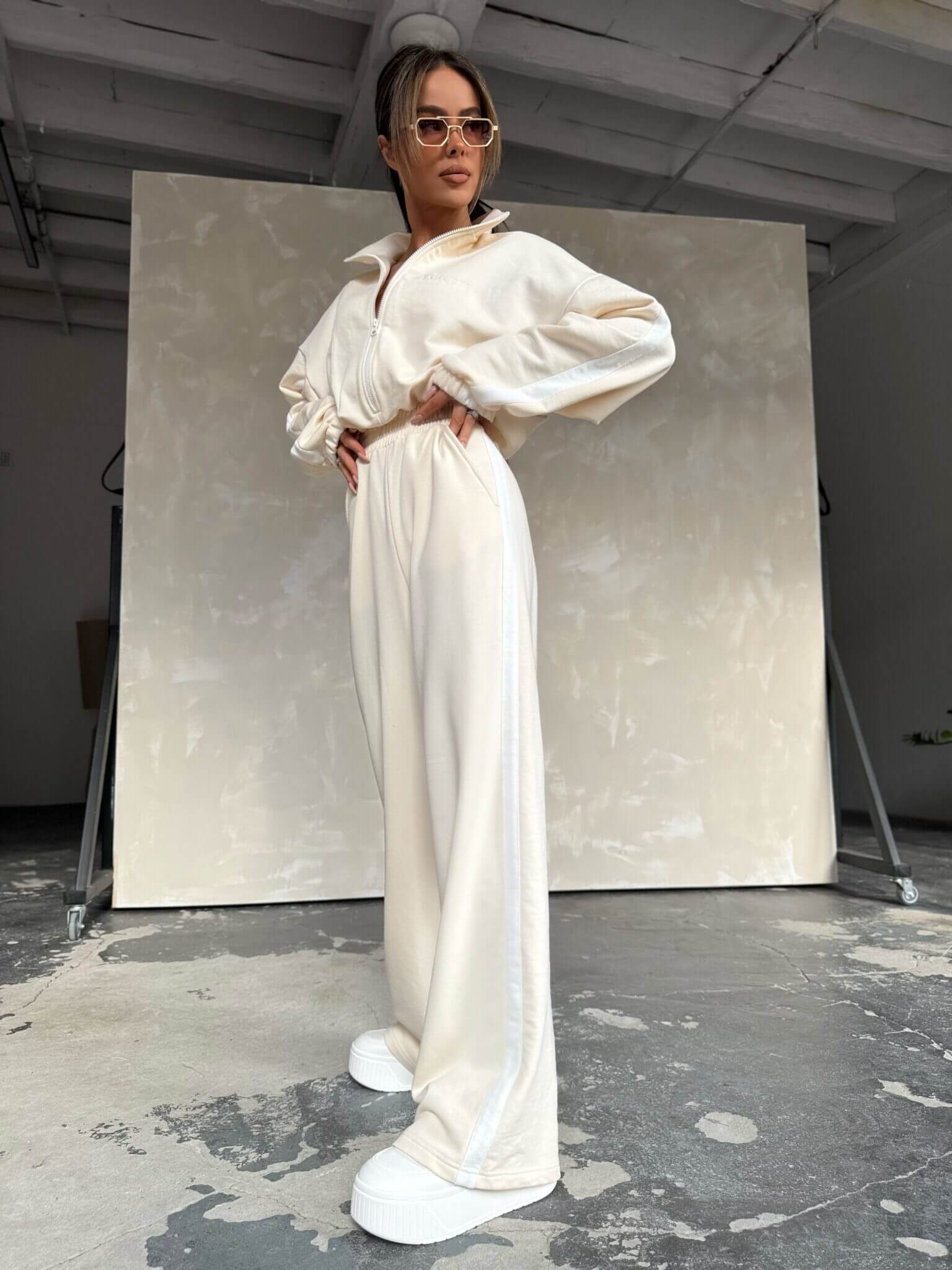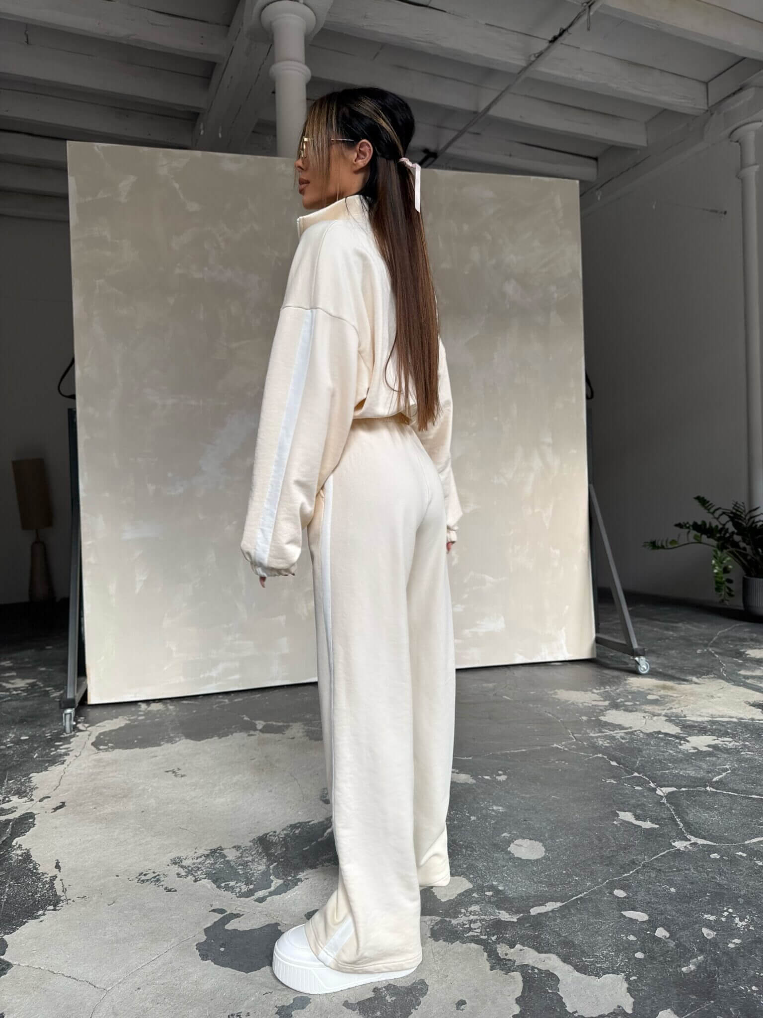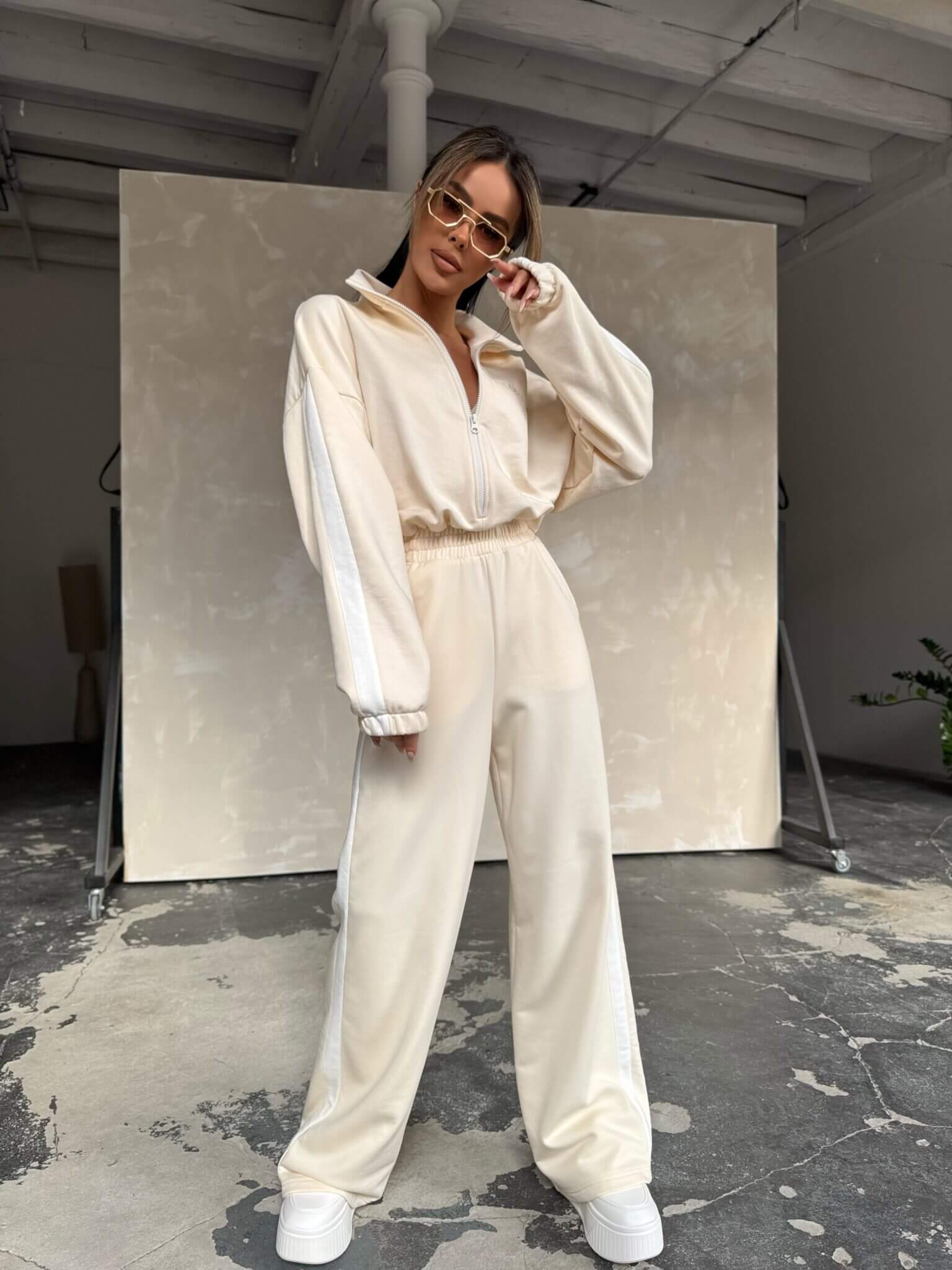Stylowy design łączy sportową elegancję z subtelnym logo na bluzie. Materiał jest miękki i przyjemny w dotyku, co sprawia, że kombinezon doskonale sprawdzi się na każdą porę roku. Oversize’owy krój dodaje luzu i nowoczesnego wyglądu, a szerokie nogawki z lampasami optycznie wydłużają sylwetkę. Dzięki zamkowi pod szyją można regulować głębokość dekoltu, a elastyczny pas zapewnia idealne dopasowanie.