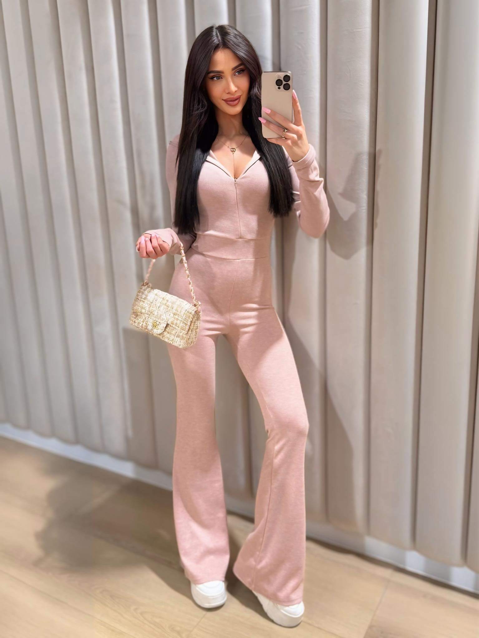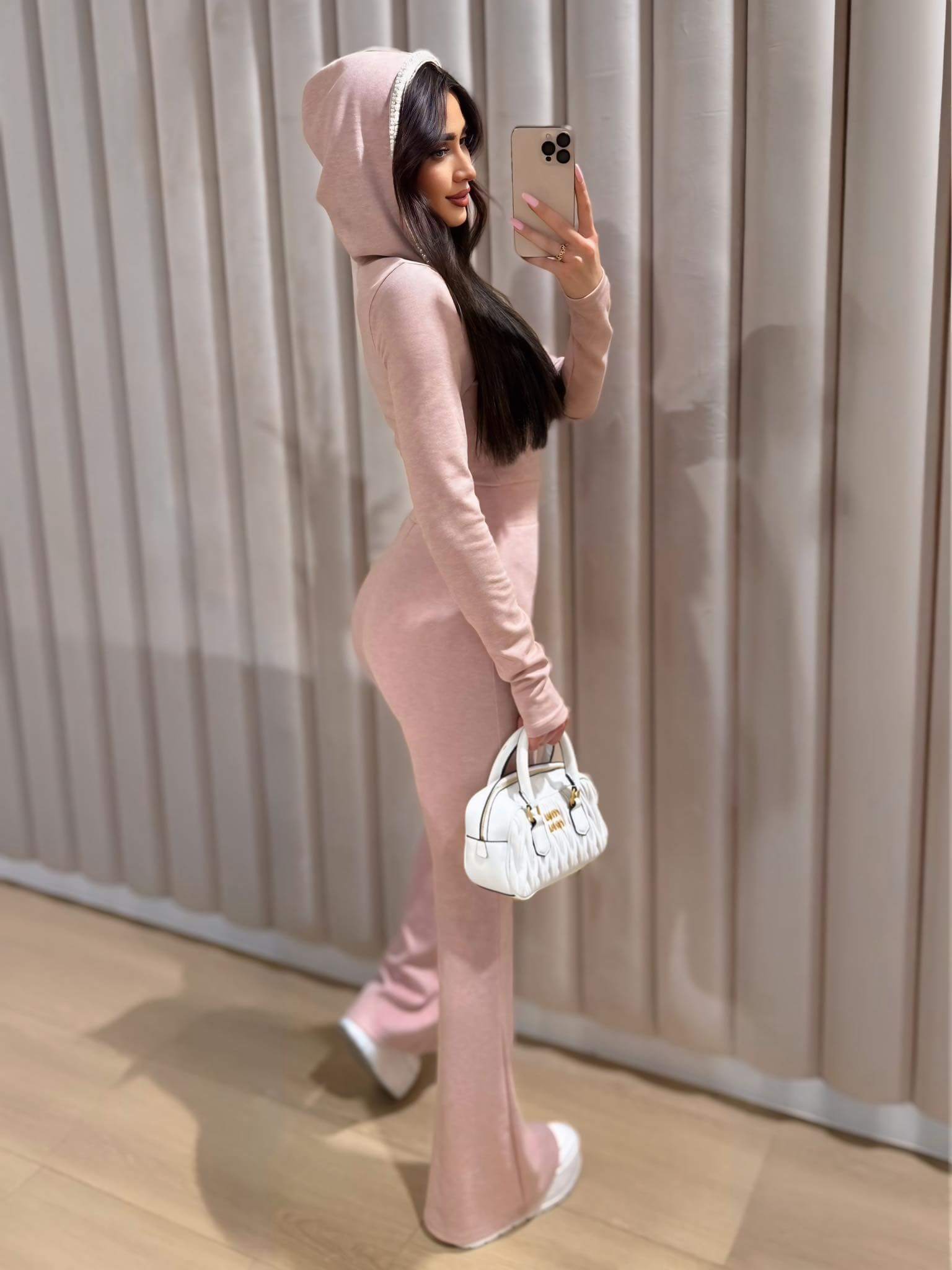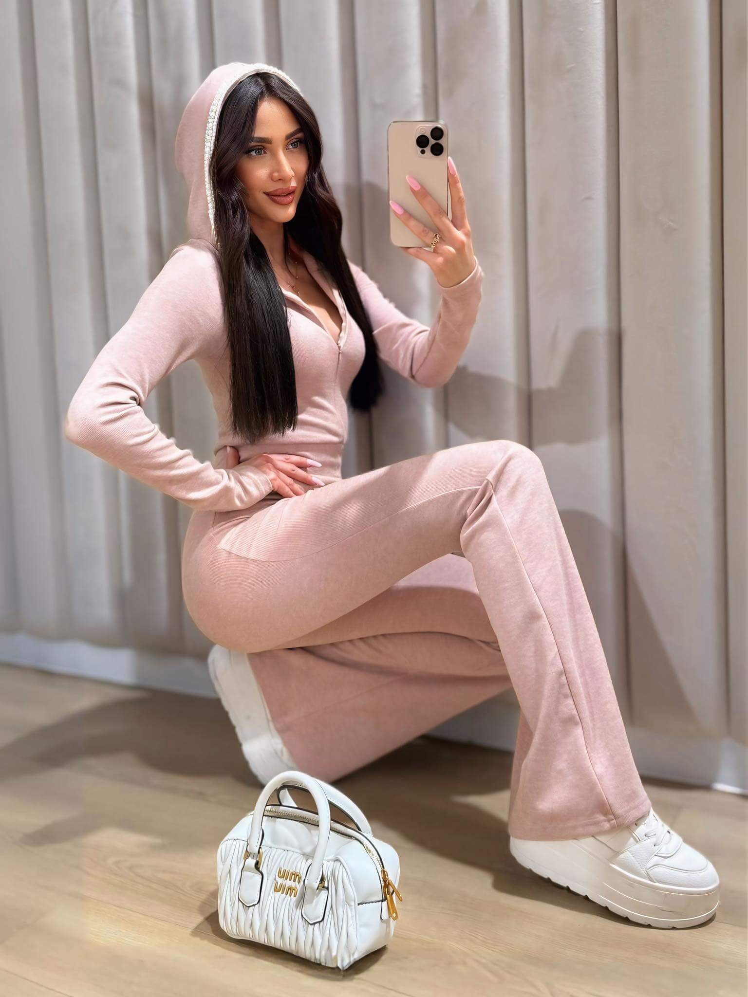 Kaptur obszyty perełkami jakości premium, wyszczuplający pas a do tego nogawka wydłużająca nogi typu dzwon.