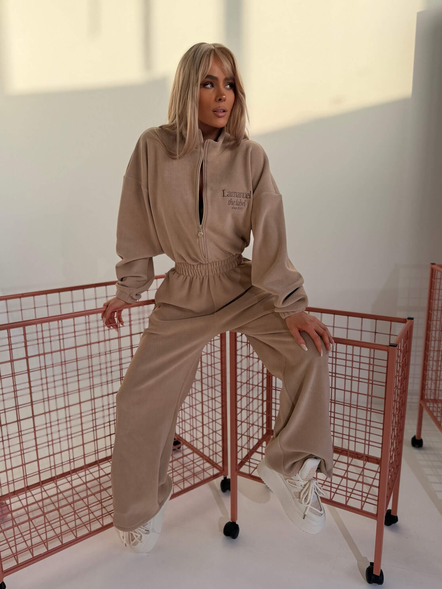 Wykonany z tego samego materiału, który w zeszłym roku wyprzedał się do zera – jeśli znasz, to wiesz. Miękki, sprężysty mikropolar, który otula bez przegrzewania. Daje uczucie komfortu od pierwszego założenia. Zamek pod szyją, stójka, swobodny krój i szeroka nogawka. W pasie elastyczna guma, która nie dzieli sylwetki – wszystko układa się lekko, naturalnie. Haft z przodu i z tyłu dodaje charakteru i zamyka projekt na 100%. Do noszenia solo – z dużymi okularami i sneakersami. Albo warstwowo, pod płaszczem, kiedy wieje. Nie krępuje ruchów, nie traci formy. Działa lepiej niż ulubiony dres, wygląda jak przemyślany look. To nie jest zwykły kombinezon. To najwygodniejsze, co możesz na siebie wrzucić – i nadal wyglądać jak milion monet.