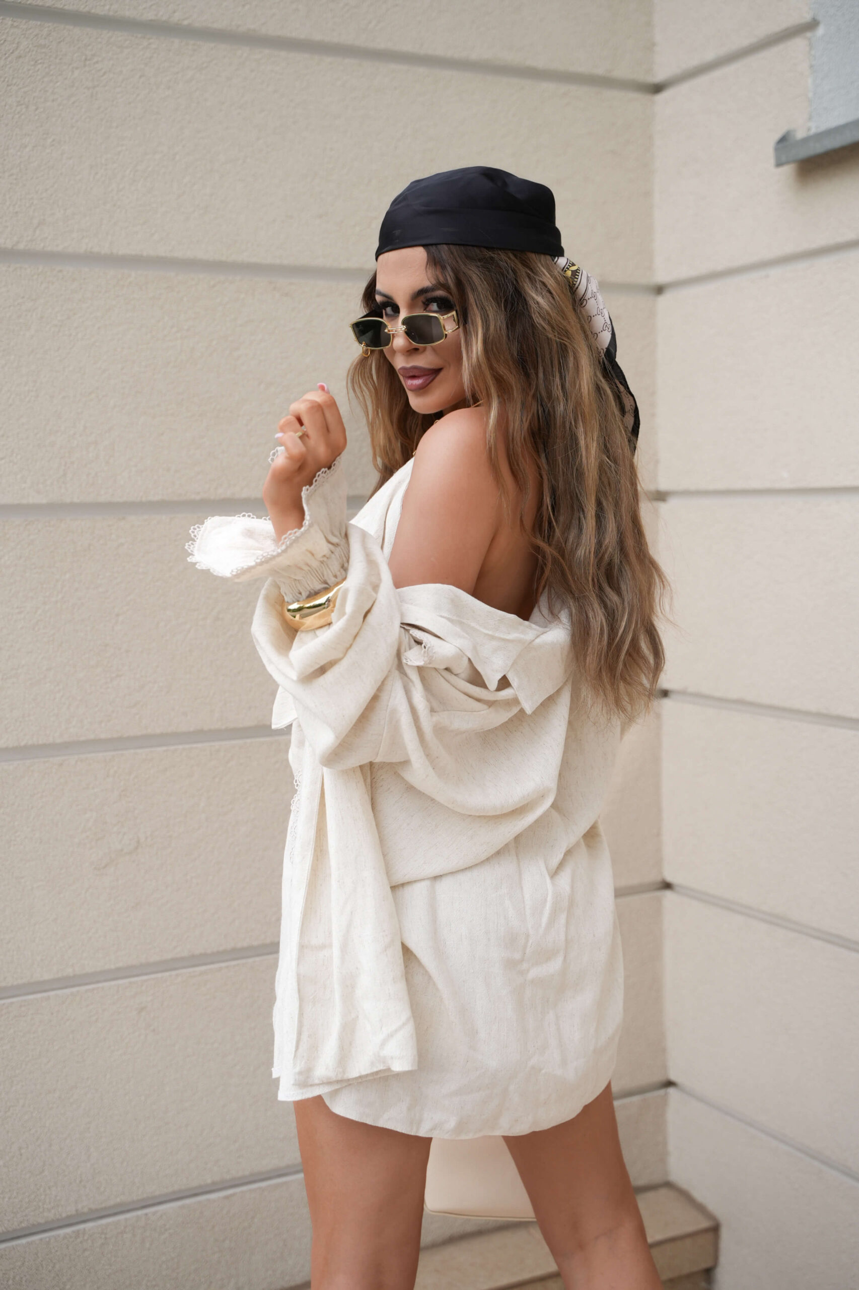 Wyjątkowy 3 częściowy lniany komplet damski w stylu boho składający się z koszuli oversize, topu oraz spodenek. Top o formie stanika wiązany na szyi oraz przewiązywany w talii, dzięki czemu można dostosować pod dowolne wymiary. Szorty z gumką w pasie. Koszula oversize z koronkowymi wykończeniami boho. Możesz nosić ją luźno, przewiązaną w talii , rozpiętą oraz osobno jako sukienkę.