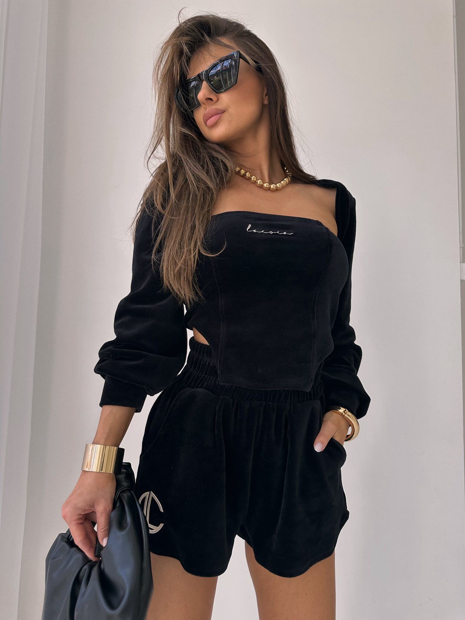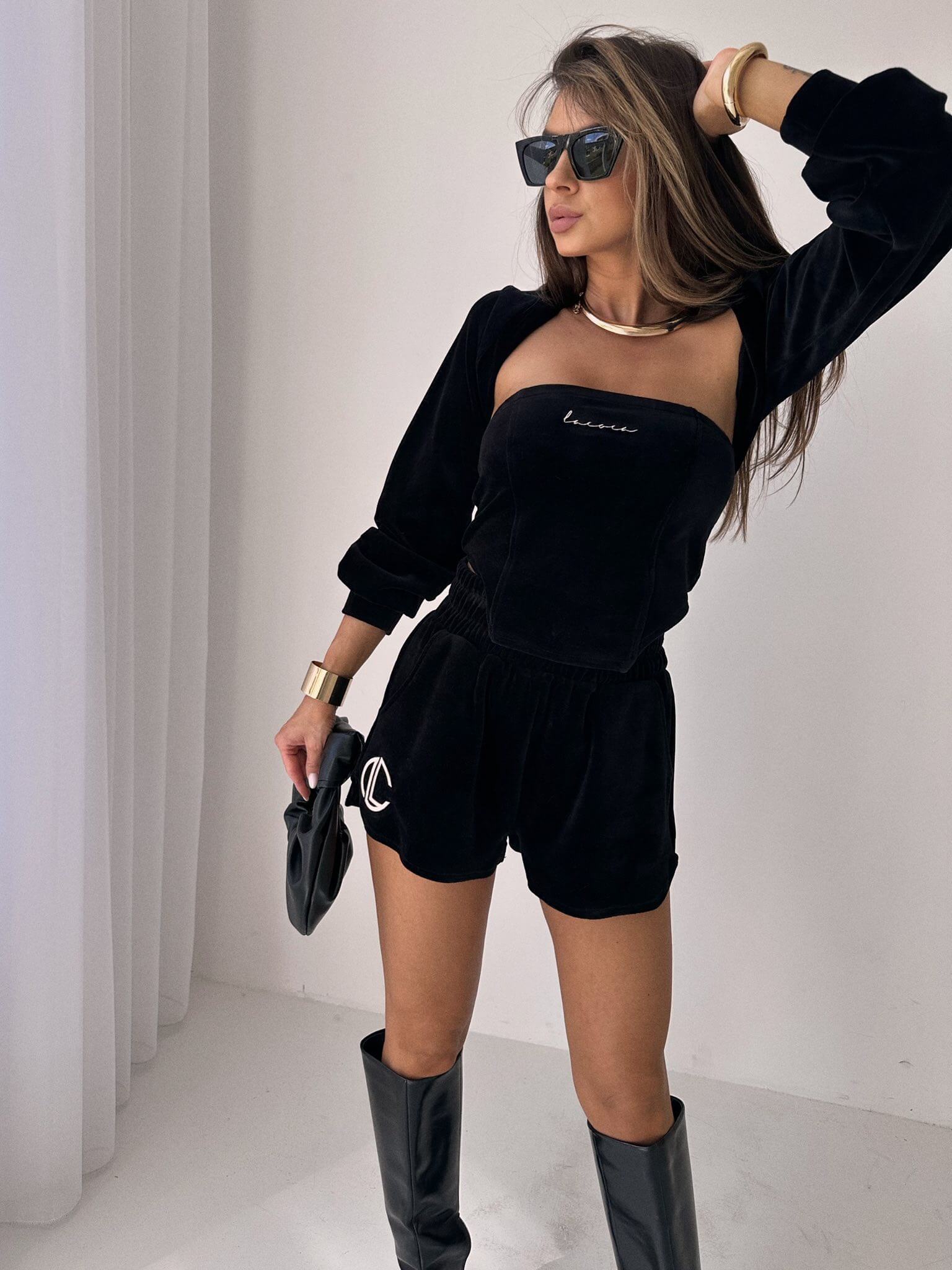Top i szorty zdobione haftami z Nazwą i logo marki.