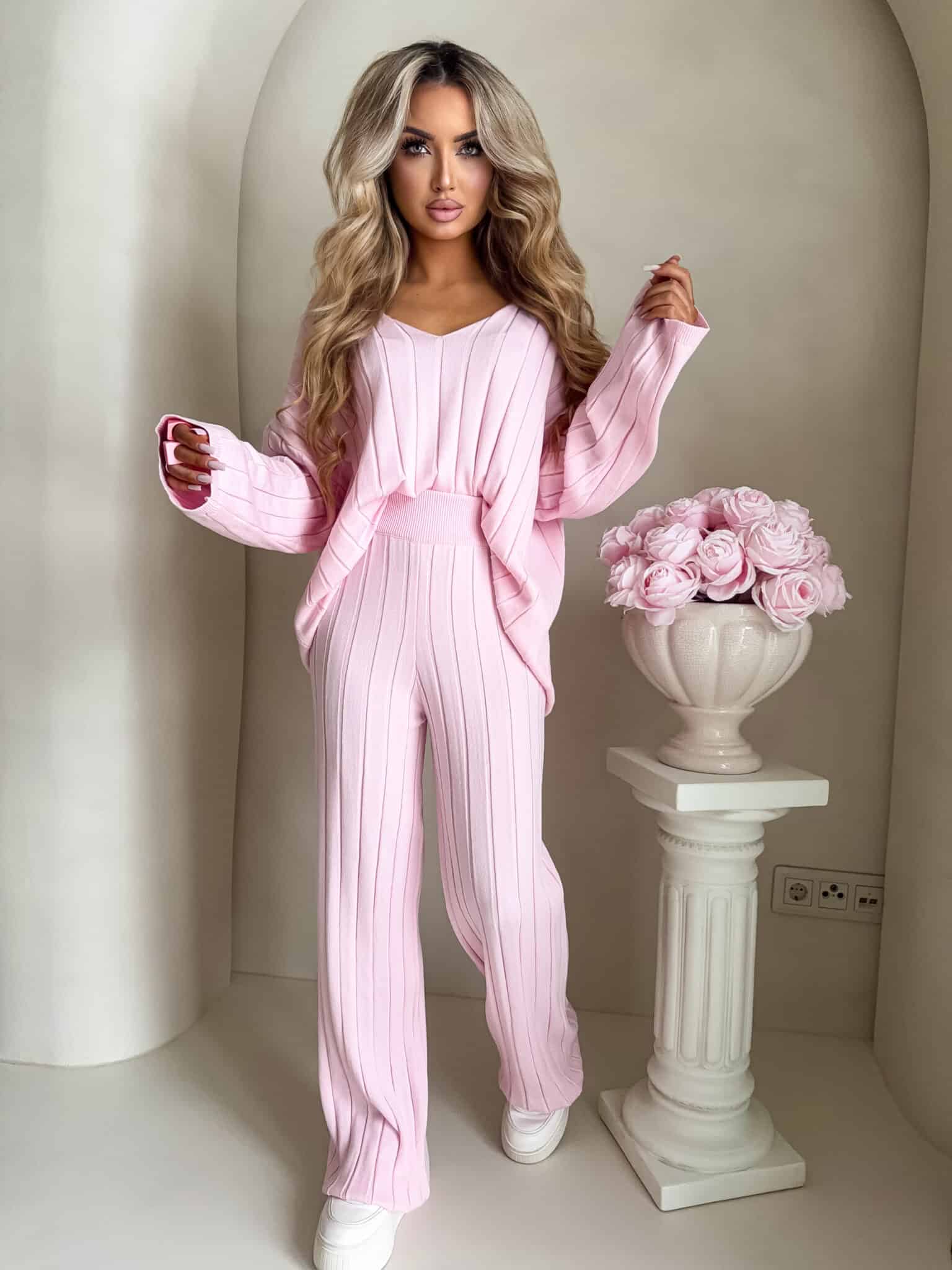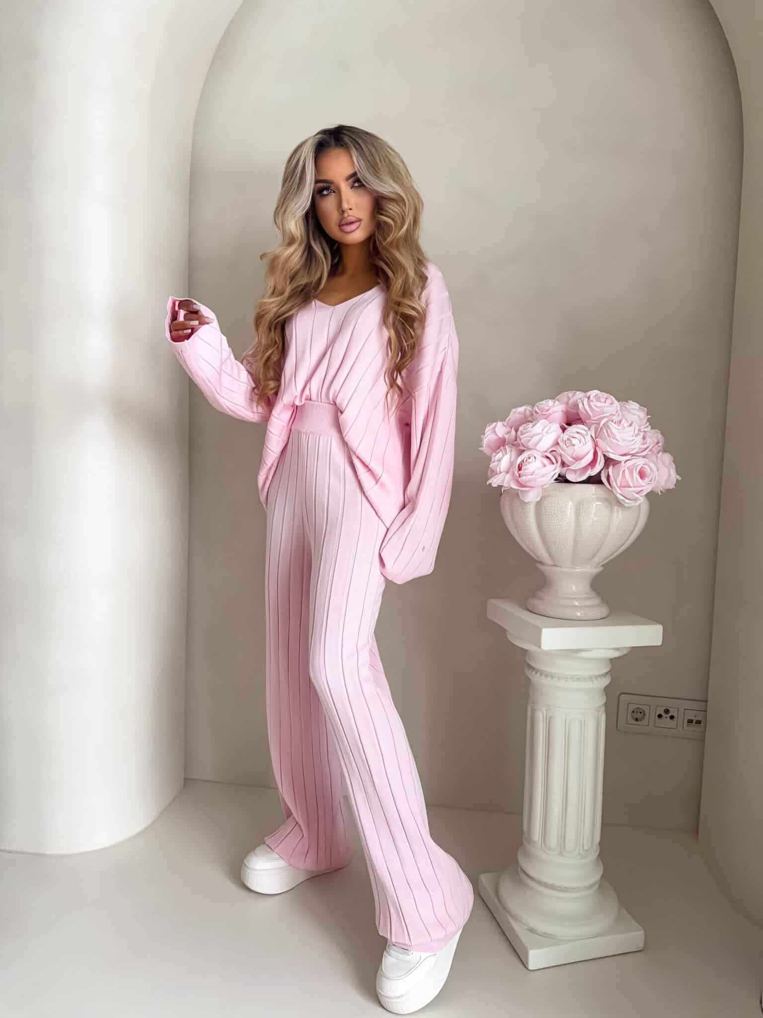 Komplet CANDICE BY ME składa się z oversize’owego swetra z długimi rękawami oraz spodni z wysokim stanem, uszytych z tej samej, przyjemnej w dotyku dzianiny. Sweter zakładany przez głowę, z dekoltem w serek, zdobią ozdobne pionowe przeszycia, które optycznie wydłużają sylwetkę i dodają całości subtelnej elegancji. Szerokie nogawki spodni oraz ich pionowy wzór doskonale współgrają z górą, tworząc spójną, harmonijną stylizację idealną zarówno na co dzień, jak i na bardziej casualowe wyjścia.