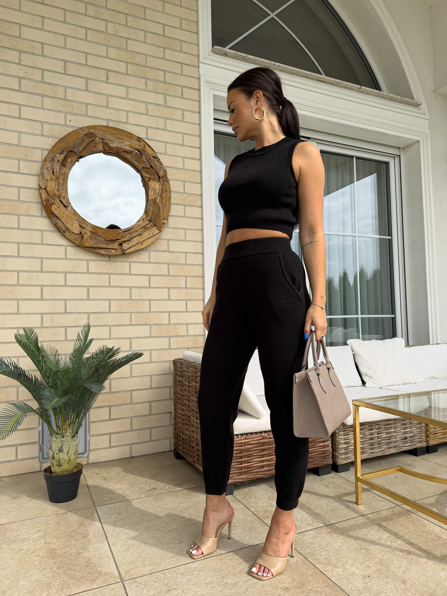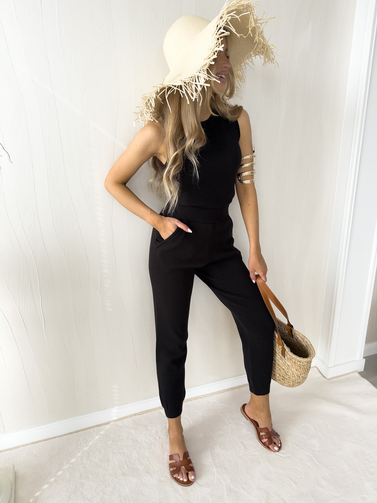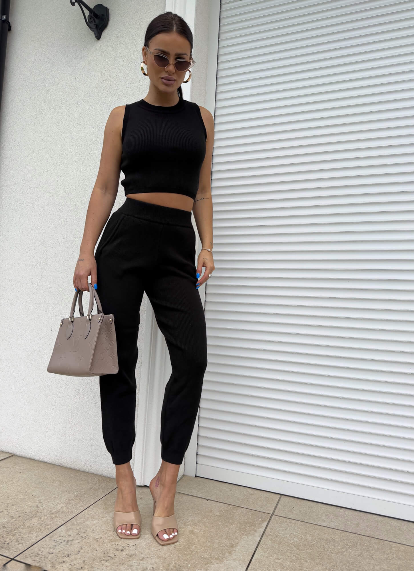Komplet składający się z krótkiego topu bez rękawów oraz długich spodni z gumką w pasie.