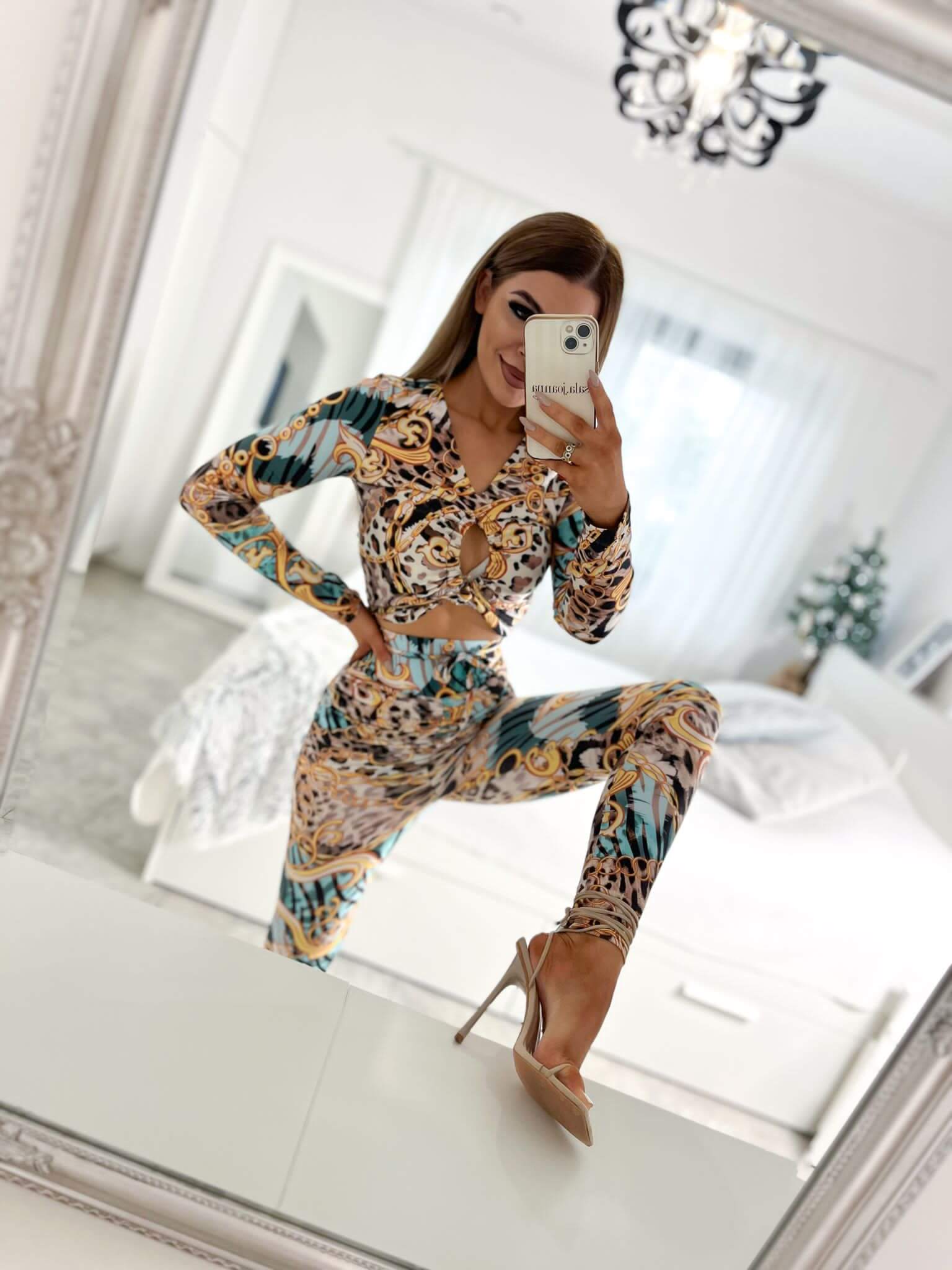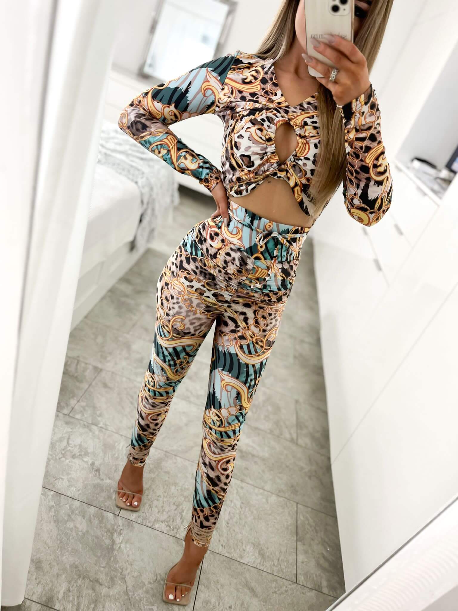 Przepiękny komplet Emma w oryginalny print. Komplet składa się z topu wiązanego dowolnie wokół talii lub na szyi oraz legginsów marszczonych z wysokim stanem. Wykonany z lycry, która idealnie dopasuje się do Twojego ciała.