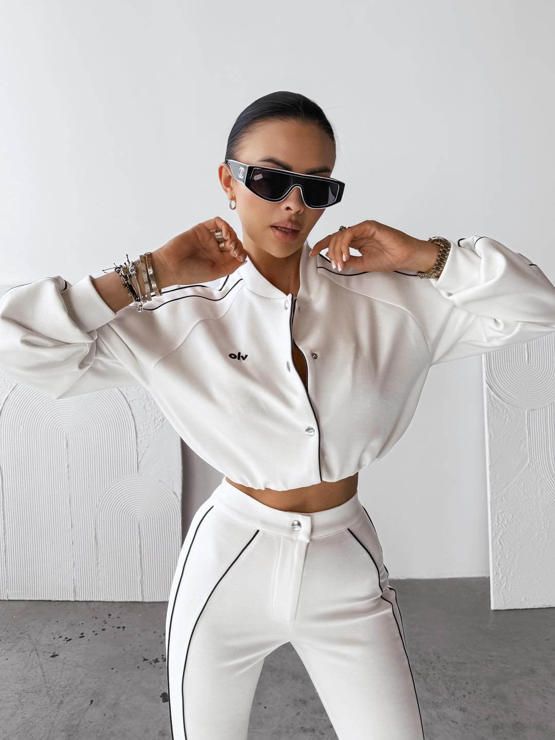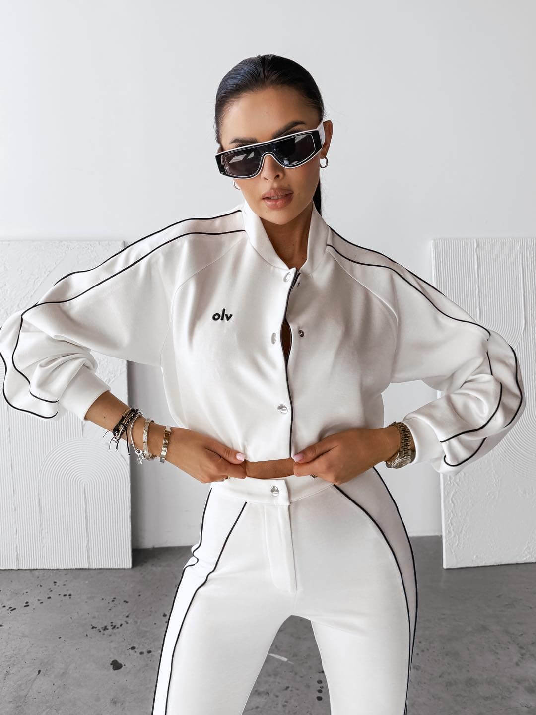 bomberka. Boki zdobią lampasy oraz haft OLV. Na przodzie haft 3D OLV. Dół – spodnie rozszerzane ku