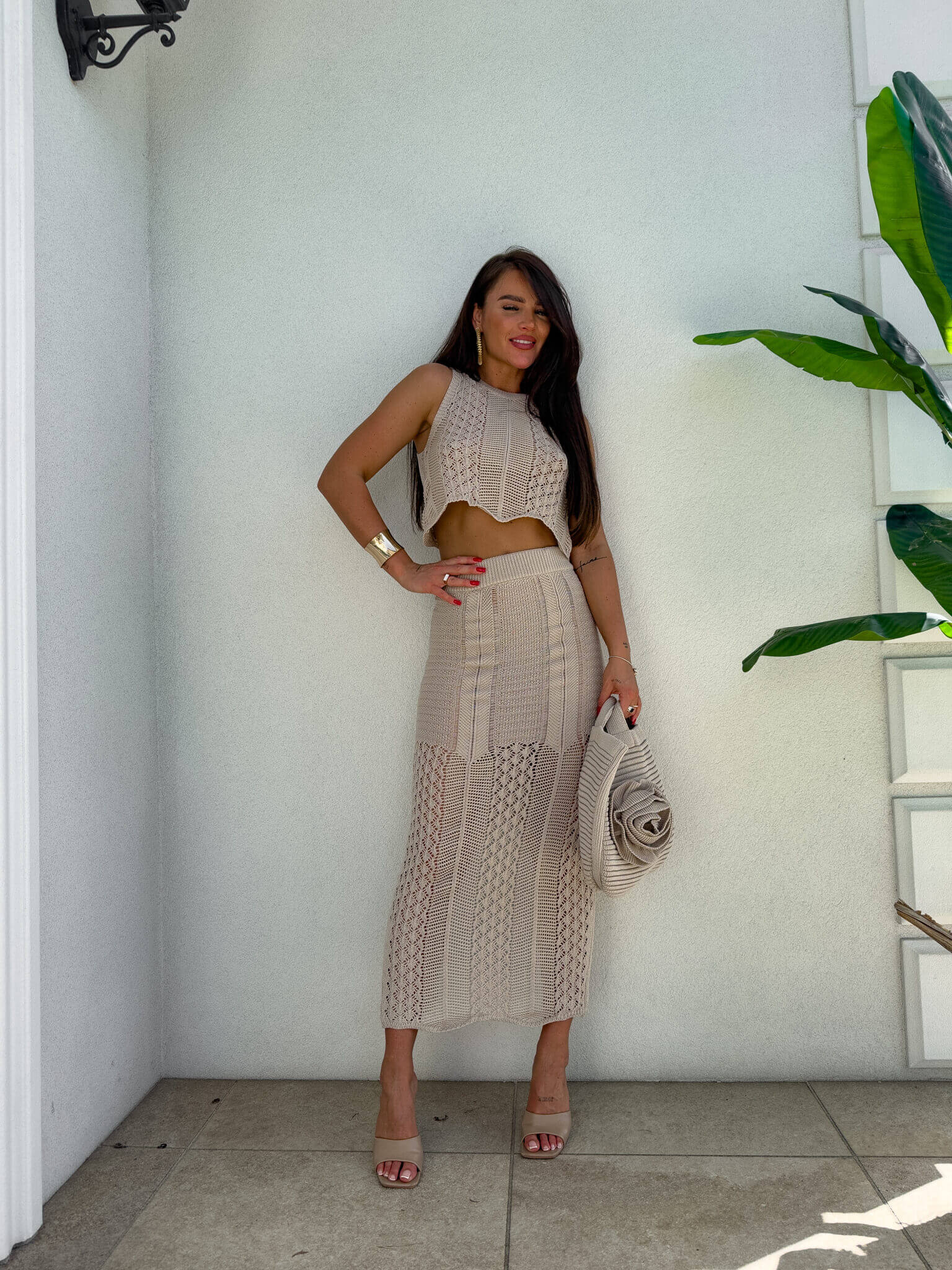 Komplet top ażurowy i spódnica z rozcięciem to idealna propozycja na letnie dni, łącząca elegancję i wygodę. Top wykonany jest z delikatnego, ażurowego materiału, który zapewnia przewiewność i lekkość. Spódnica maxi ma długość sięgającą do ziemi, z rozcięciem, które dodaje jej zmysłowości i lekkości. Gumka w pasie zapewnia wygodne dopasowanie i komfort noszenia. To doskonały wybór na wieczorne wyjścia, wakacyjne spacery czy spotkania z przyjaciółmi.Skład: 100% bawełna