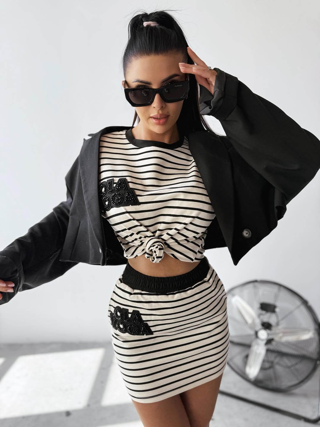 Casualowy komplet damski OLV, wykonany z wysokiej jakości materiału z domieszką wiskozy. Góra – kamizelka zakończona kontrastową lamówką. Na przodzie obszerne logo marki OLAVOGA zdobione kryształkami. Dół – spódnico-spodenki z gumą w talii. Po bokach kieszenie. Cały produkt zdobią paski.