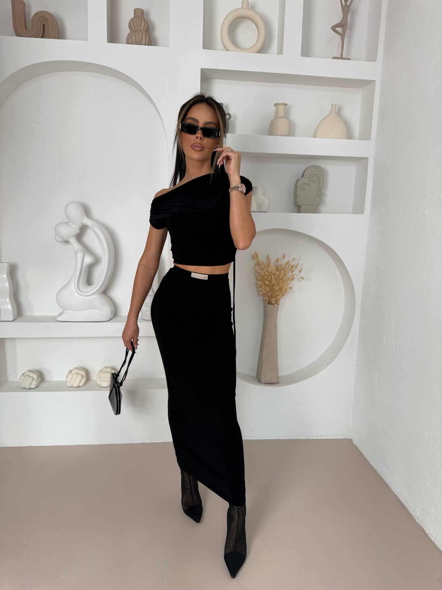 Elegancki i kobiecy zestaw NUMB LA MANUEL, który wyróżnia się subtelnym marszczeniem, które można regulować i unikalnym krojem. Spódnica maxi z delikatnym marszczeniem na biodrze dodaje lekkości i płynności ruchów, tworząc efektowną sylwetkę. Top z krótkim rękawem, asymetryczny na jedno ramię, z drugą stroną opadającą niżej, stanowi oryginalny element, który przyciąga wzrok. Ten set to doskonały wybór na wieczorne wyjście, randkę czy specjalną okazję, łącząc elegancję z modnym akcentem. Idealnie komponuje się z eleganckimi sandałkami lub szpilkami, podkreślając Twój styl i pewność siebie!