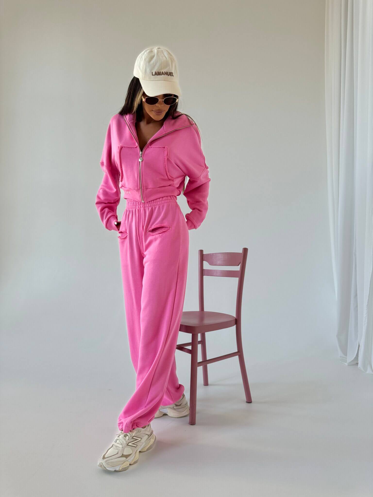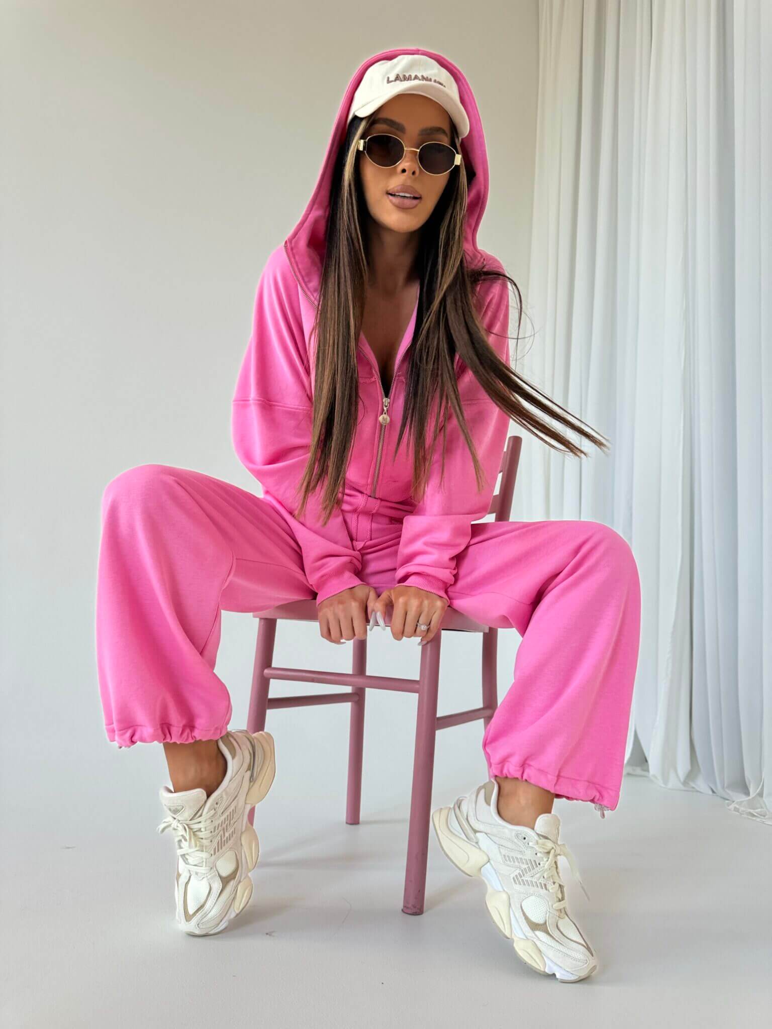 Dres damski dwuczęściowy PUSH TO LA MANUEL o modnym, wygodnym kroju, idealny na codzienne wyjścia oraz do relaksu w domu. Komplet składa się z rozpinanej bluzy z kapturem i spodni o nowoczesnym designie. Bluza wyposażona jest w wygodny zamek błyskawiczny, a także w praktyczne kieszenie po bokach, idealne na drobiazgi. Kaptur dodaje stylu i zapewnia dodatkową ochronę przed chłodem. Spodnie posiadają unikalne kieszonki na przodzie, które nadają całości wyjątkowy charakter i wyróżniają ten dres na tle innych. Wykonany z wysokiej jakości, miękkiego materiału, zapewniającego komfort i swobodę ruchów przez cały dzień.