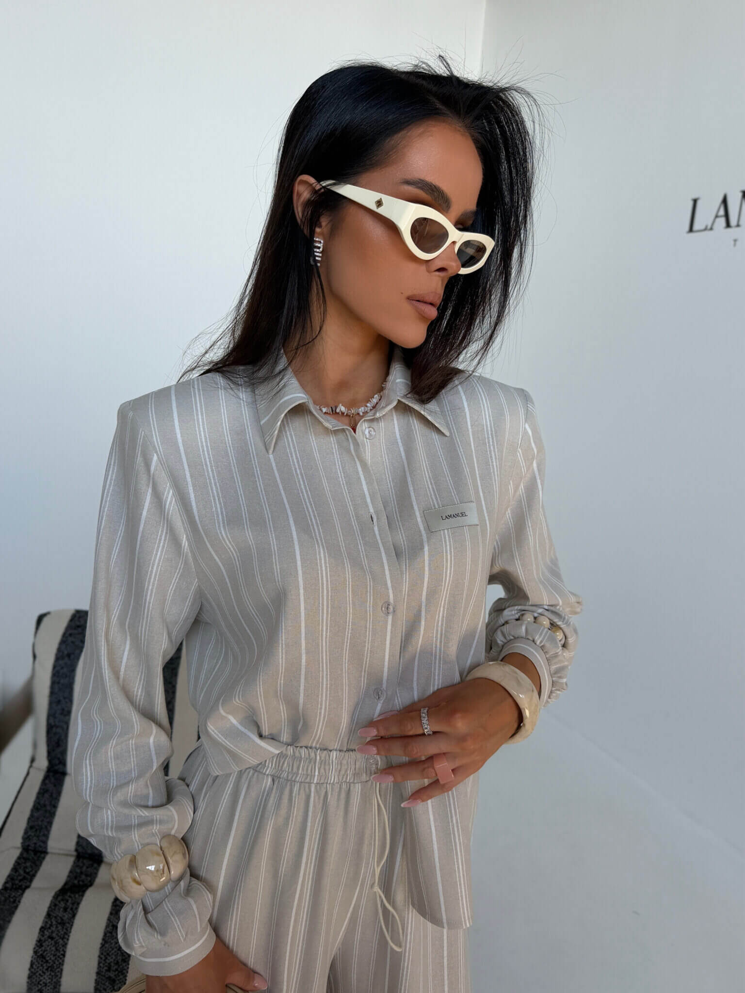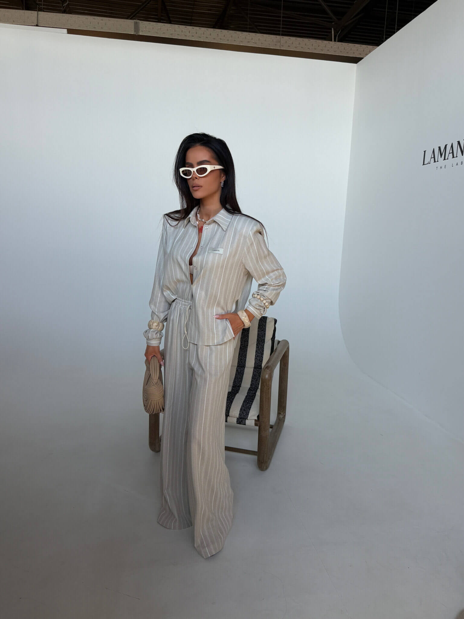 Elegancja w swobodnym wydaniu, która buduje sylwetkę już samą formą. Strukturalna góra z wyraźnie zaznaczoną linią ramion nadaje całości charakteru i pewności siebie. Koszula o dopracowanym kroju idealnie współgra ze spodniami z wysokim stanem, tworząc proporcje, które wydłużają i wysmuklają sylwetkę. Naturalna tkanina na bazie wiskozy, bawełny i lnu zapewnia lekkość oraz komfort noszenia nawet w cieplejsze dni. Subtelny wzór w pionowe pasy dodaje elegancji, a jednocześnie zachowuje nowoczesny, niewymuszony styl. Komplet, który sprawdzi się zarówno w codziennym ruchu, jak i w bardziej dopracowanych stylizacjach.