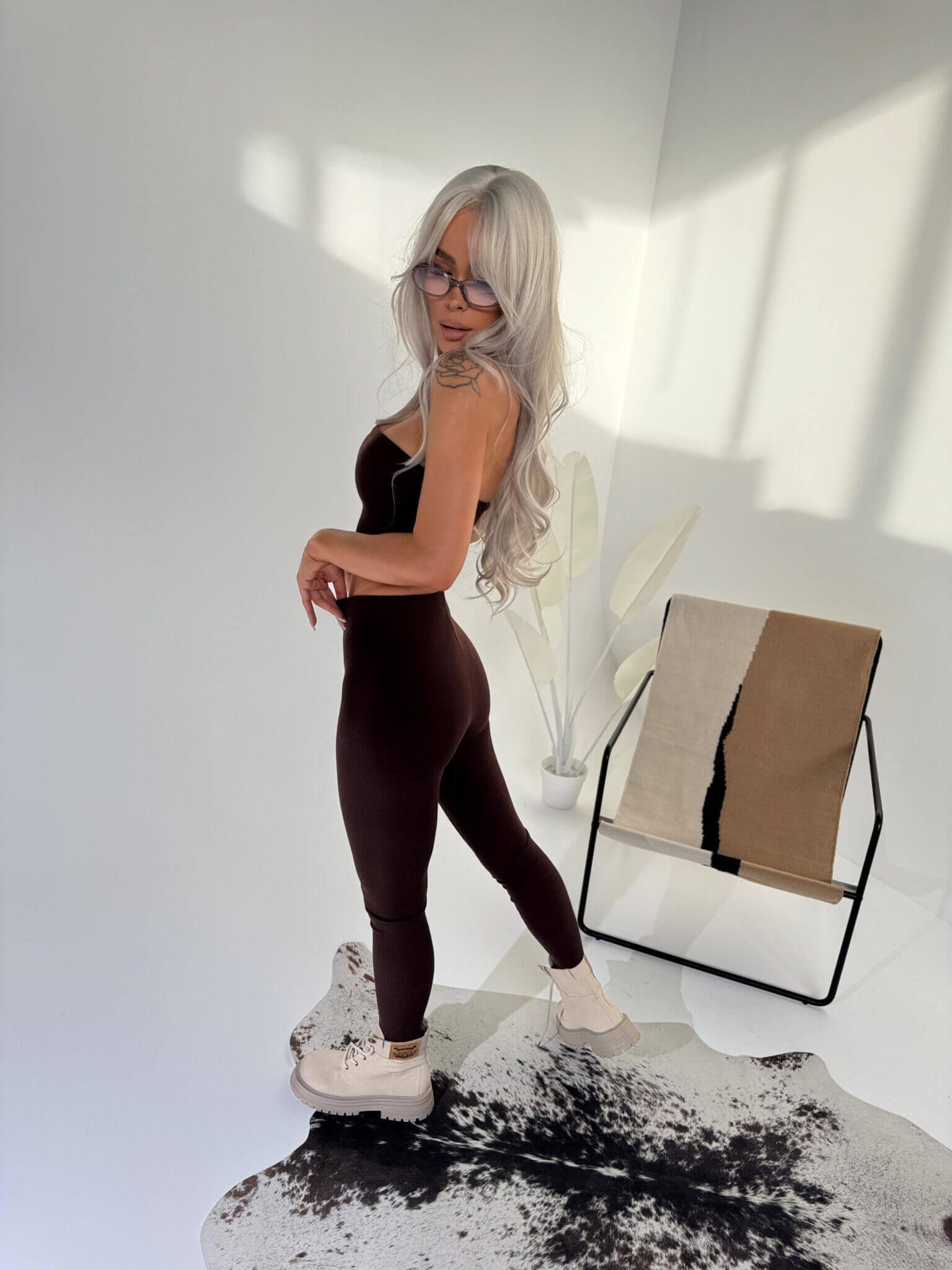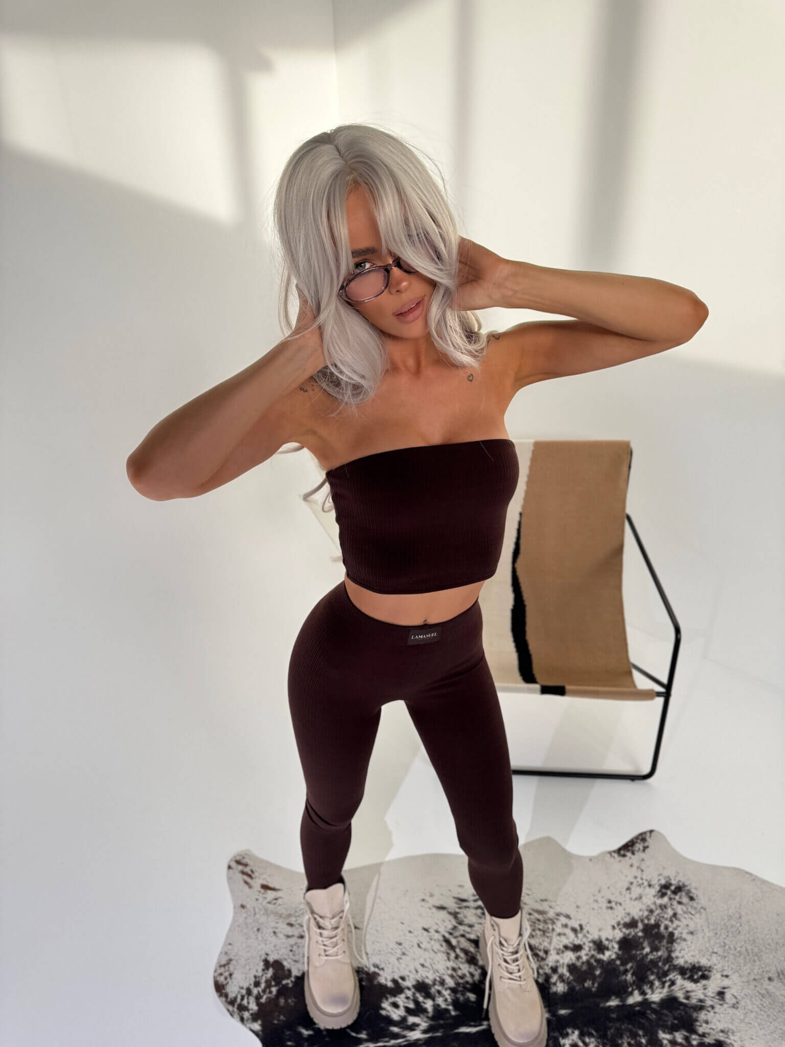 Komplet SEPARATE LAMANUEL z prążkowanej dzianiny, który łączy wygodę z dopracowaną prostotą. Top bez ramiączek i legginsy z wysokim stanem tworzą zestaw, który idealnie układa się na sylwetce i sprawdza się zarówno w domu, jak i poza nim. Elastyczny materiał pracuje z ciałem, a minimalistyczne metki z logo dodają całości spójności i charakteru. Nonszalancki, ale przemyślany – dokładnie taki, jak lubimy.