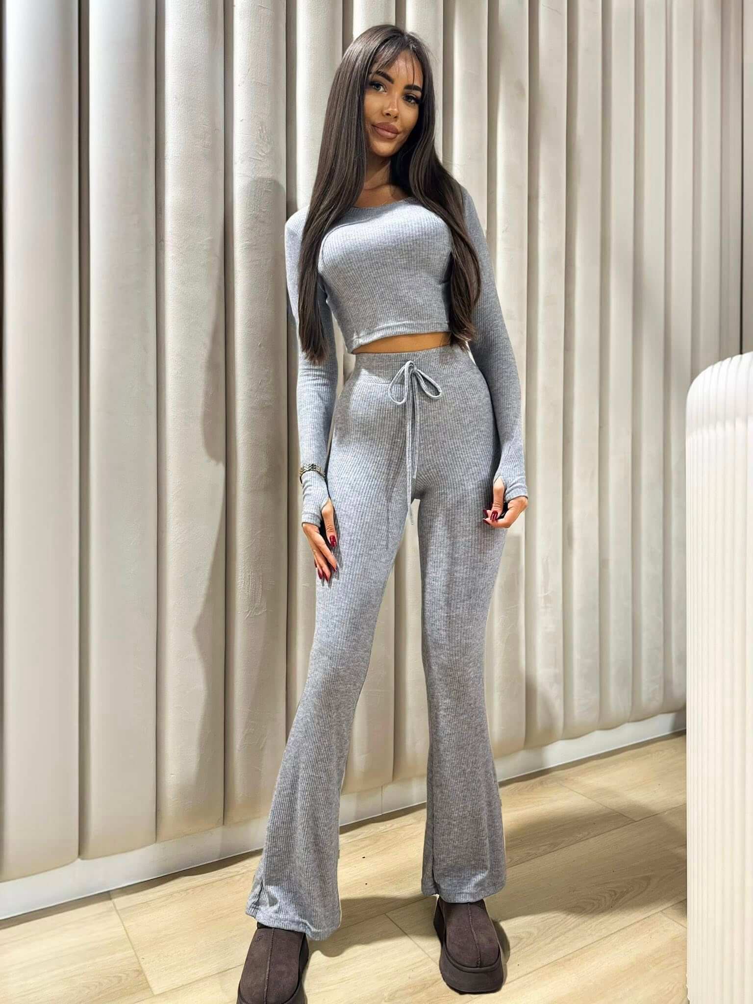 Komplet który idealnie sprawdzi się na każdy jesienny dzień! Top z długim rękawem w zestawie ze spodniami z bardzo wysokim stanem i prostą nogawka! Całość wykonana z bardzo elastycznego materiału dzianinowego.