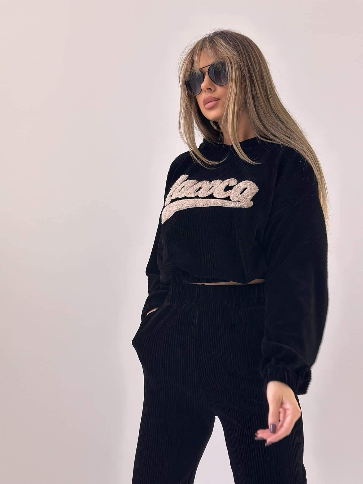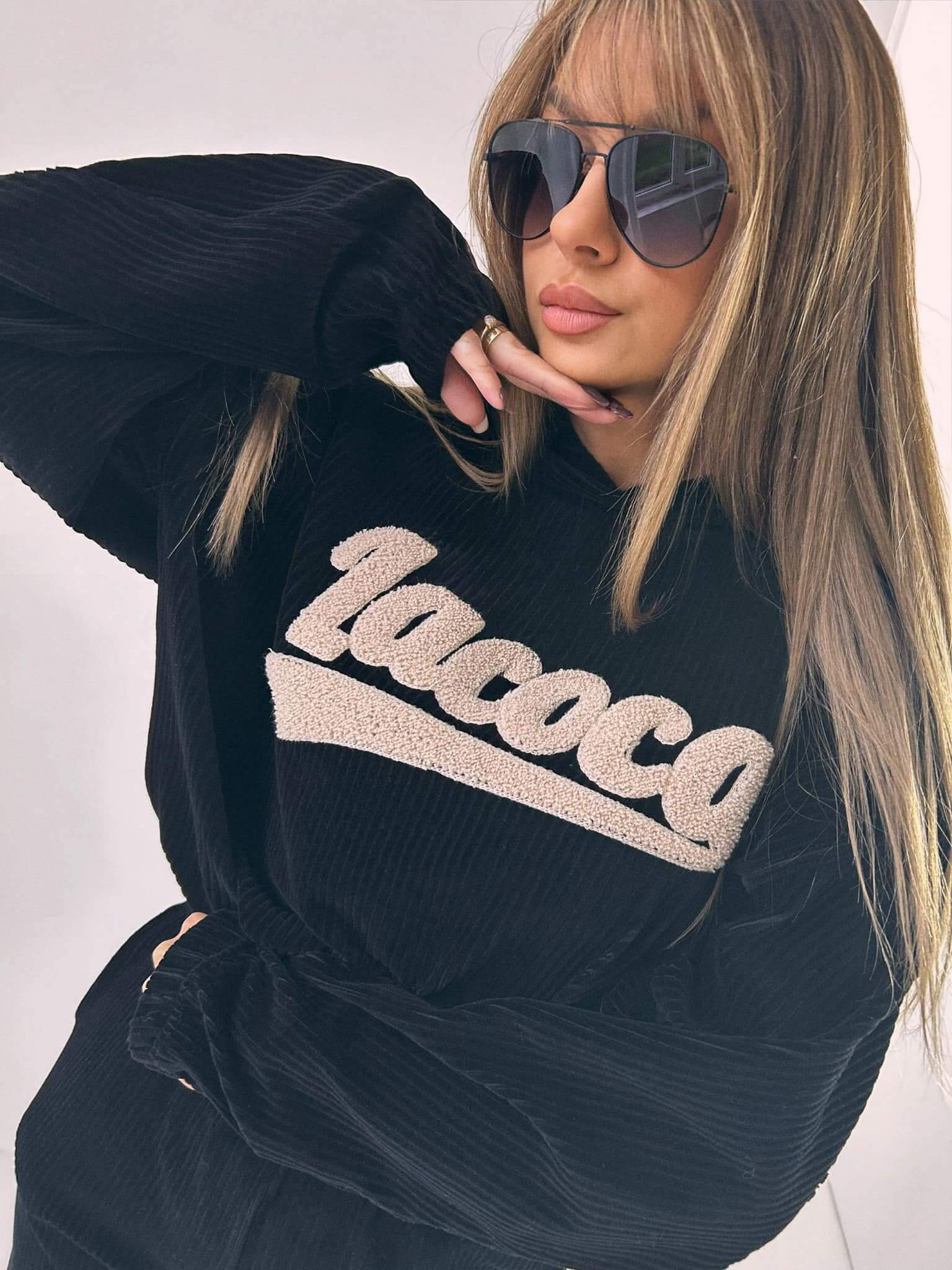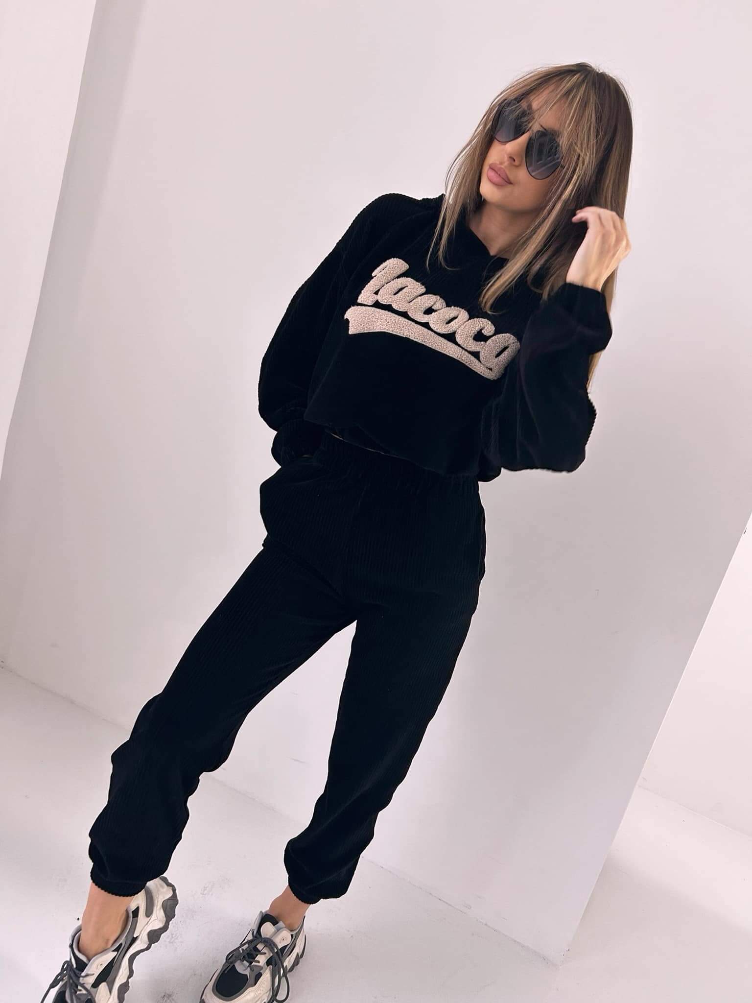 Wyjątkowy komplet SHEN LA COCA uszyty z najwyższej jakości weluru bawełnianego. Przód bluzy zdobiony haftem wykonanym metodą włóczki.