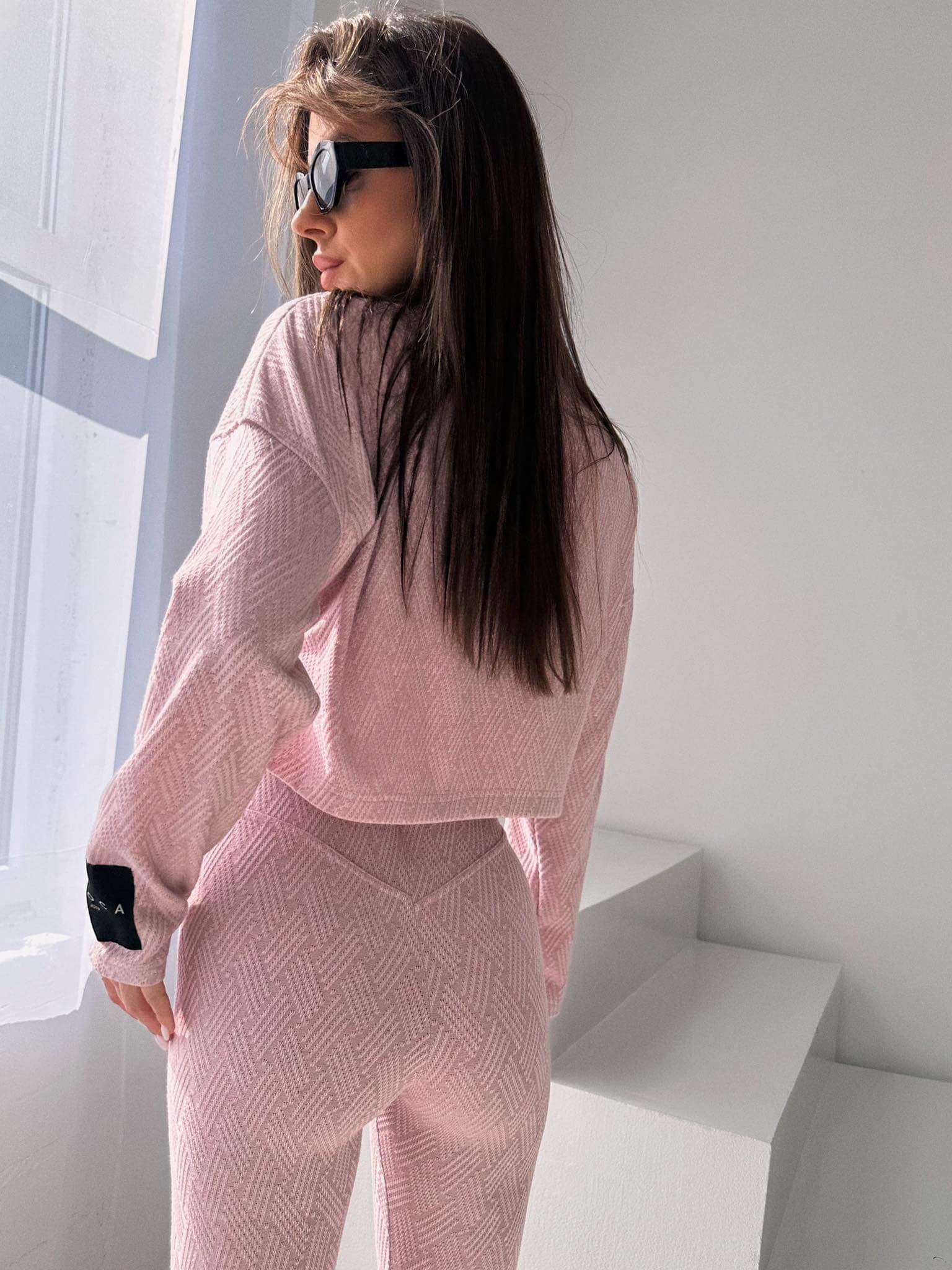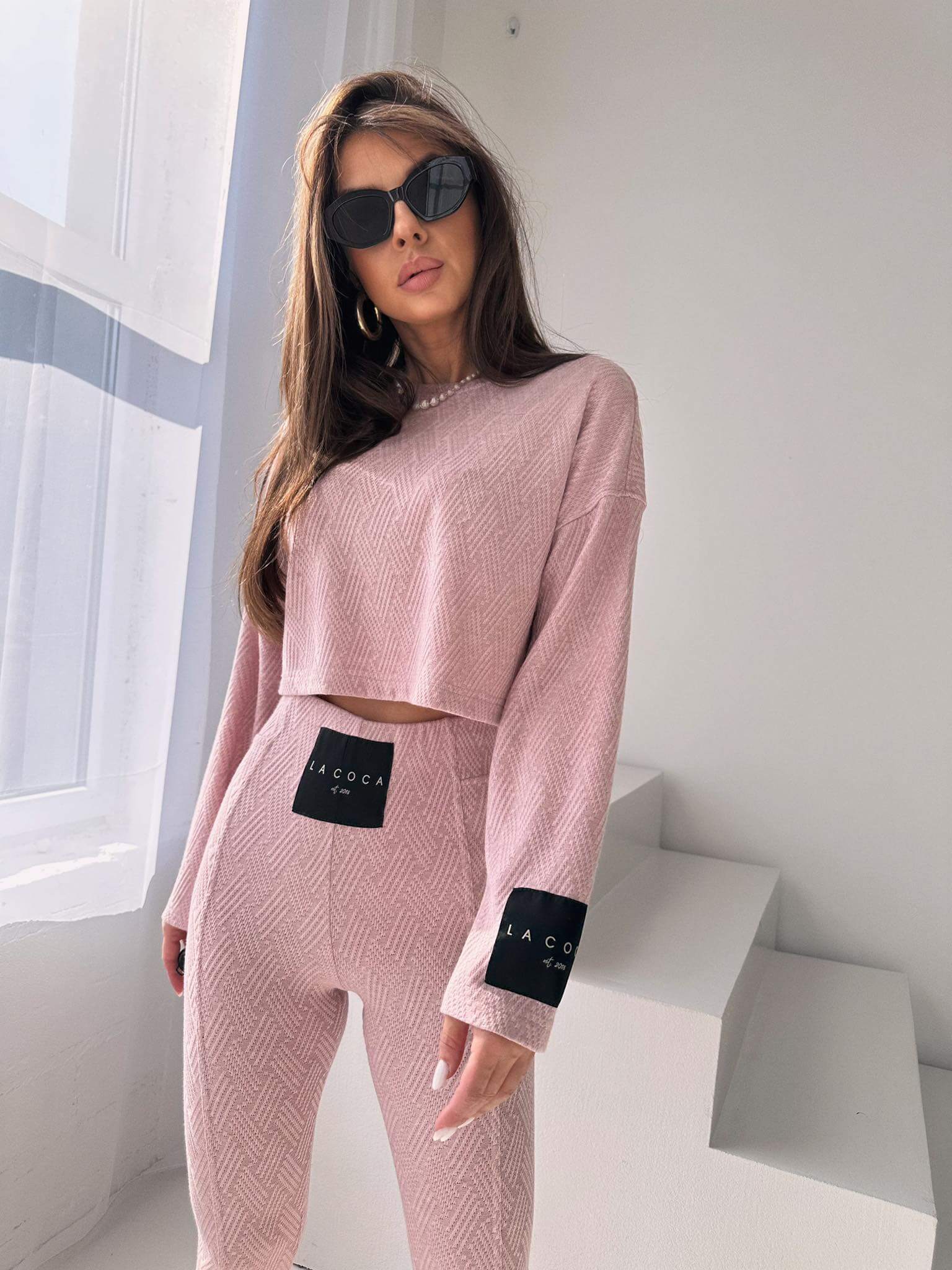Wykonany ze sweterkowej dzianiny o fakturze jodełki . Na spodniach i rękawie bluzki naszyta metka z nazwą marki.