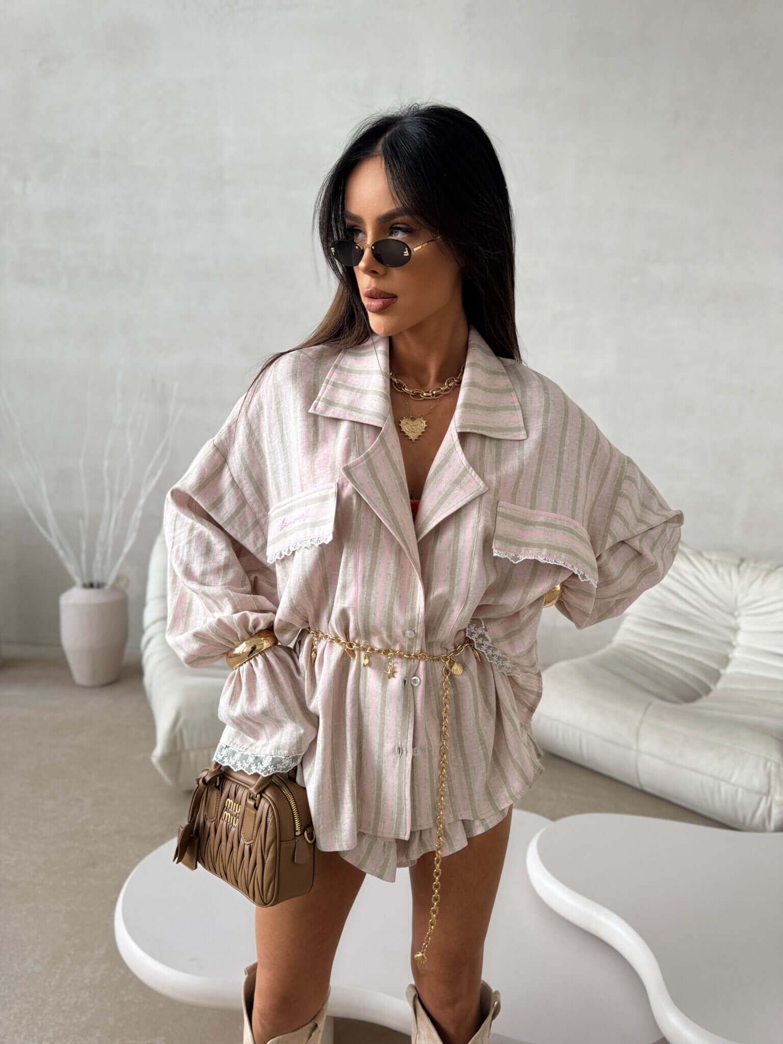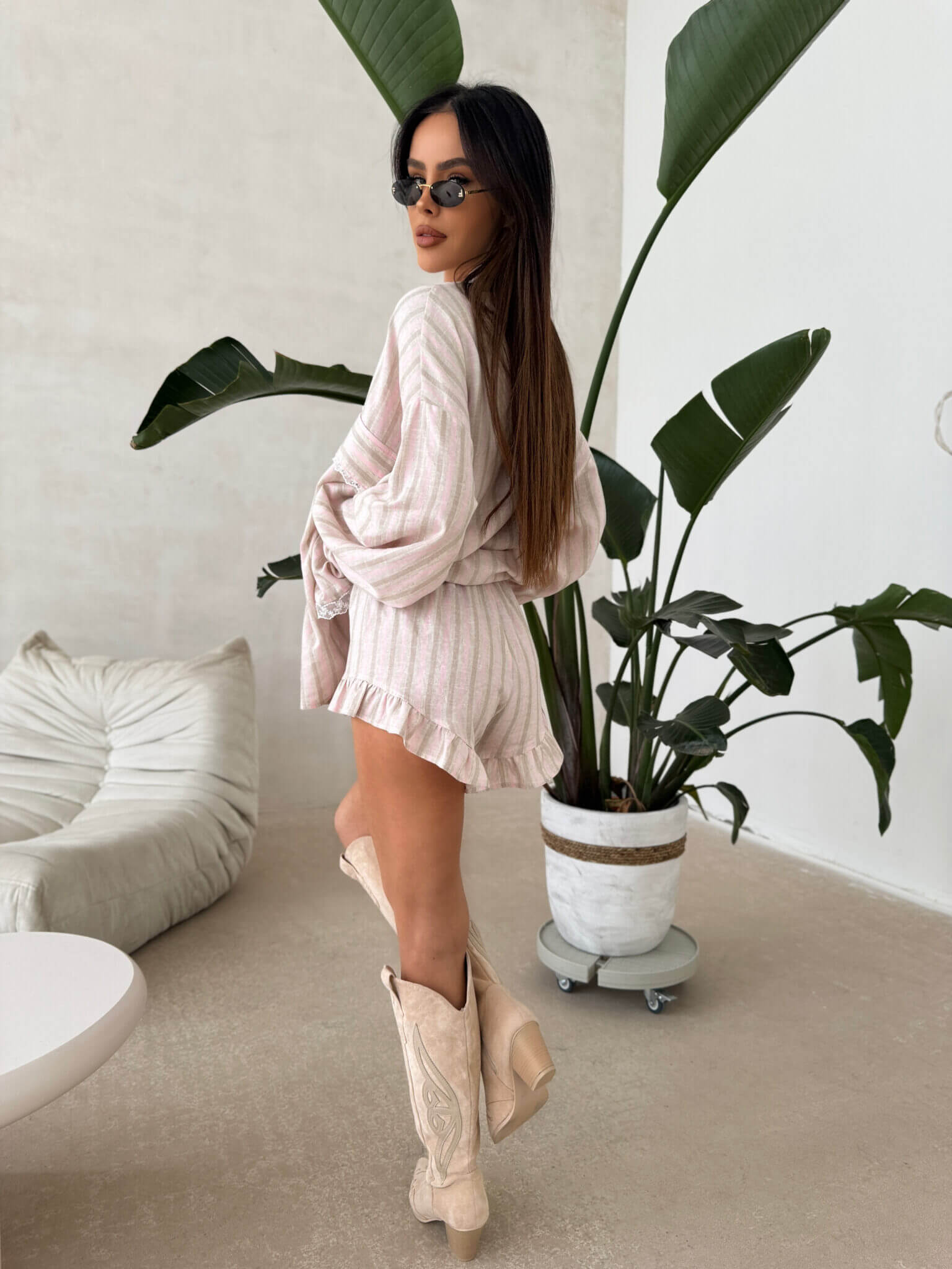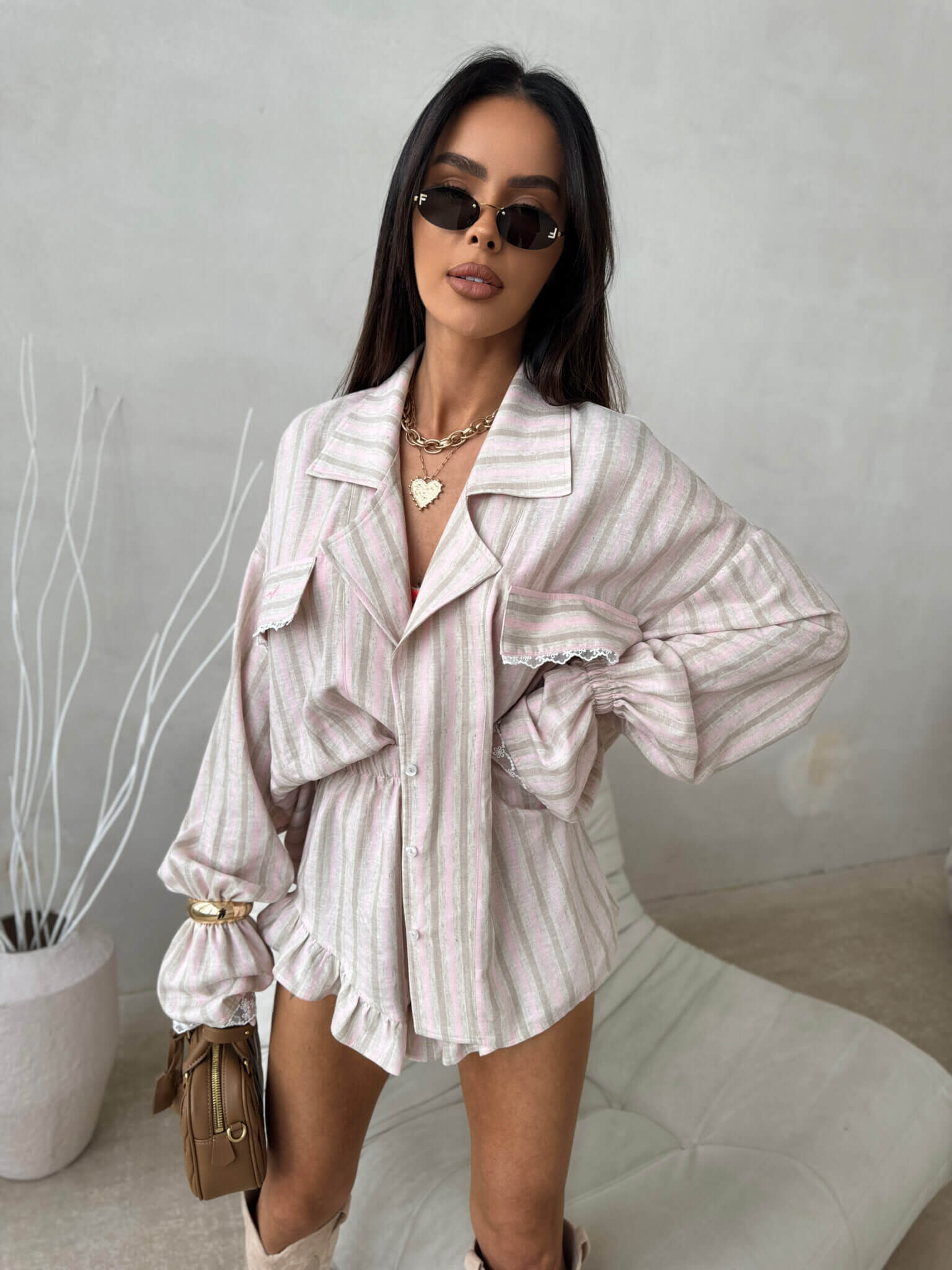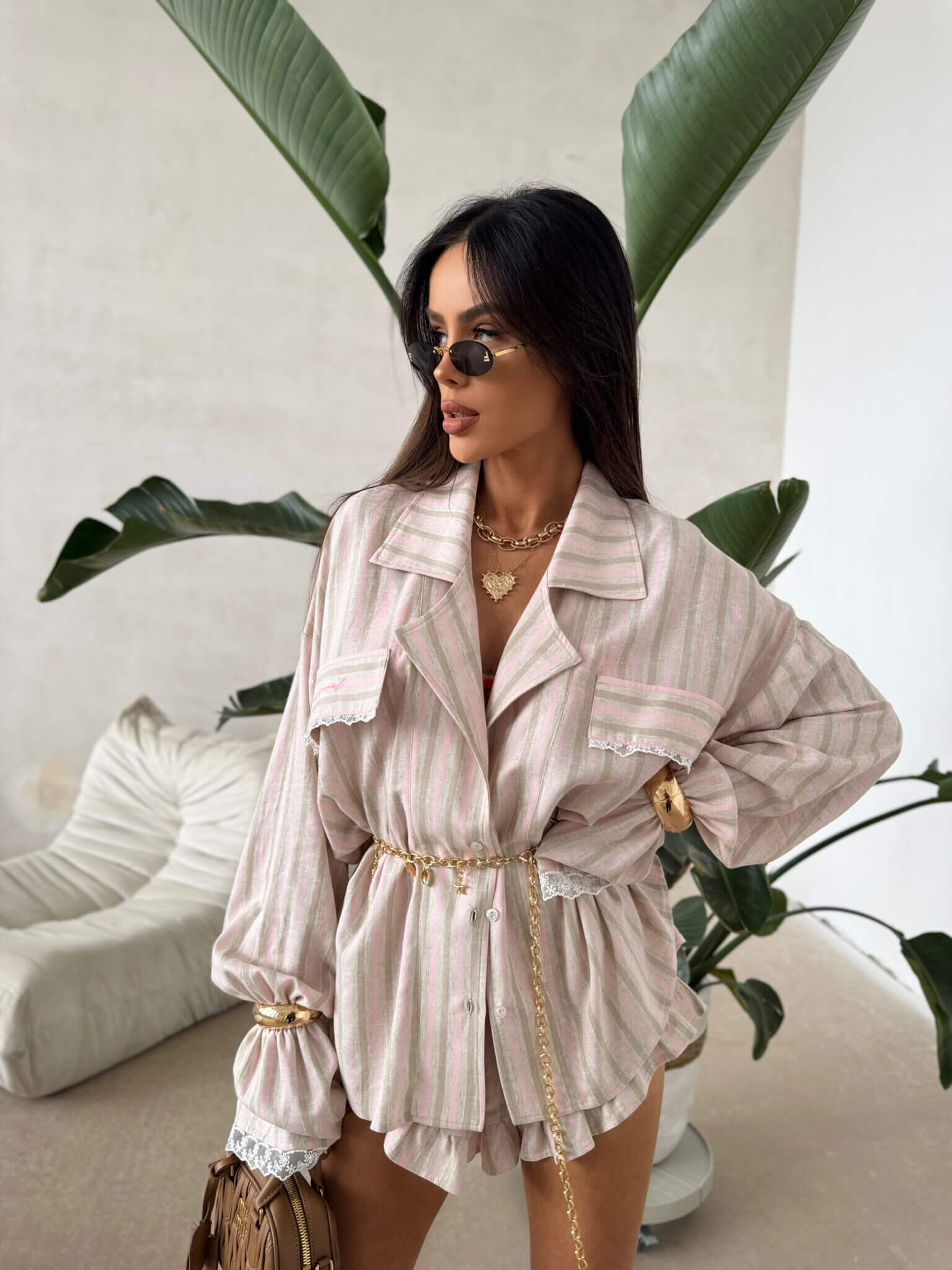 Ten komplet SUMMER LAMANUEL to idealna propozycja na lato – lekki, przewiewny i bardzo stylowy. Składa się z koszuli oraz pasujących do niej szortów, które razem tworzą spójną i romantyczną stylizację w klimacie boho i vintage. Koszula ma luźny, oversize’owy krój z dłuższym tyłem, co nadaje jej swobodnego, nonszalanckiego charakteru. Wykonana jest z lekkiej, lnianej mieszanki, która świetnie sprawdza się w ciepłe dni. Uwagę przyciąga wzór – delikatne pionowe paski w stonowanych, naturalnych odcieniach, które nadają całości świeżości i lekkości. Szorty z wysokim stanem i elastyczną gumką w pasie, co zapewnia wygodę noszenia. Są luźne, nieopinające, dzięki czemu świetnie układają się na sylwetce. Ich dół wykończony został falbaną, nawiązującą do rękawów koszuli. Pasuje zarówno do kowbojek, sandałów, jak i sneakersów, a dodatki takie jak wiklinowy koszyk czy mini torebka będą jego idealnym uzupełnieniem.