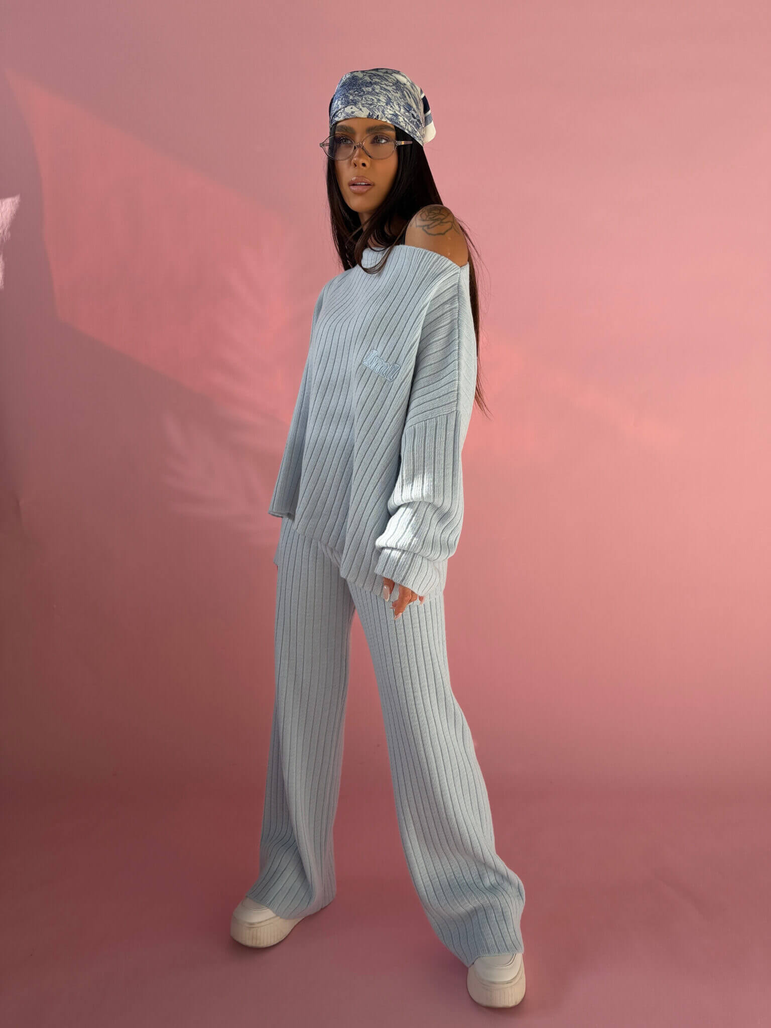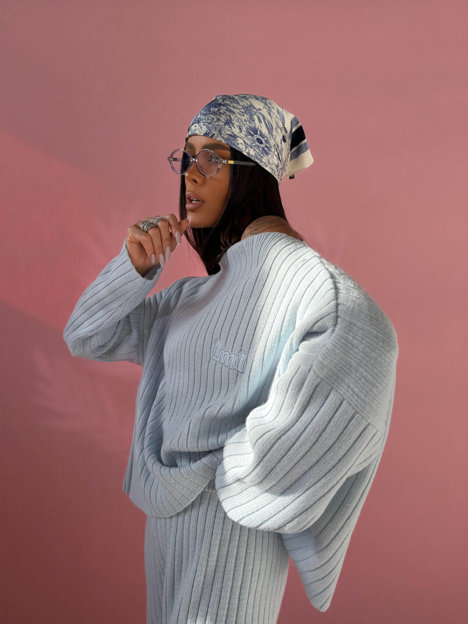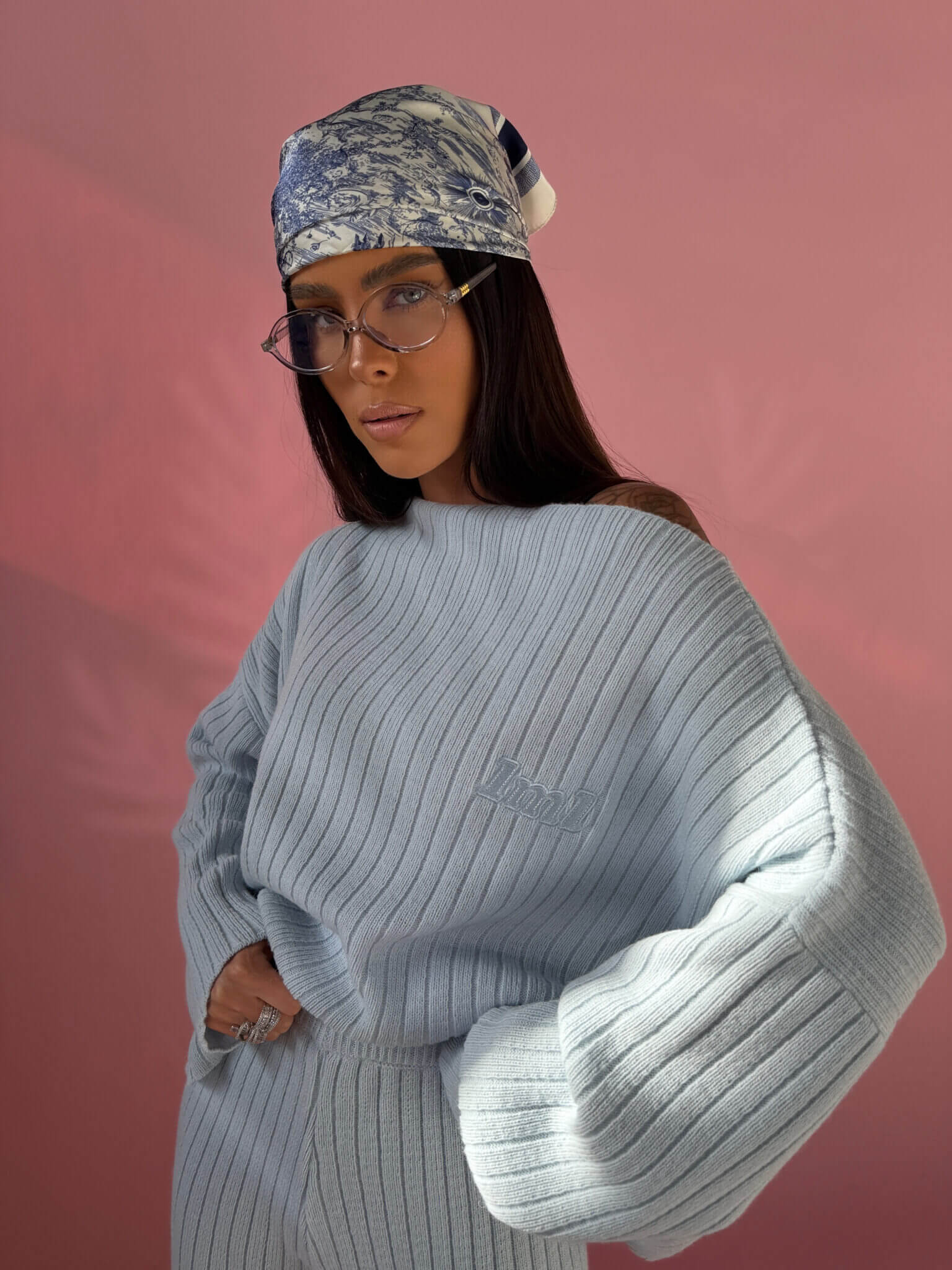 Nasz kultowy komplet wraca w nowych kolorach i z nowym haftem. Charakterystyczna prążkowana struktura pięknie buduje sylwetkę i nadaje całości wyrazistości. Dzianina jest miękka, sprężysta i otulająca, wygląda szlachetnie i trzyma formę. Sweter ma szeroką, mocną linię z obszernymi rękawami, które nadają mu modowego charakteru. Spodnie z wysokim stanem i prostą nogawką wydłużają proporcje i podkreślają talię. To model, który daje mocny, elegancki efekt bez przesady i dokładnie za to go kochacie.