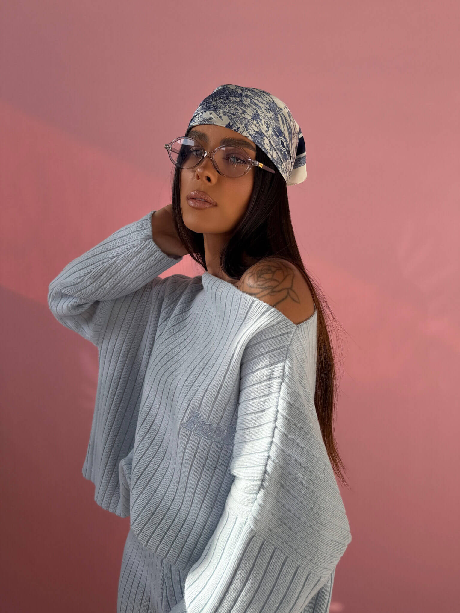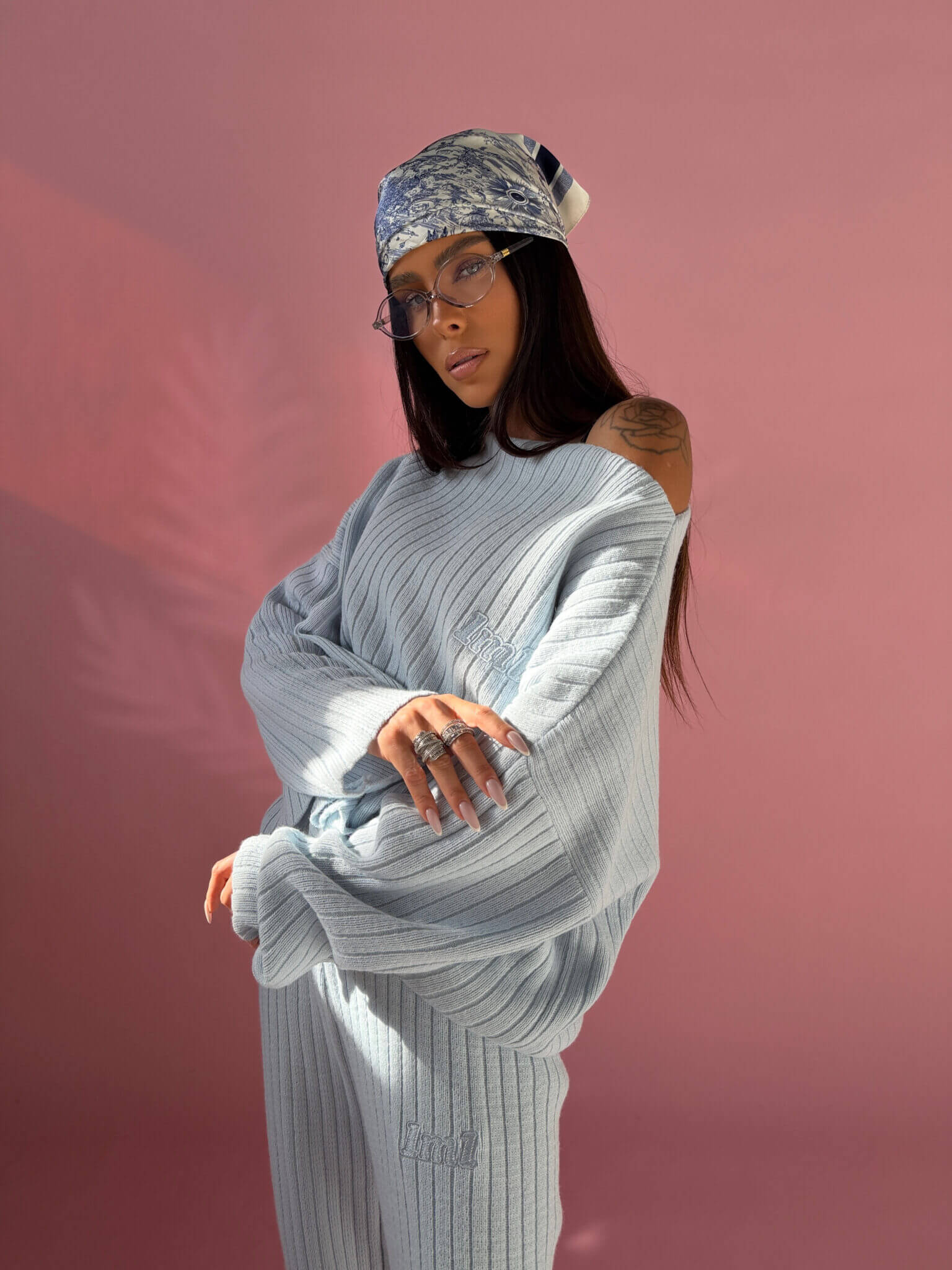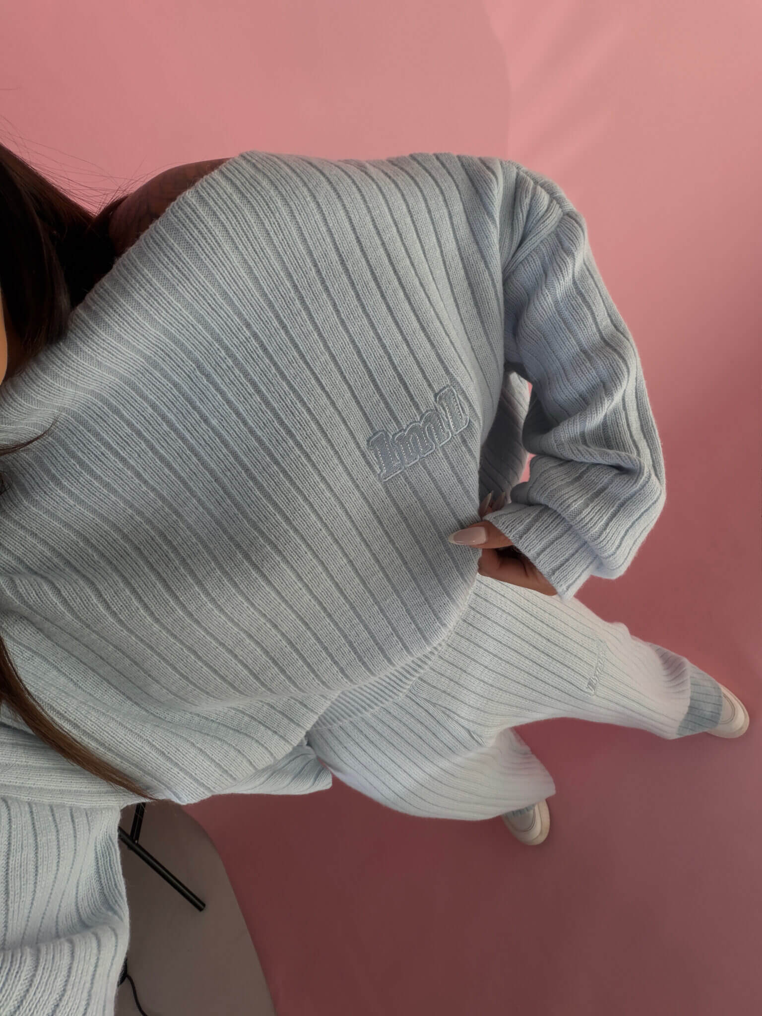 Nasz kultowy komplet wraca w nowych kolorach i z nowym haftem. Charakterystyczna prążkowana struktura pięknie buduje sylwetkę i nadaje całości wyrazistości. Dzianina jest miękka, sprężysta i otulająca, wygląda szlachetnie i trzyma formę. Sweter ma szeroką, mocną linię z obszernymi rękawami, które nadają mu modowego charakteru. Spodnie z wysokim stanem i prostą nogawką wydłużają proporcje i podkreślają talię. To model, który daje mocny, elegancki efekt bez przesady i dokładnie za to go kochacie.