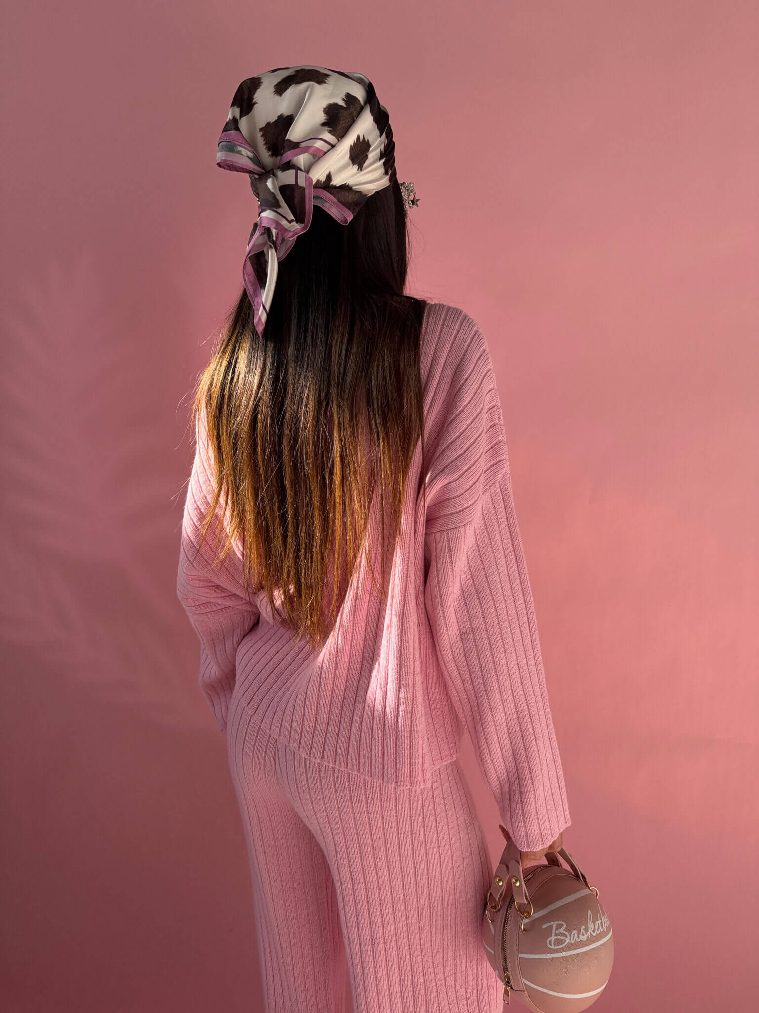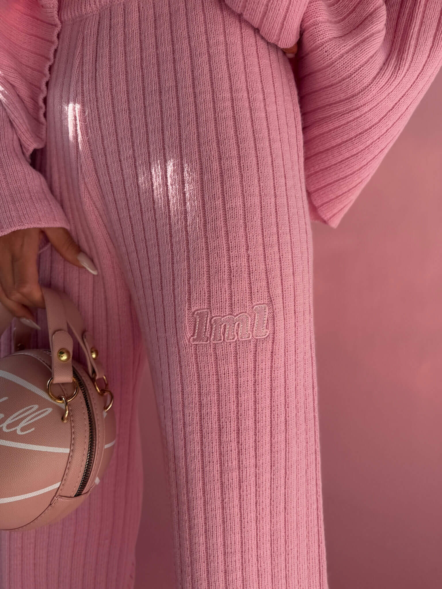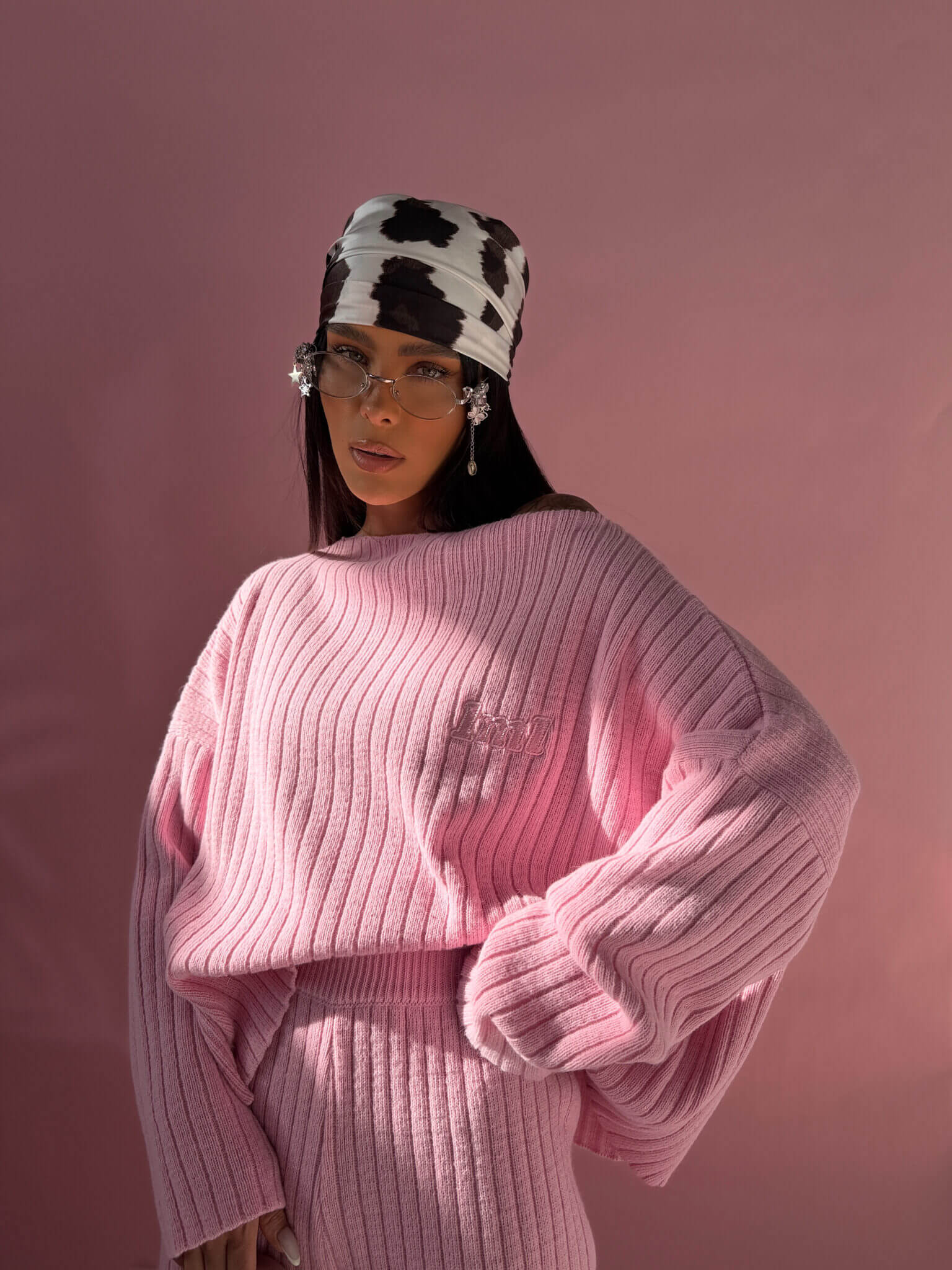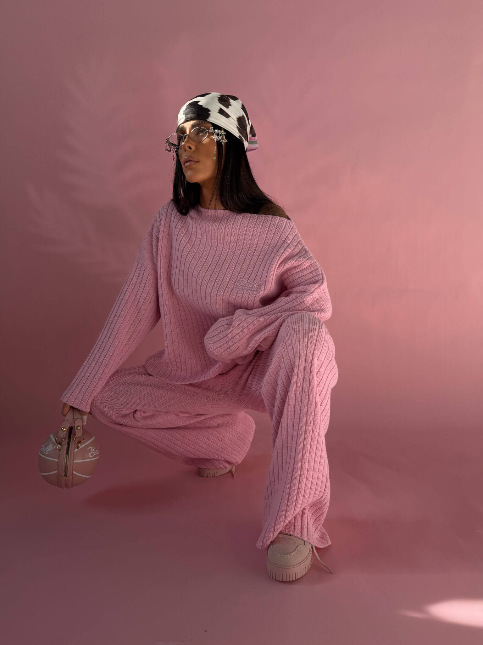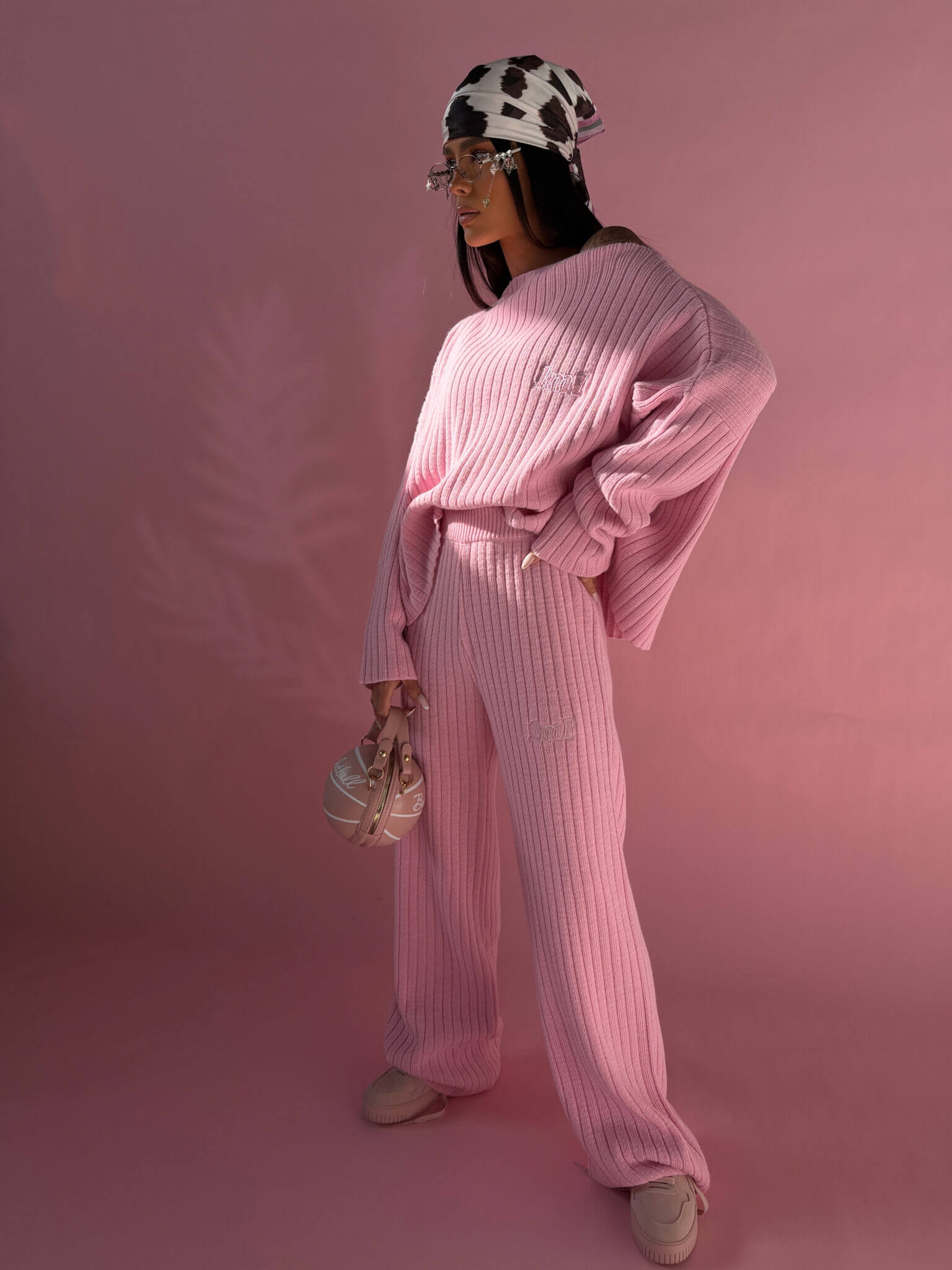 Nasz kultowy komplet wraca w nowych kolorach i z nowym haftem. Charakterystyczna prążkowana struktura pięknie buduje sylwetkę i nadaje całości wyrazistości. Dzianina jest miękka, sprężysta i otulająca, wygląda szlachetnie i trzyma formę. Sweter ma szeroką, mocną linię z obszernymi rękawami, które nadają mu modowego charakteru. Spodnie z wysokim stanem i prostą nogawką wydłużają proporcje i podkreślają talię. To model, który daje mocny, elegancki efekt bez przesady i dokładnie za to go kochacie.