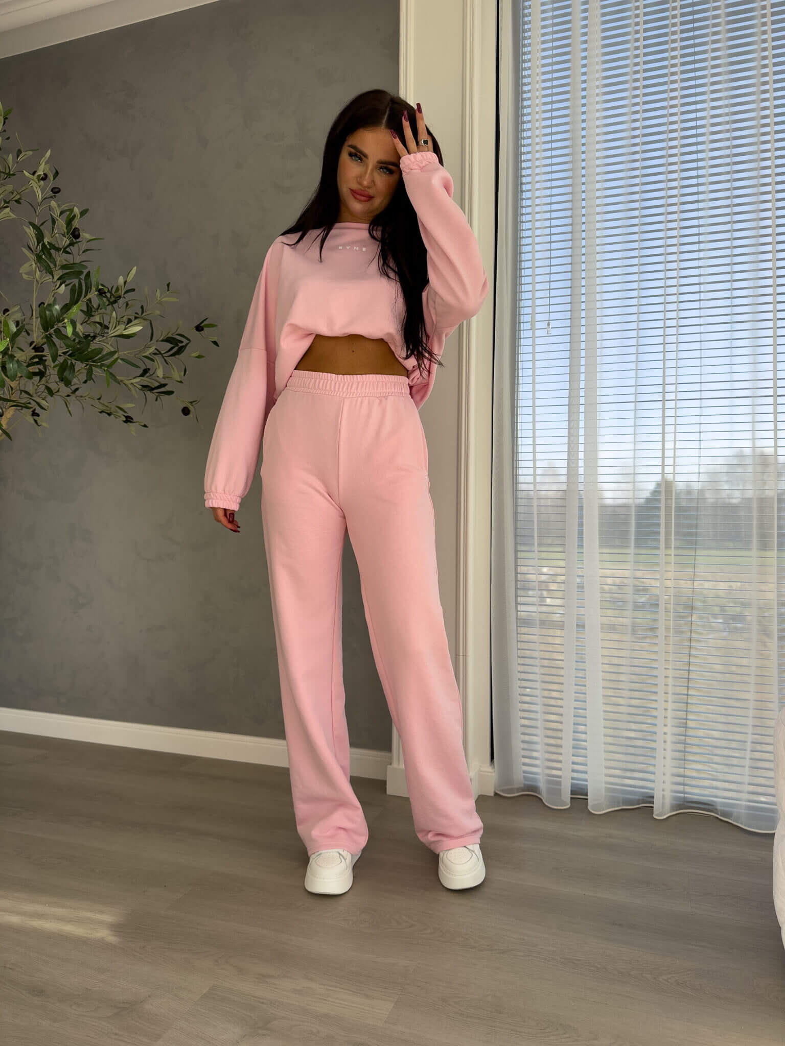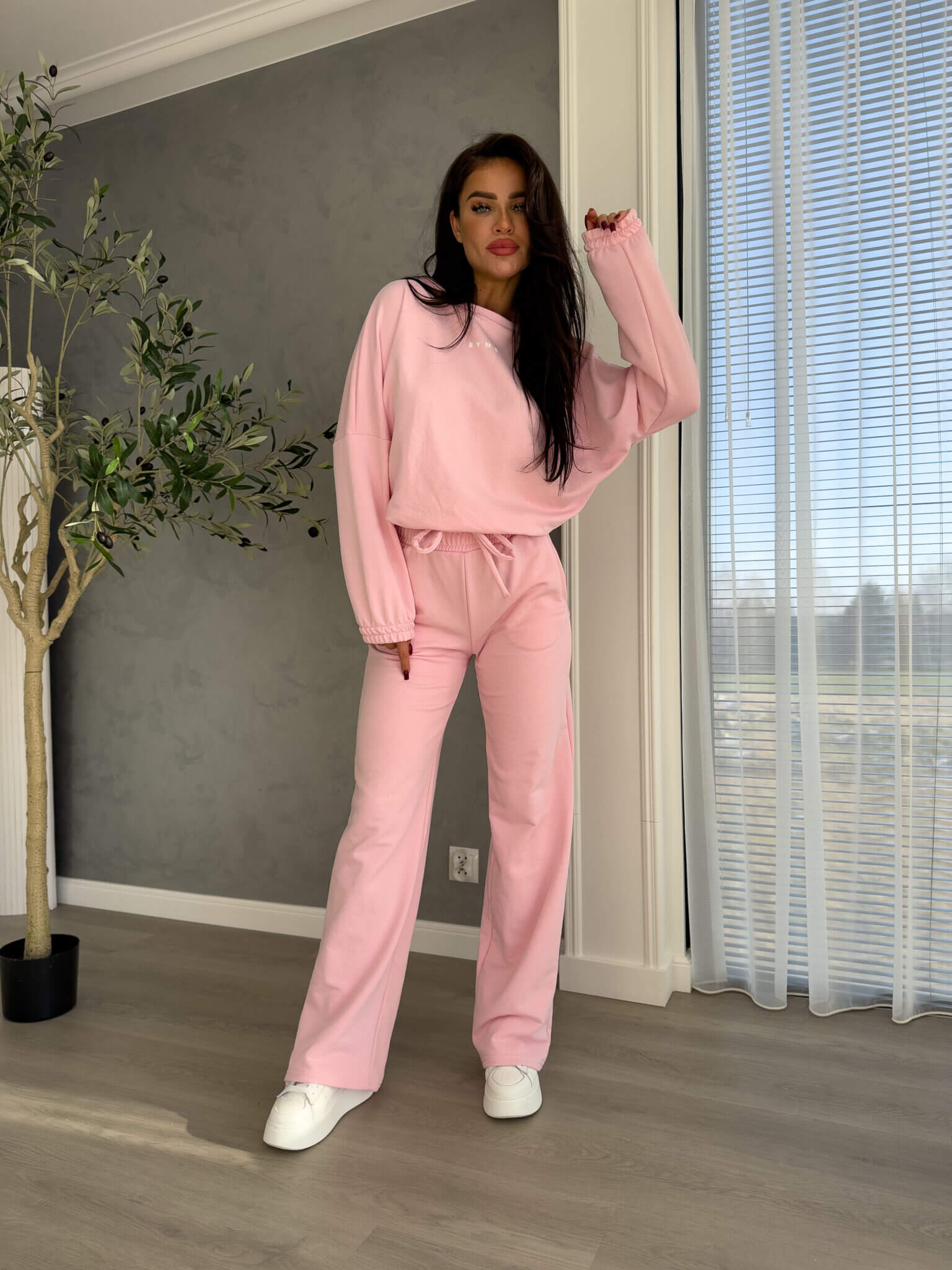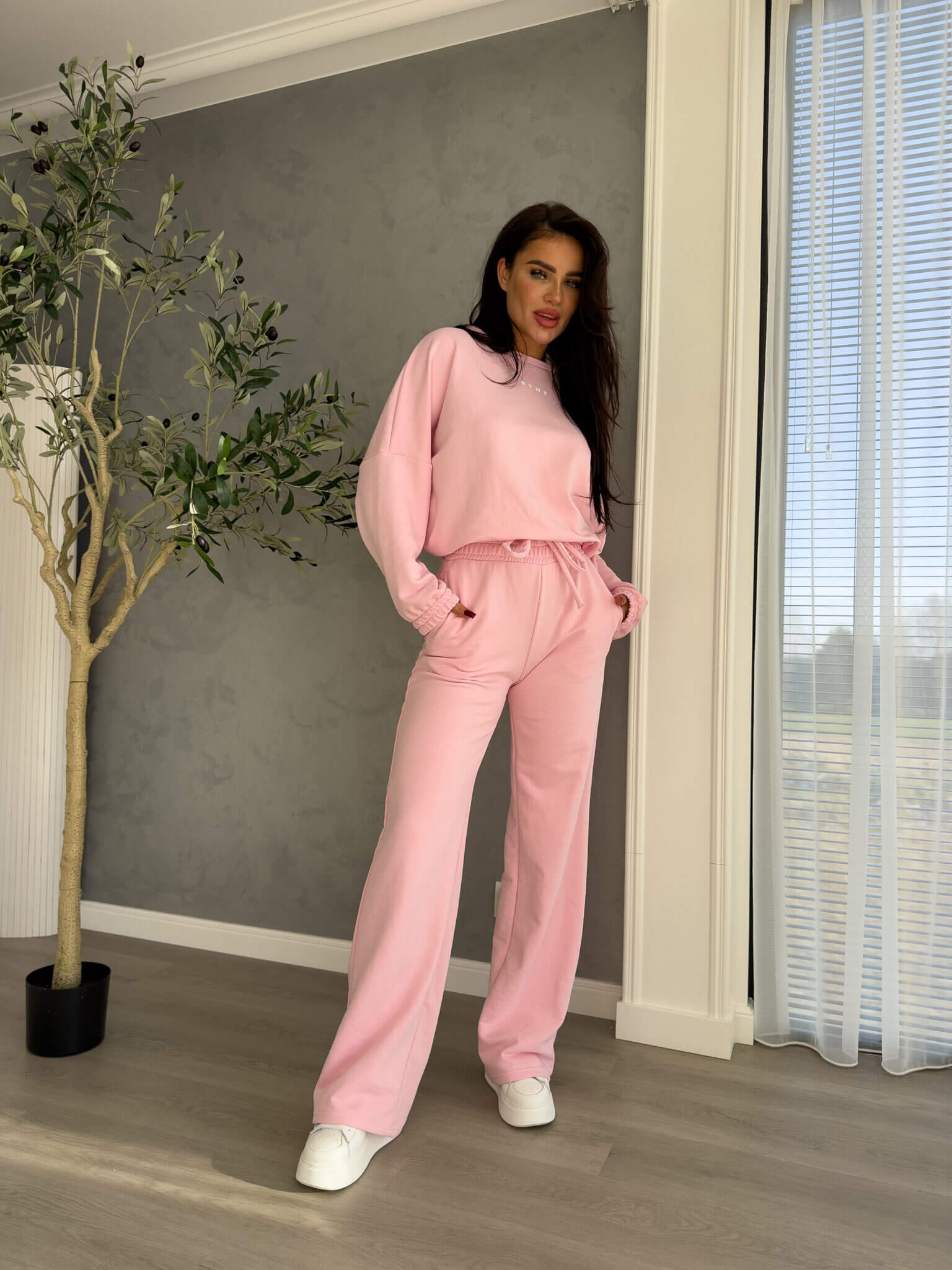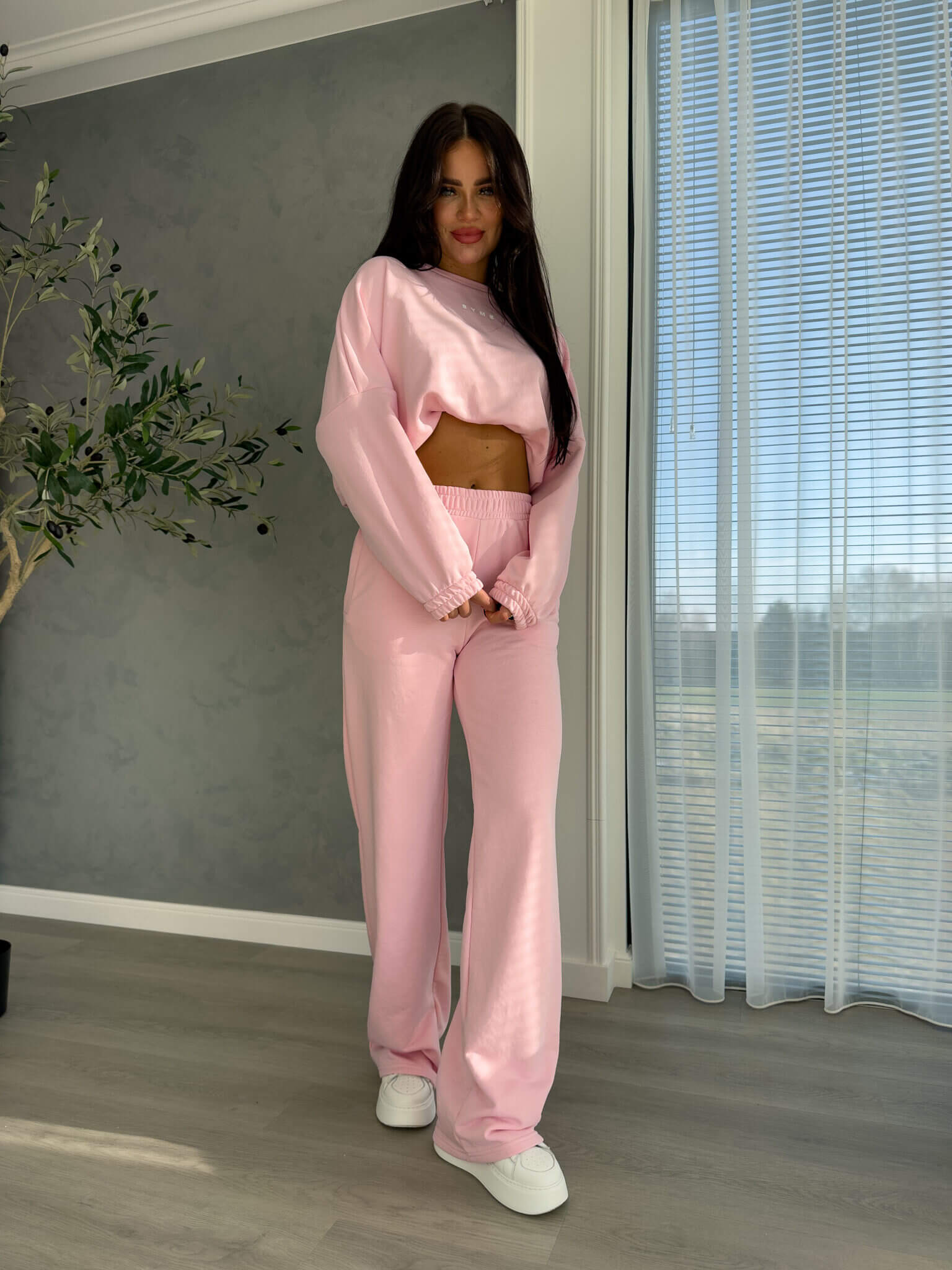 Komplet Sydney składający się z bluzy i spodni. Bluza o prostym, luźnym kroju, z długim rękawem zakończonym gumą. Szerokie spodnie z gumką w pasie