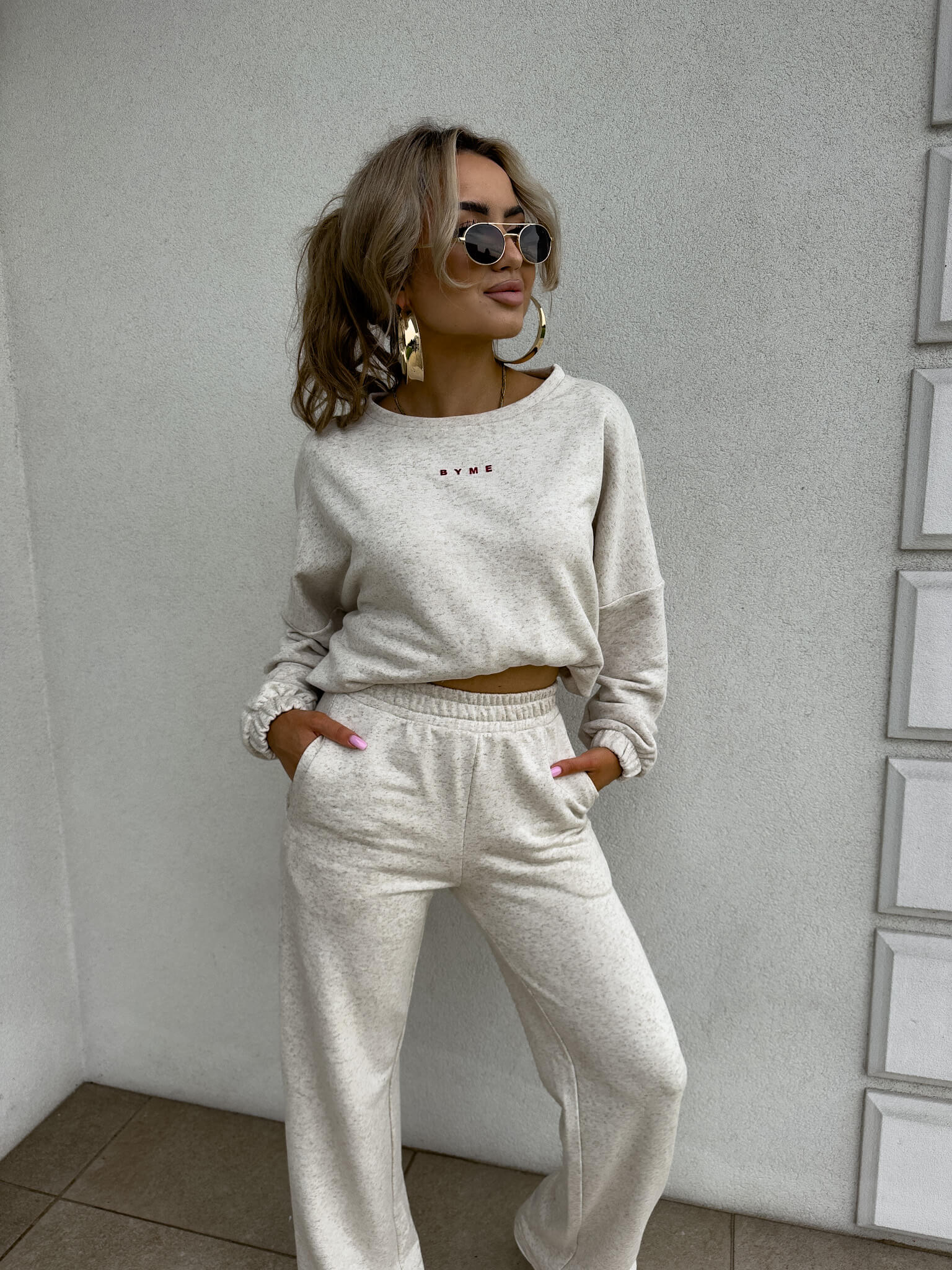 Komplet Sydney składający się z bluzy i spodni.  Bluza o prostym, luźnym kroju, z długim rękawem zakończonym gumą. Szerokie spodnie z gumką w pasie