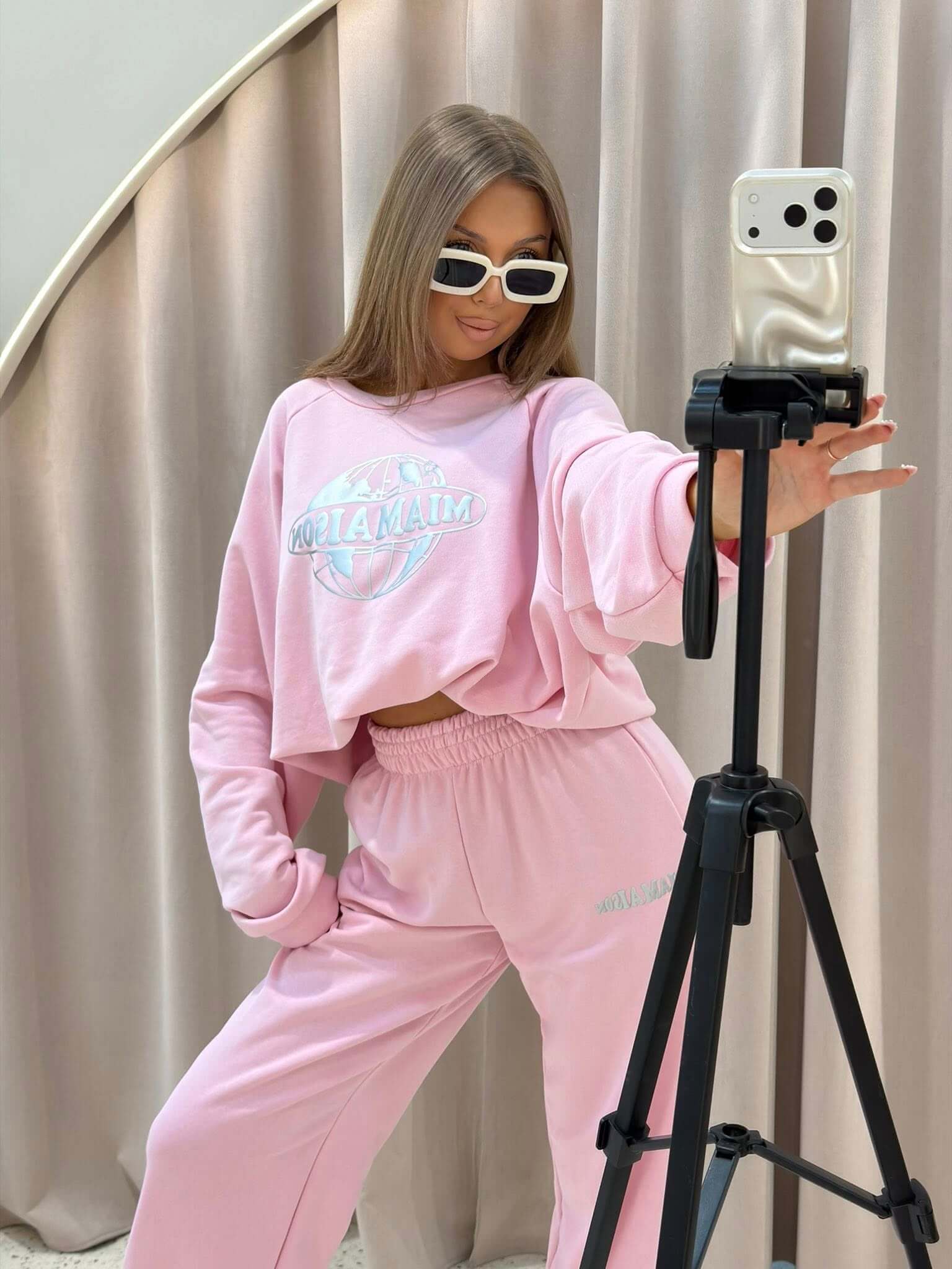Bluza o oversize’owym kroju z wyrazistym logo z przodu nadaje całości nowoczesnego charakteru. Obniżona linia ramion i luźny fason zapewniają maksymalny komfort oraz swobodę ruchów. Spodnie z wysokim stanem i elastyczną talią pięknie podkreślają sylwetkę, a szerokie nogawki dodają lekkości i modowego wykończenia.