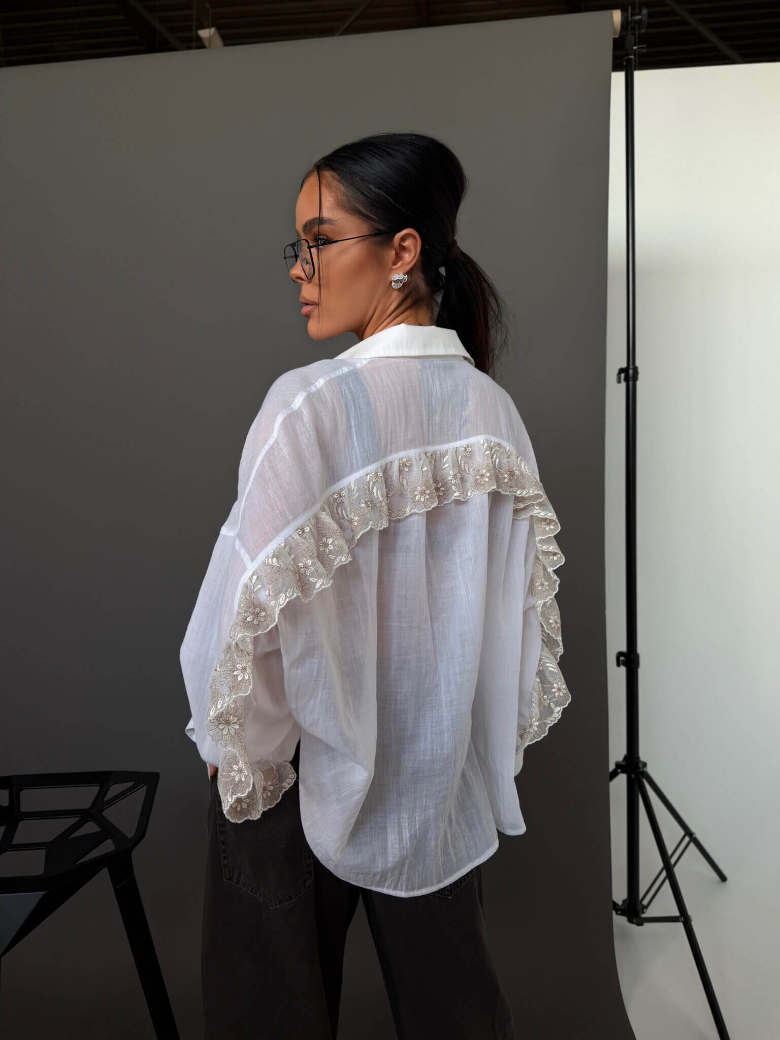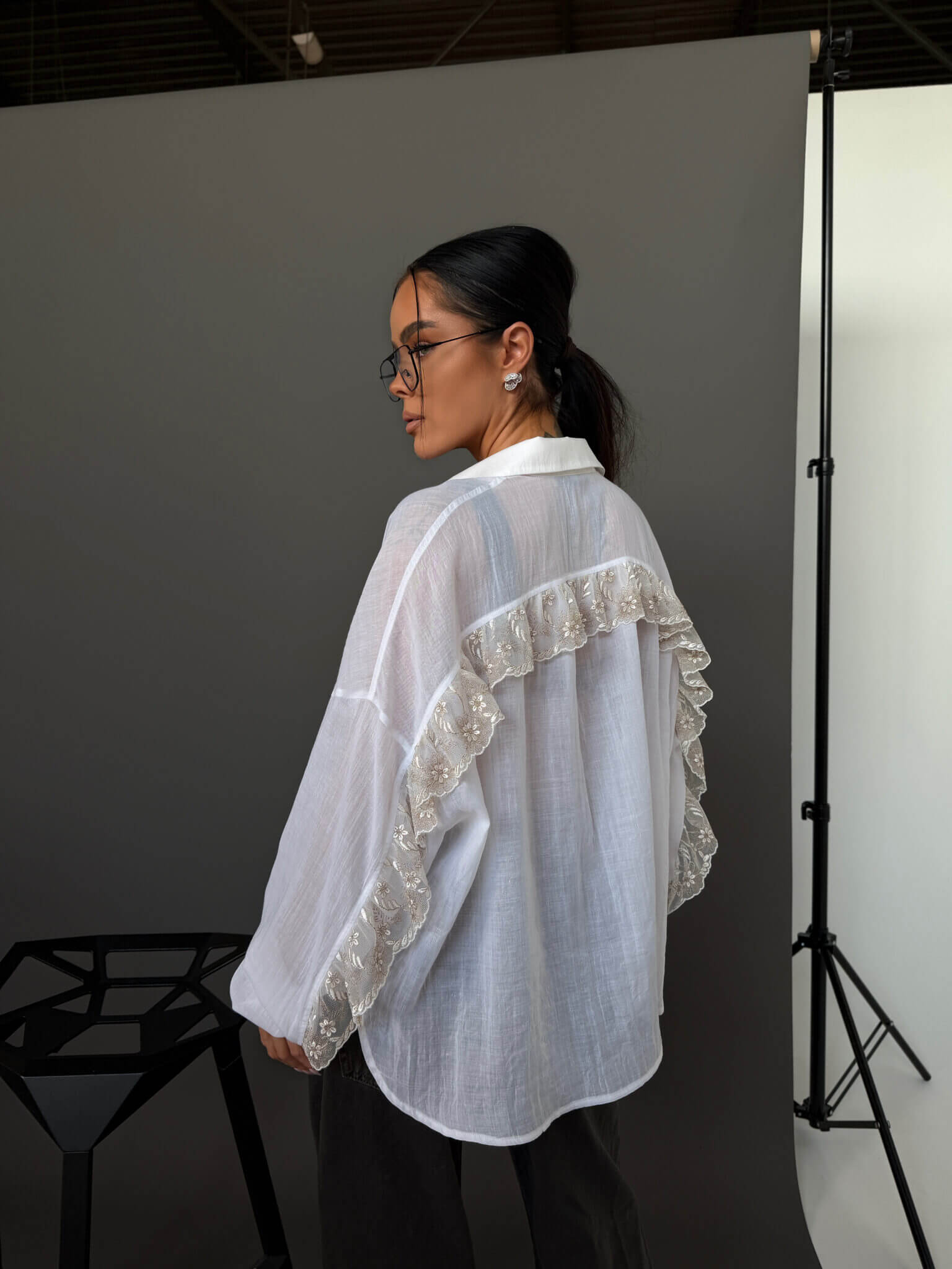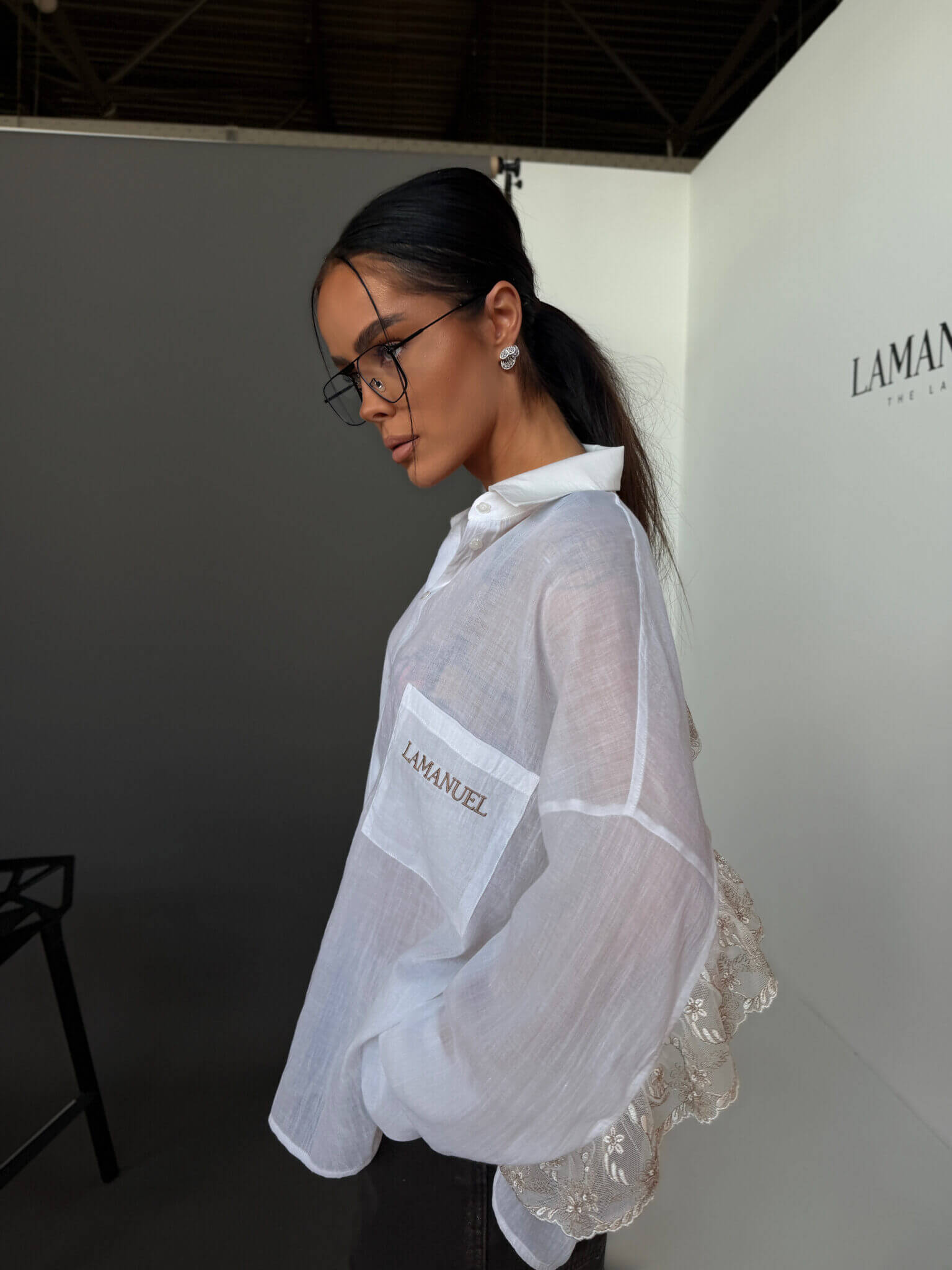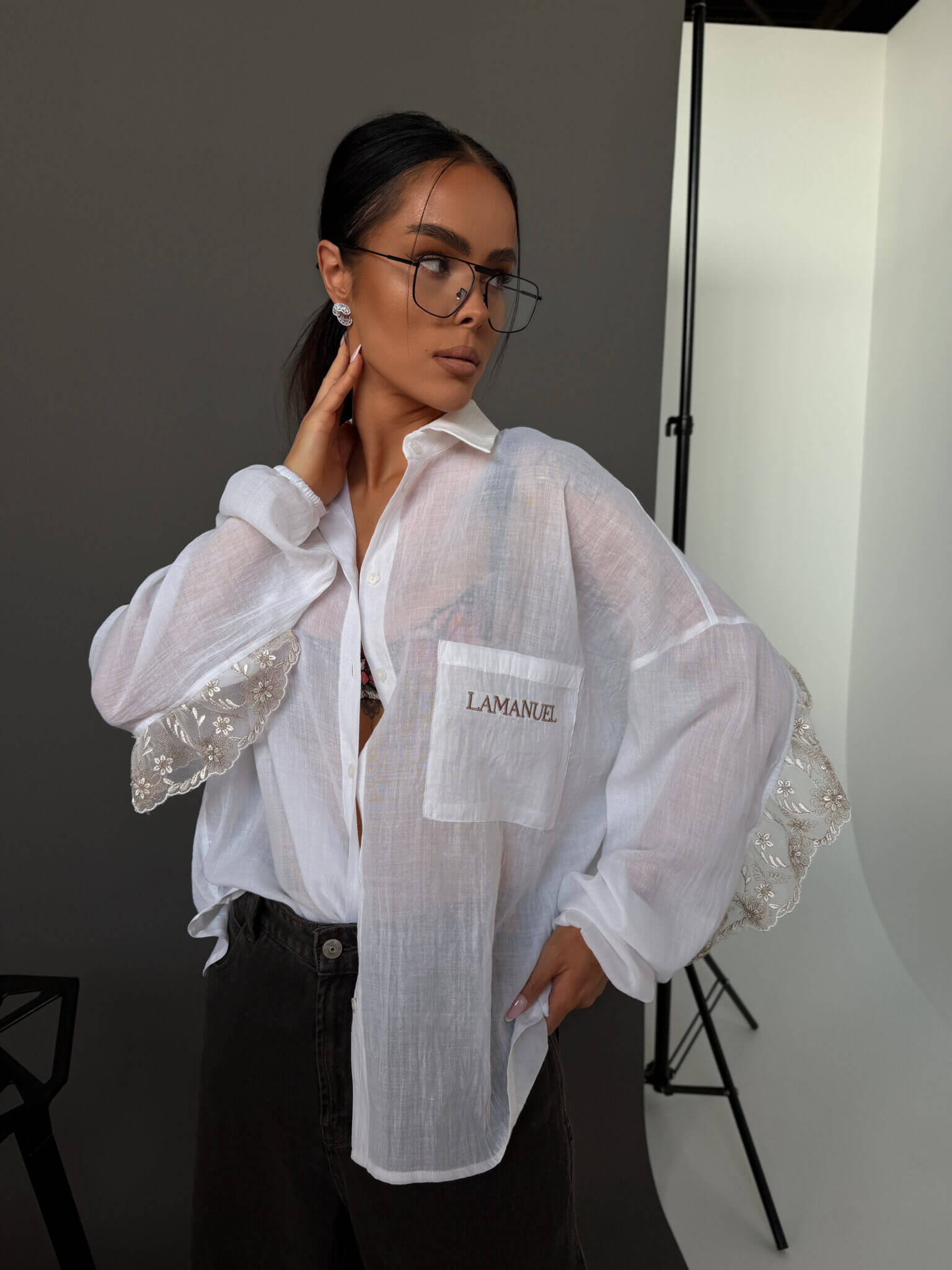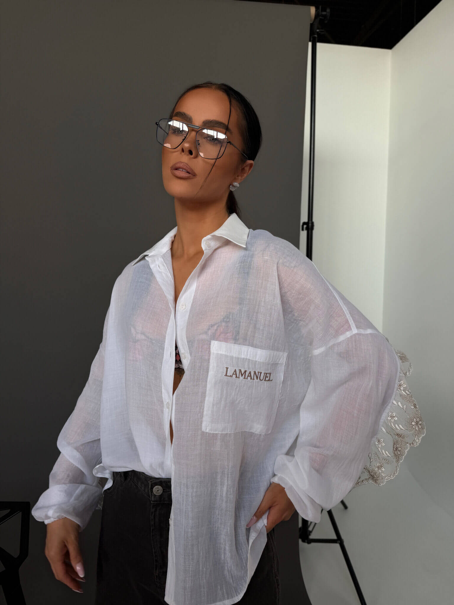Koszula AMOR LAMANUEL o lekkiej, oversize’owej formie, wykonana z przewiewnej, półtransparentnej tkaniny, która nadaje jej delikatnego, kobiecego charakteru. Klasyczny kołnierzyk i zapięcie na guziki przełamane są ozdobnym wykończeniem z koronką na plecach i rękawach, co tworzy efektowny detal i wyróżnia model. Luźny krój zapewnia swobodę noszenia i naturalnie układa się na sylwetce, tworząc nowoczesny, lekki look.