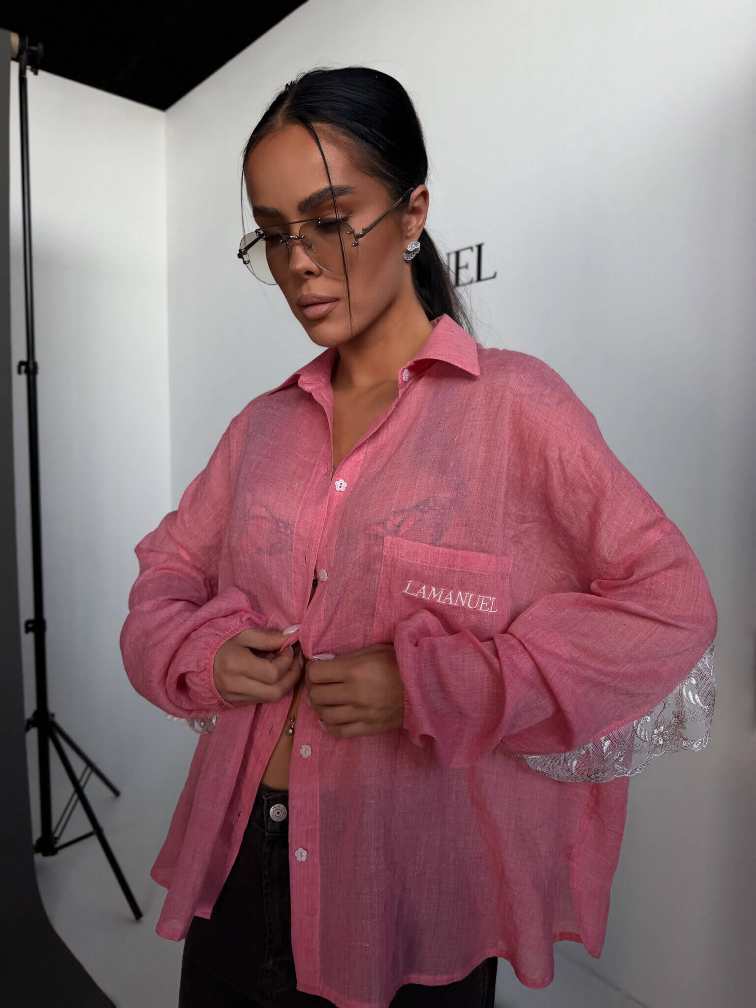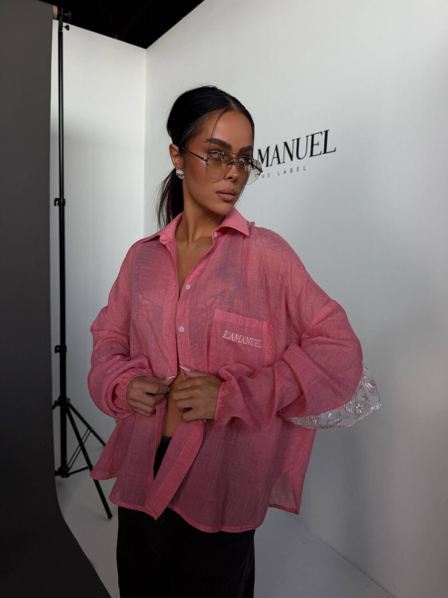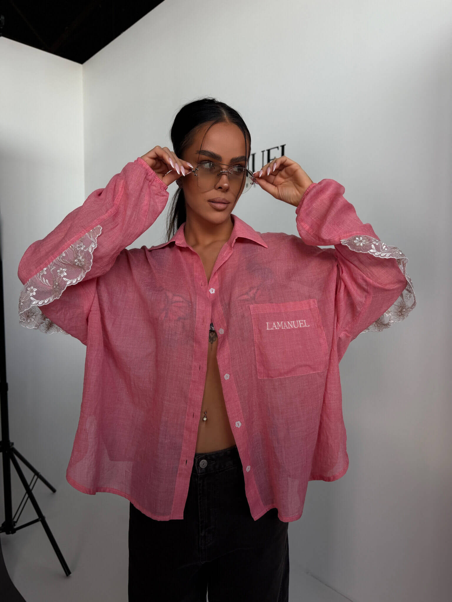 Koszula AMOR LAMANUEL o lekkiej, oversize’owej formie, wykonana z przewiewnej, półtransparentnej tkaniny, która nadaje jej delikatnego, kobiecego charakteru. Klasyczny kołnierzyk i zapięcie na guziki przełamane są ozdobnym wykończeniem z koronką na plecach i rękawach, co tworzy efektowny detal i wyróżnia model. Luźny krój zapewnia swobodę noszenia i naturalnie układa się na sylwetce, tworząc nowoczesny, lekki look.