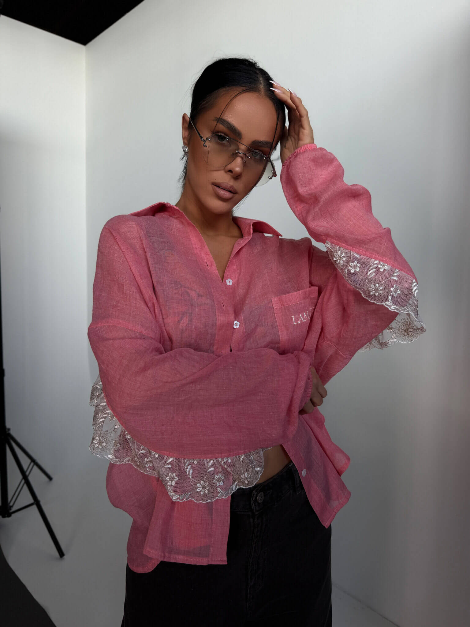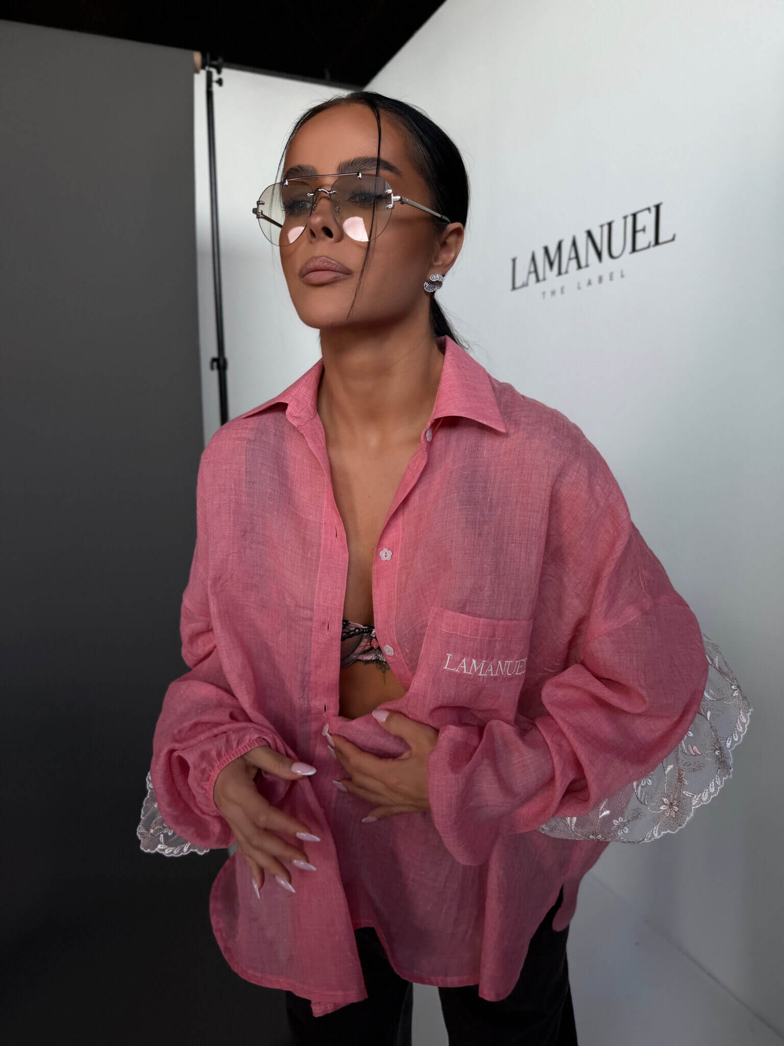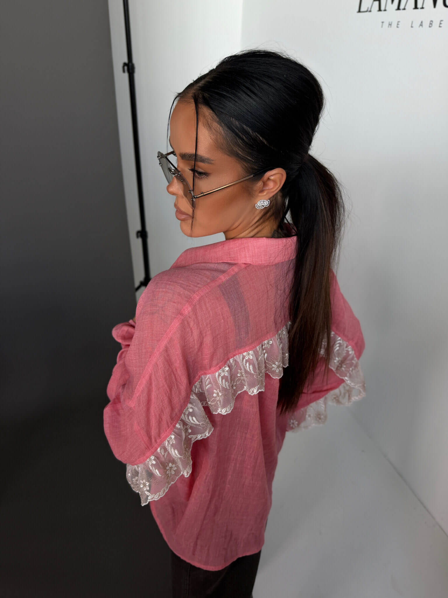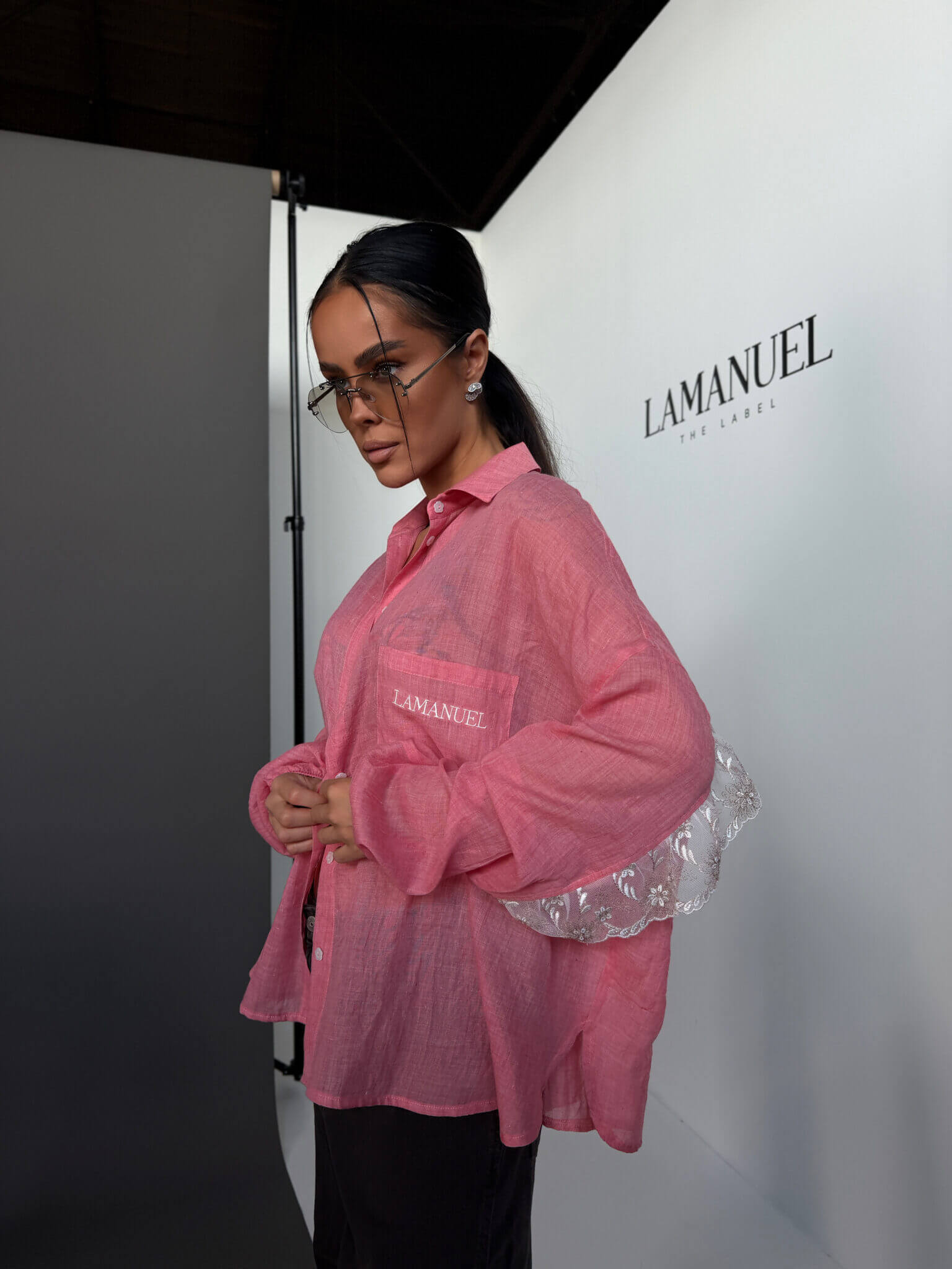 Koszula AMOR LAMANUEL o lekkiej, oversize’owej formie, wykonana z przewiewnej, półtransparentnej tkaniny, która nadaje jej delikatnego, kobiecego charakteru. Klasyczny kołnierzyk i zapięcie na guziki przełamane są ozdobnym wykończeniem z koronką na plecach i rękawach, co tworzy efektowny detal i wyróżnia model. Luźny krój zapewnia swobodę noszenia i naturalnie układa się na sylwetce, tworząc nowoczesny, lekki look.