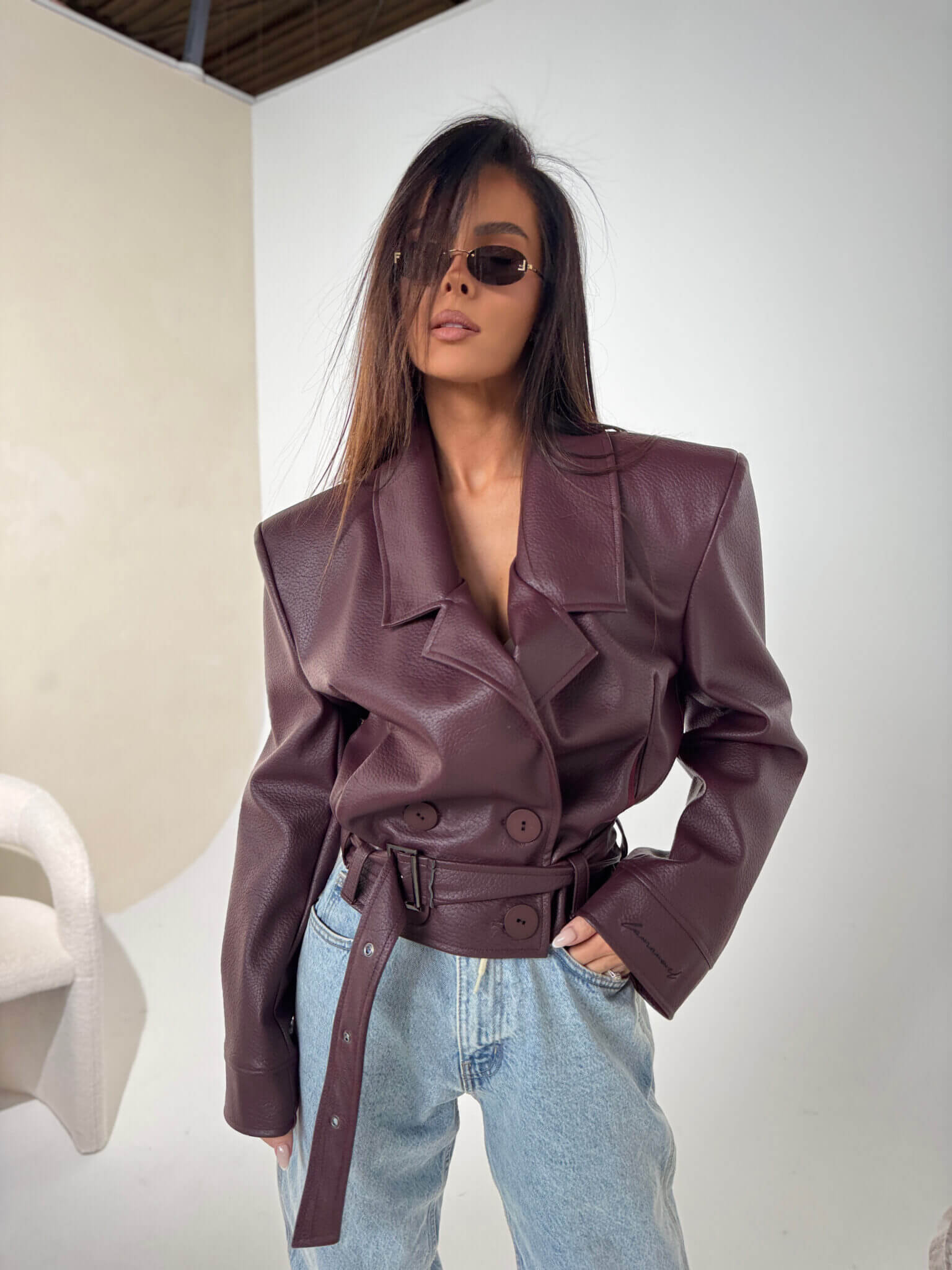 Kurtka VISION LAMANUEL wykonana z wysokiej jakości eko skóry o wyrazistej strukturze. Klasyczny fason z szerokimi ramionami i mocno zarysowaną linią kołnierza, na rękawie znajduje się logo marki. Dwurzędowe zapięcie z dużymi guzikami i pasek z klamrą w talii podkreślają kobiecą sylwetkę. Stylowa, mocna forma – idealna do jeansów jak i codziennych looków.