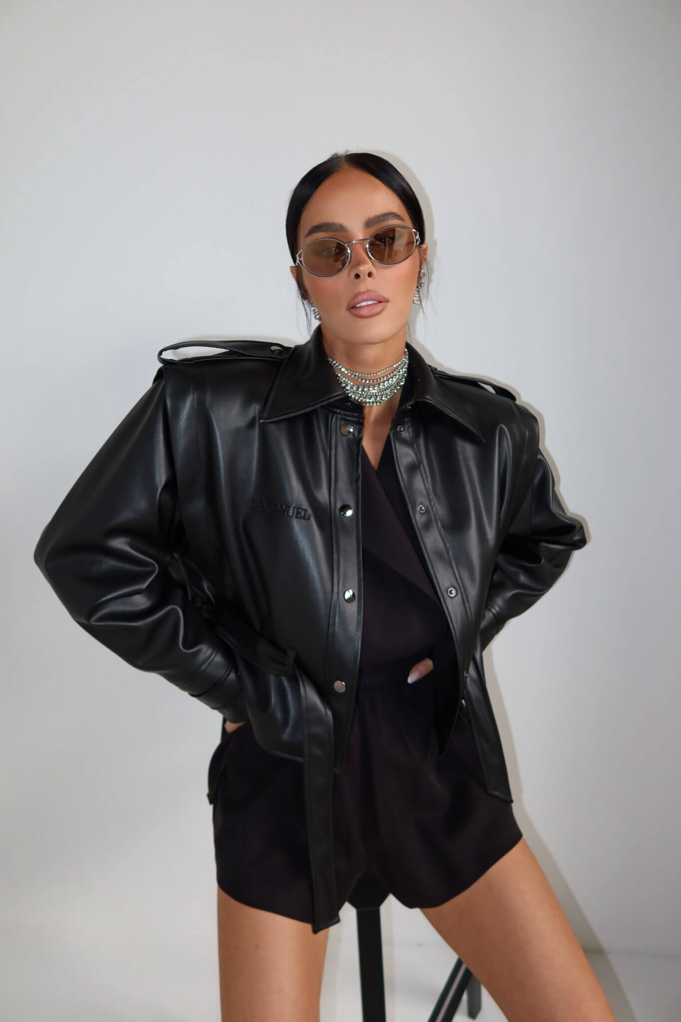 Kurtka WANTED LAMANUEL z imitacji skóry o lekkim połysku i strukturalnym fasonie. Model zapinany na napy, z klasycznym kołnierzem i szerokimi rękawami zakończonymi mankietem z paskiem. Naramienniki i przeszycia nawiązują do formy trencza, a pasek w talii pozwala podkreślić sylwetkę lub nosić kurtkę na luzie. Na piersi wyhaftowane tonalne logo. Idealna do stylizacji total look, ale też jako mocny akcent w prostym outficie.