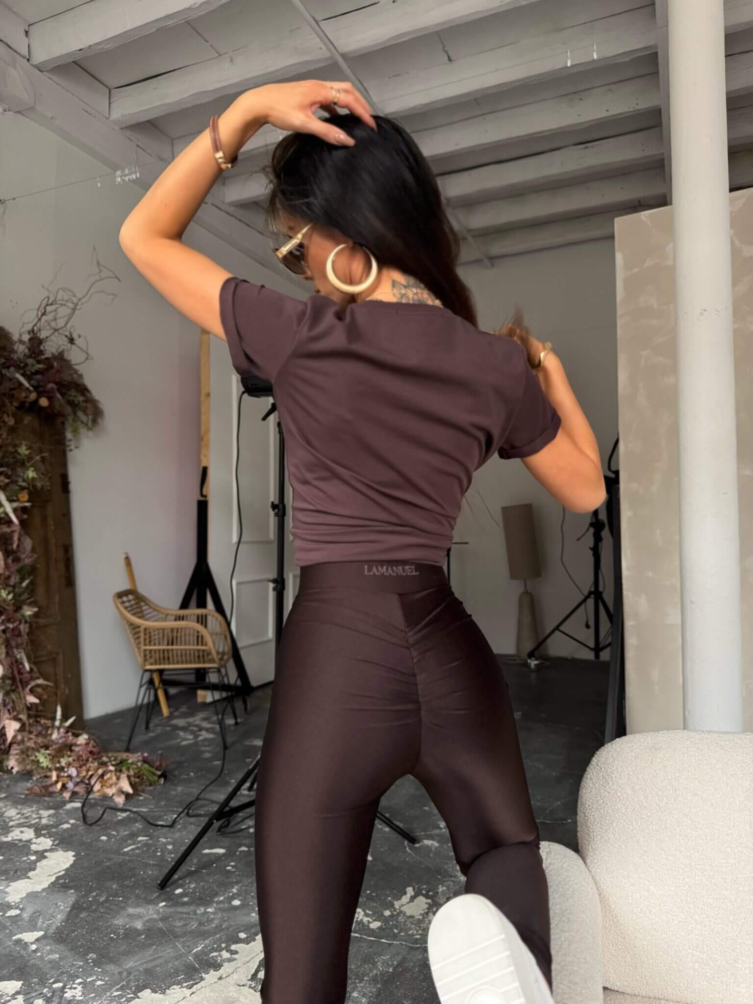 Wysoki stan podkreśla talię, a specjalne marszczenie na pośladkach optycznie unosi i modeluje sylwetkę. Subtelne logo nadaje eleganckiego akcentu, a praktyczny zamek dodaje nowoczesnego charakteru.