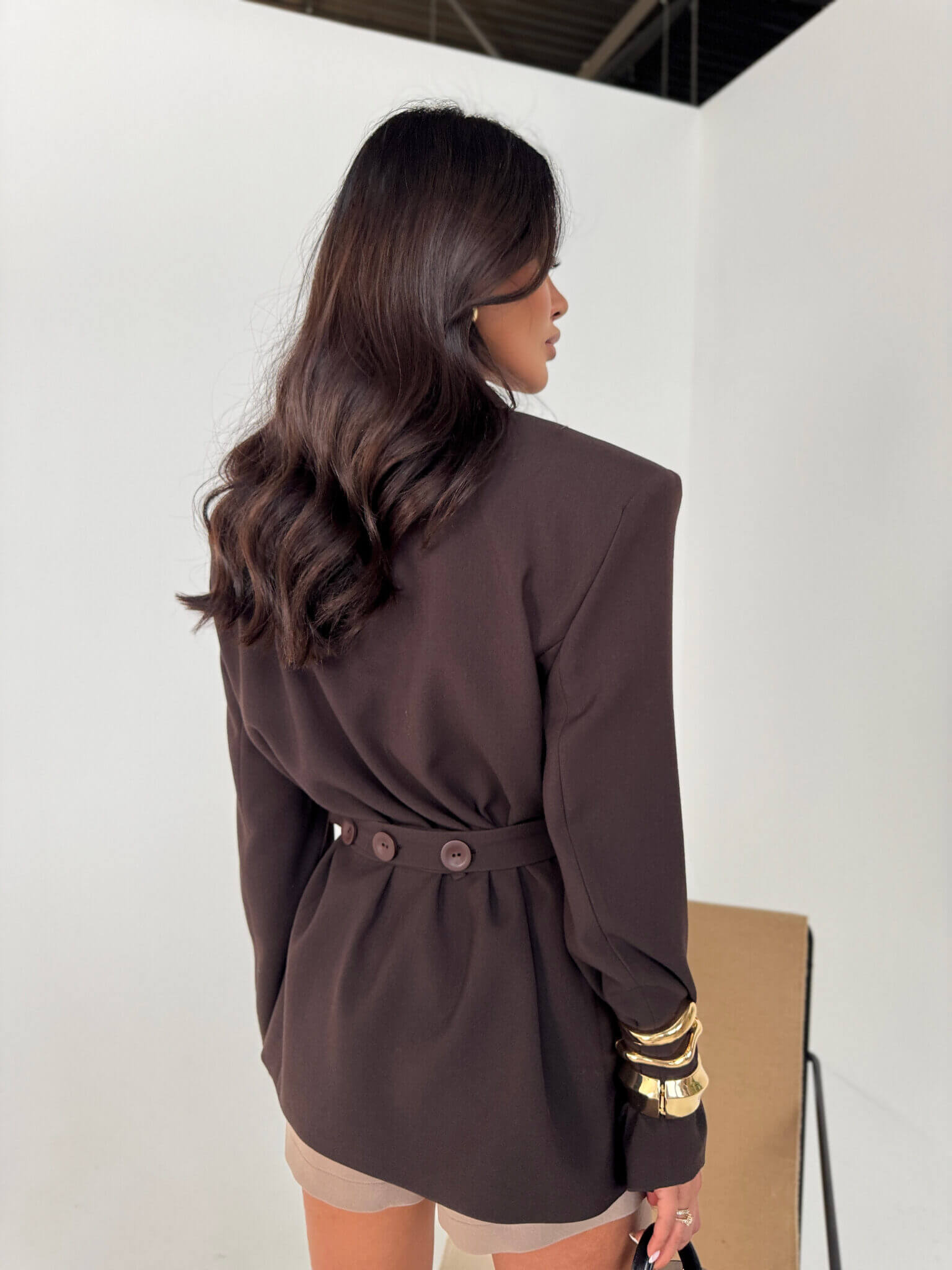 Marynarka DESIRE LAMANUEL o klasycznym kroju z dołączonym paskiem zapinanym na dekoracyjne guziki. Pasek można nosić na 2 sposoby zarówno z przodu, jak i z tyłu, podkreślając talię lub tworząc swobodniejszy look. Model z modnymi klapami, kieszeniami z patkami i subtelną metką z logo na jednym rękawie. Idealna baza do zarówno eleganckich jak i casualowych stylizacji.