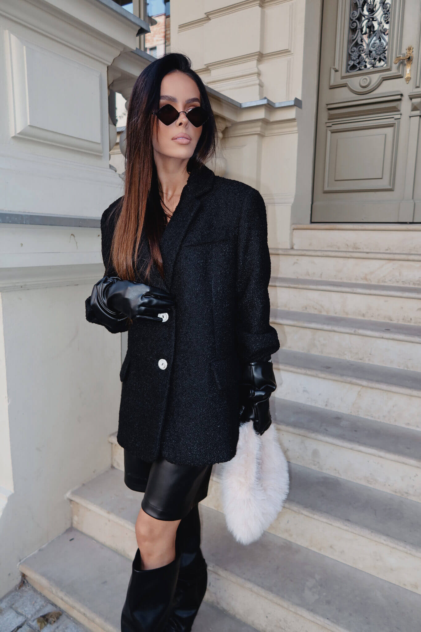 Marynarka FEMININE LAMANUEL o fakturze boucle z wyrazistą strukturą i dopracowanym krojem, który pozwala nosić ją jak lekki płaszcz. Miękka, ale trzymająca formę, z szerokimi klapami i ozdobnymi guzikami, sprawdzi się zarówno w eleganckich, jak i codziennych zestawieniach. Idealna do warstwowych stylizacji – narzucona na koszulę, sweter czy nawet cienką kurtkę. Stylowa alternatywa dla klasycznego okrycia wierzchniego.