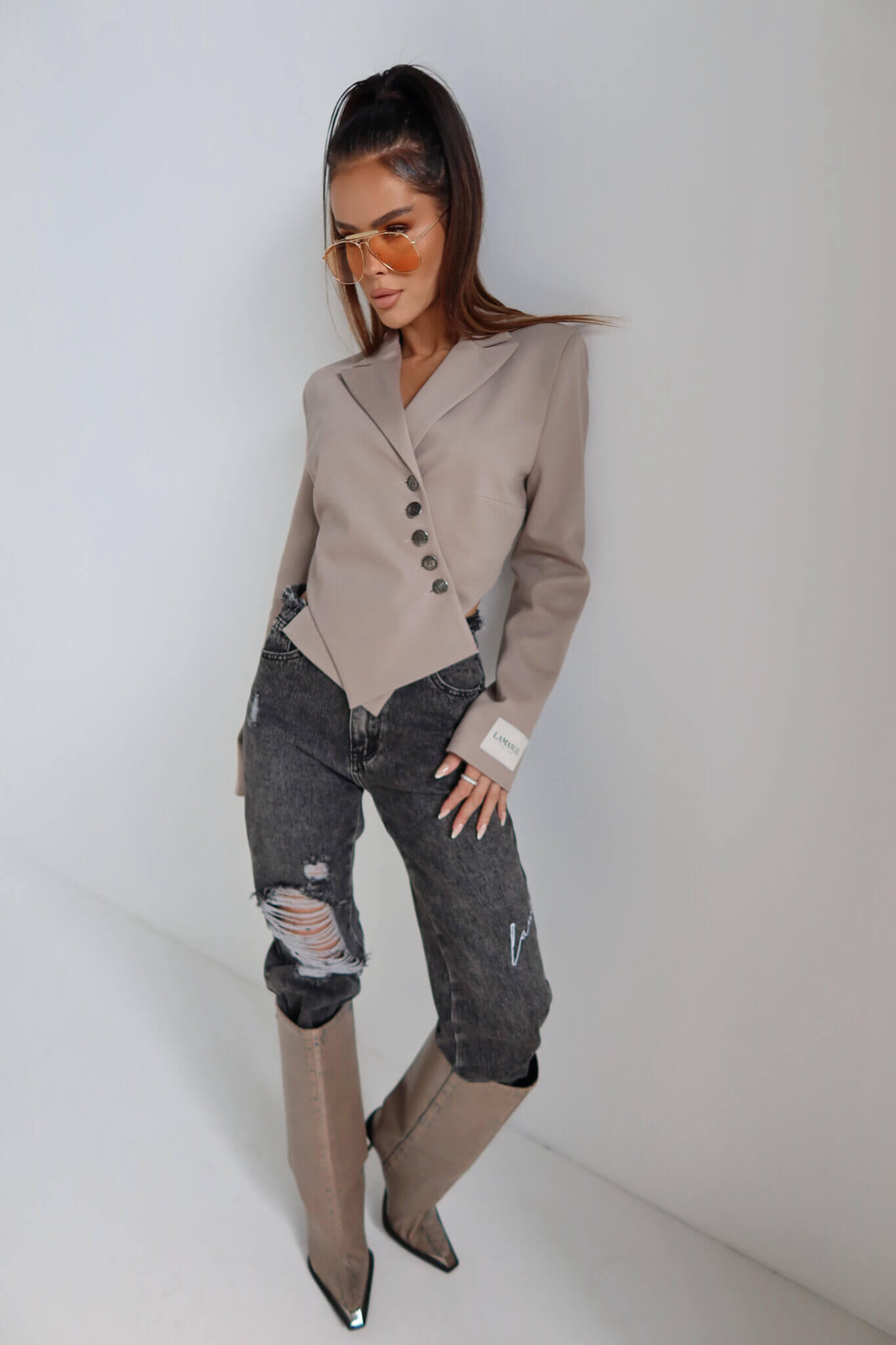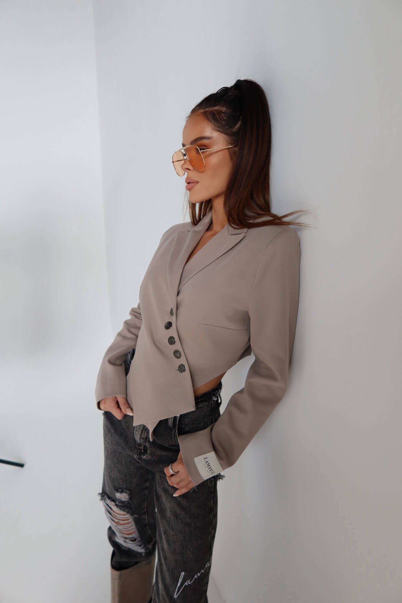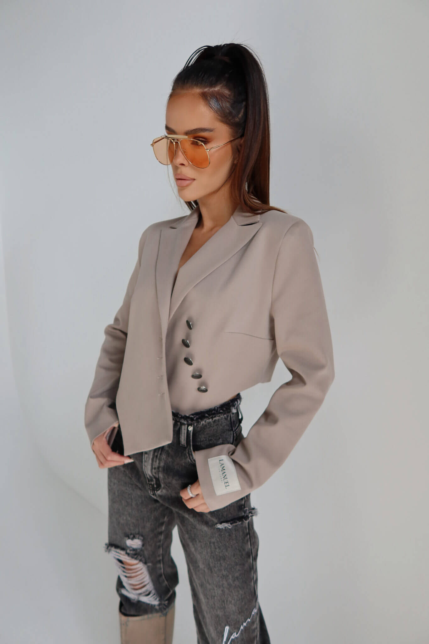 Krótsza marynarka GRAVITY LAMANUEL o mocno zarysowanej linii ramion dzięki wszytym poduszkom, które nadają sylwetce strukturalny, nowoczesny charakter. Model zapinany asymetrycznie na ozdobne guziki w stylu vintage, z wydłużonym przodem i lekkim taliowaniem. Rękaw wykończony mankietem z naszywką LAMANUEL. Idealna jako modowy statement do jeansów, spódnic mini czy spodni garniturowych. Kobieca, mocna i z charakterem.