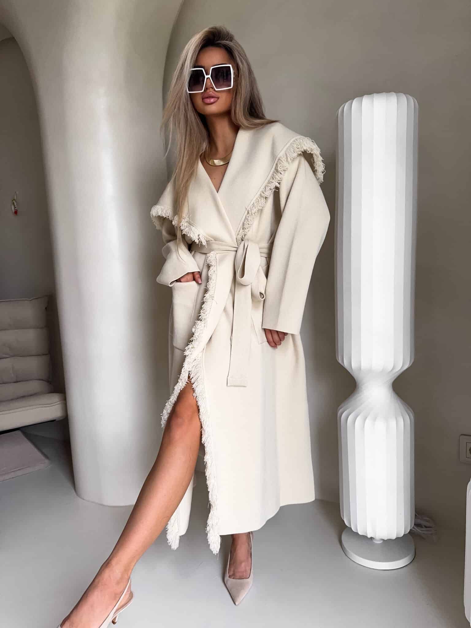 Płaszcz DIVA BY ME to model o lekko oversize’owym kroju, wiązany w pasie szerokim paskiem, który pięknie podkreśla talię i pozwala dopasować sylwetkę do własnych preferencji. Długość sięgająca za kolano. Szeroki, opadający kołnierz został ozdobiony dekoracyjnymi strzępieniami, które pojawiają się również wzdłuż zapięcia oraz na dole płaszcza. Po bokach znajdują się praktyczne, wpuszczane kieszenie.