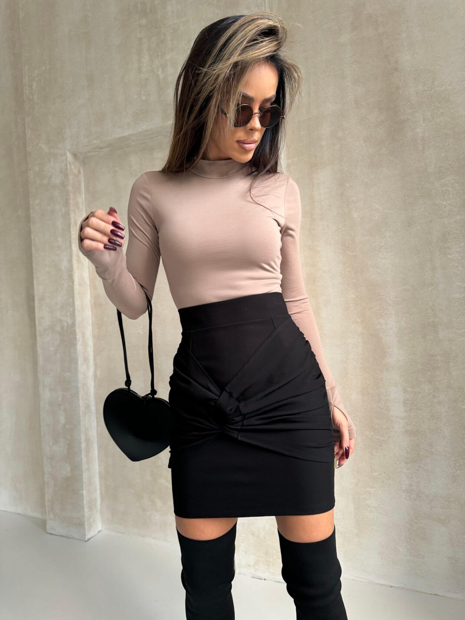 Stylowa spódnica mini z subtelnym marszczeniem na przodzie EVE LA MANUEL, które pięknie modeluje sylwetkę, oraz ozdobnym oczkiem, które dodaje jej unikalnego charakteru. Krótszy krój idealnie podkreśla nogi. Ta spódnica to doskonały wybór na imprezy, wieczorne wyjścia czy casualowe stylizacje, łącząc wygodę z kobiecym urokiem.
