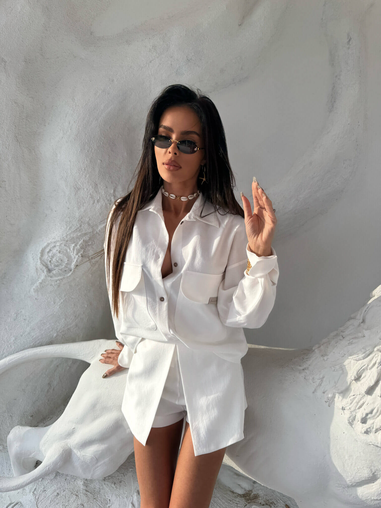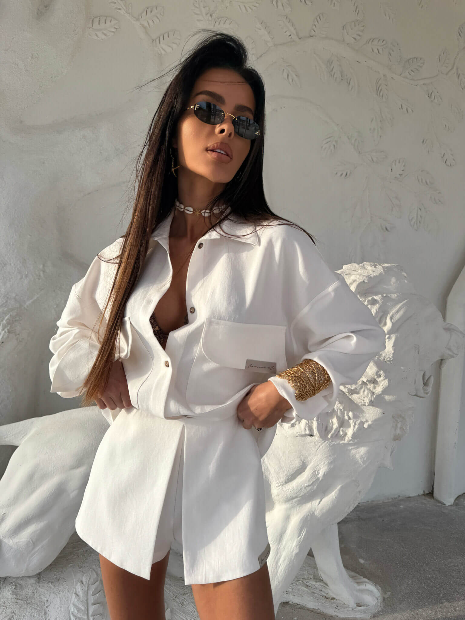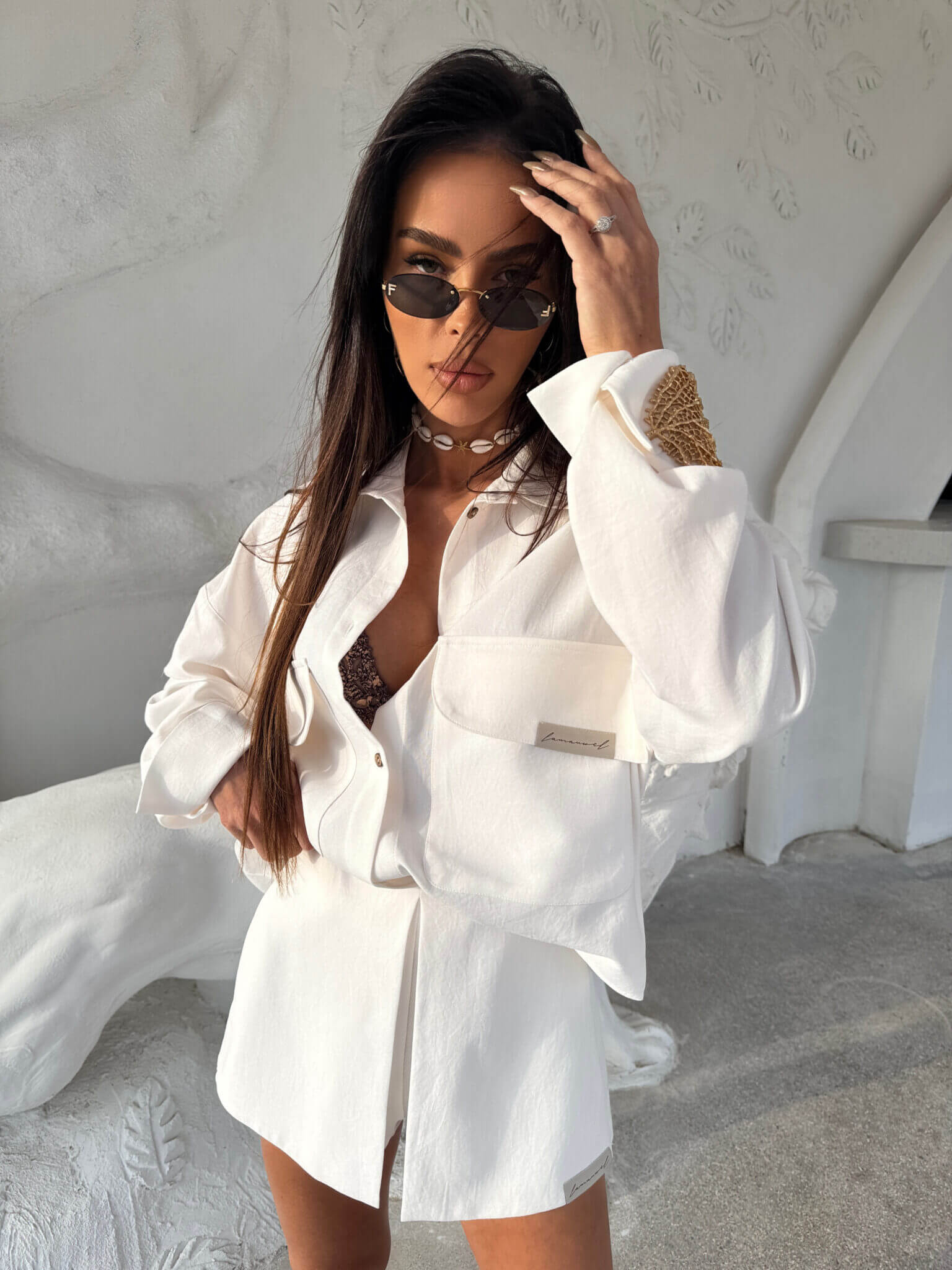Eleganckie, a zarazem wygodne spódnico-spodenki SAFARI LAMANUEL to must-have w letniej garderobie. Model posiada oryginalne wykończenie z przodu w postaci imitacji spódnicy z zakładką, dzięki czemu łączy kobiecy look z komfortem klasycznych szortów. Uszyte z miękkiej, delikatnie strukturalnej tkaniny, która pięknie układa się na sylwetce. Zapinane z boku na kryty suwak. Wysoki stan podkreśla talię, a minimalistyczna naszywka z logo marki na dole dodaje nowoczesnego akcentu. Świetnie komponują się zarówno z koszulą o niestandardowych kieszeniach z tego samego zestawu, jak i z bardziej casualowym topem.