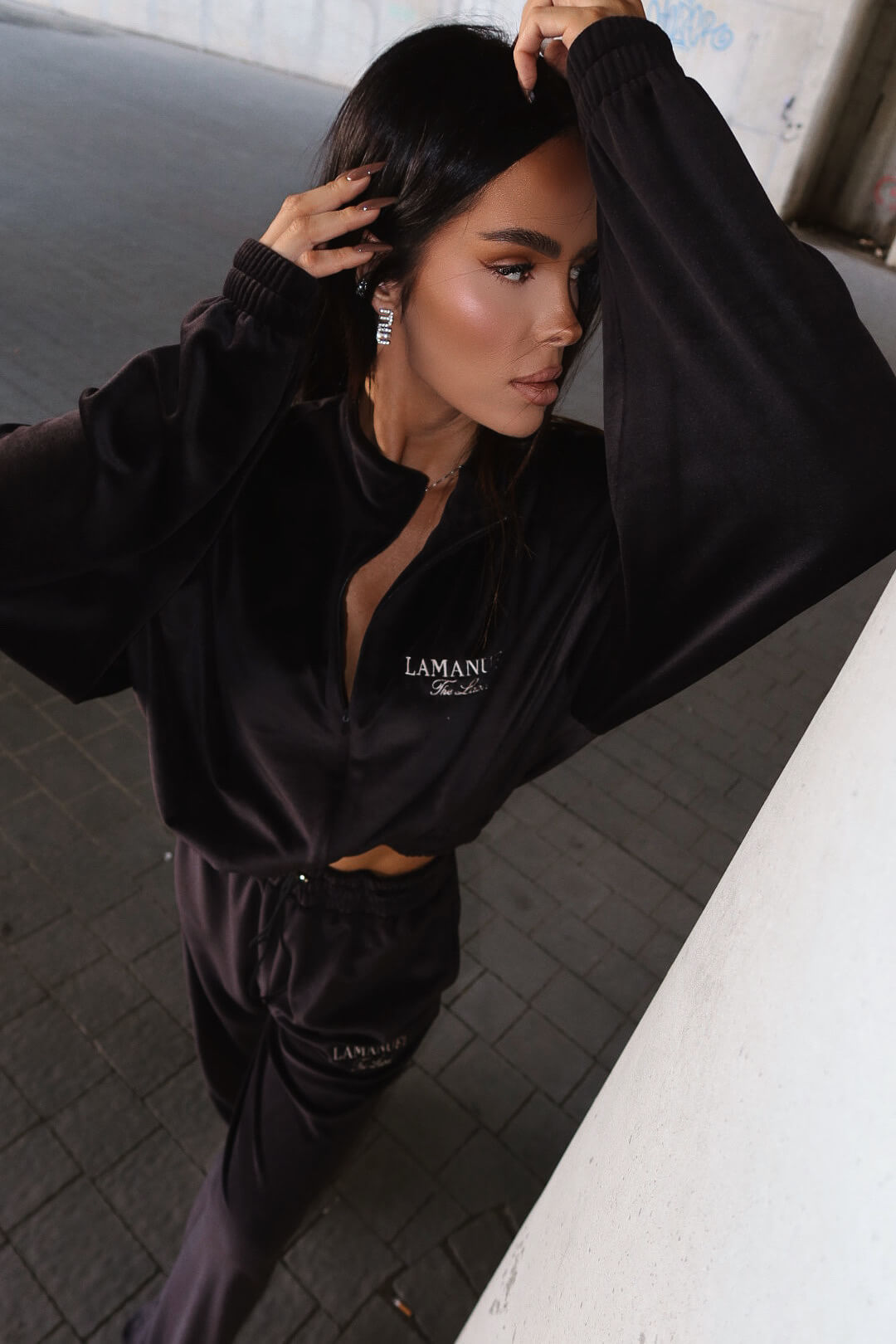 Luźne spodnie GLOSSY LAMANUEL z wysokim stanem, wykonane z miękkiego weluru. Elastyczna talia z troczkiem gwarantuje wygodę i dopasowanie niezależnie od typu figury. Model one size, który świetnie leży na różnych sylwetkach — od smukłych po bardziej krągłe. Tworzą idealny zestaw z pasującą bluzą.