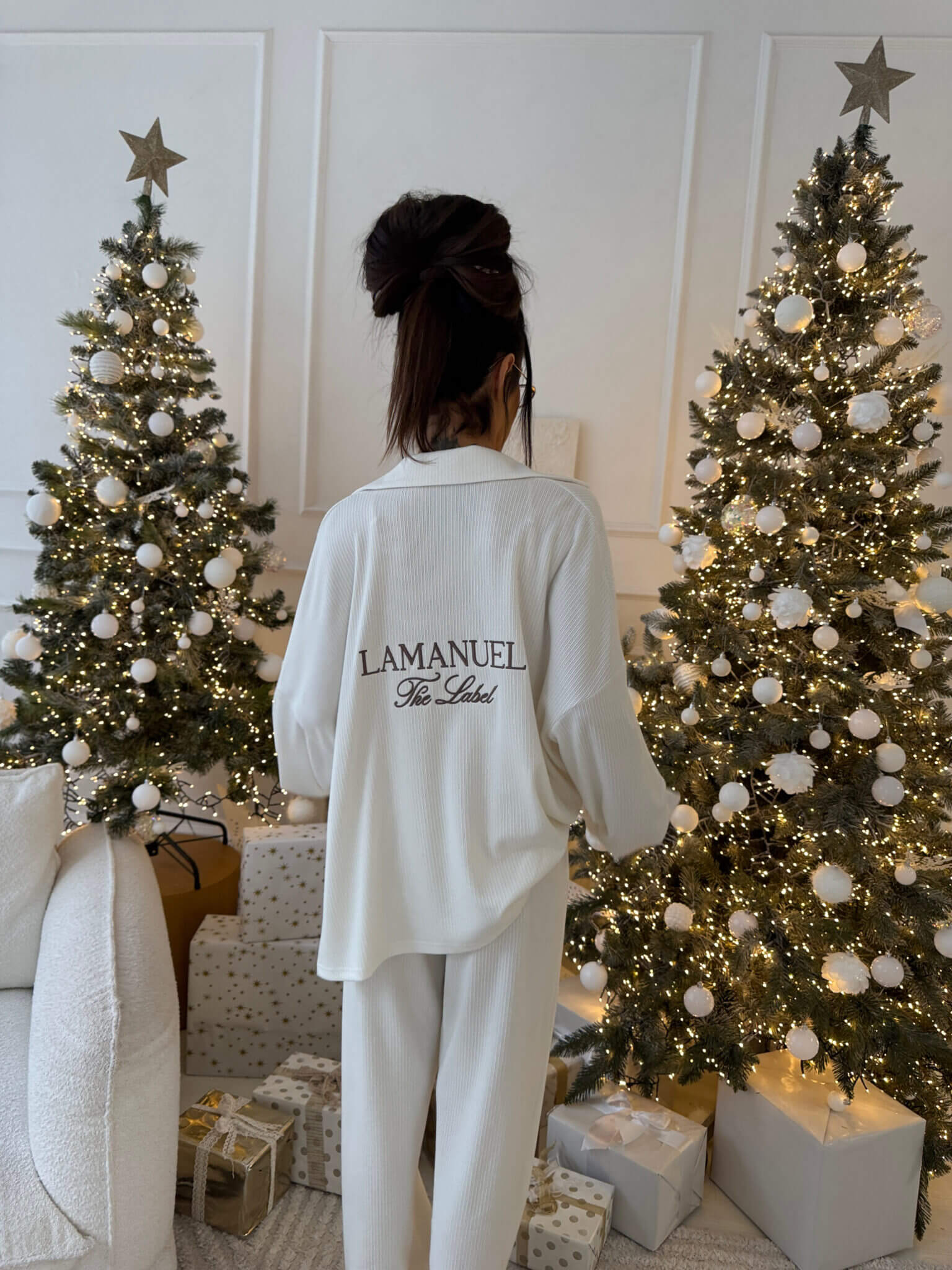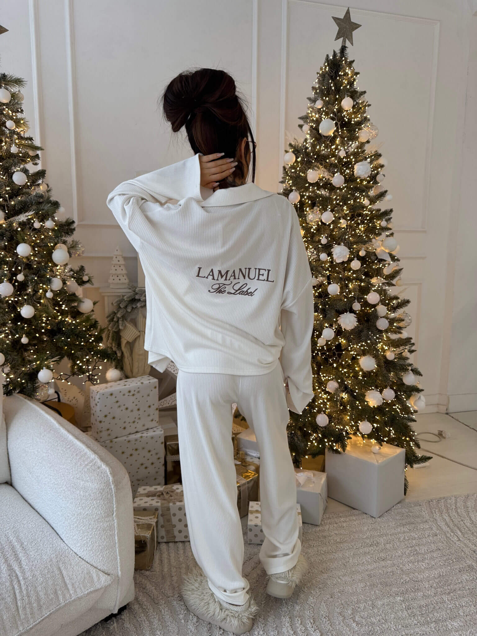 Swobodne, prążkowane spodnie LOOSE LAMANUEL to must-have sezonu – miękkie, elastyczne i stylowe. Ich casualowy krój idealnie balansuje między domowym komfortem a miejskim lookiem. W zestawie z koszulo-bluzą tworzą komplet, który można nosić jak luksusową piżamę lub codzienny uniform – do sneakersów, płaszcza, swetra. Komfort nie musi być nudny – z LAMANUEL staje się elementem stylu.