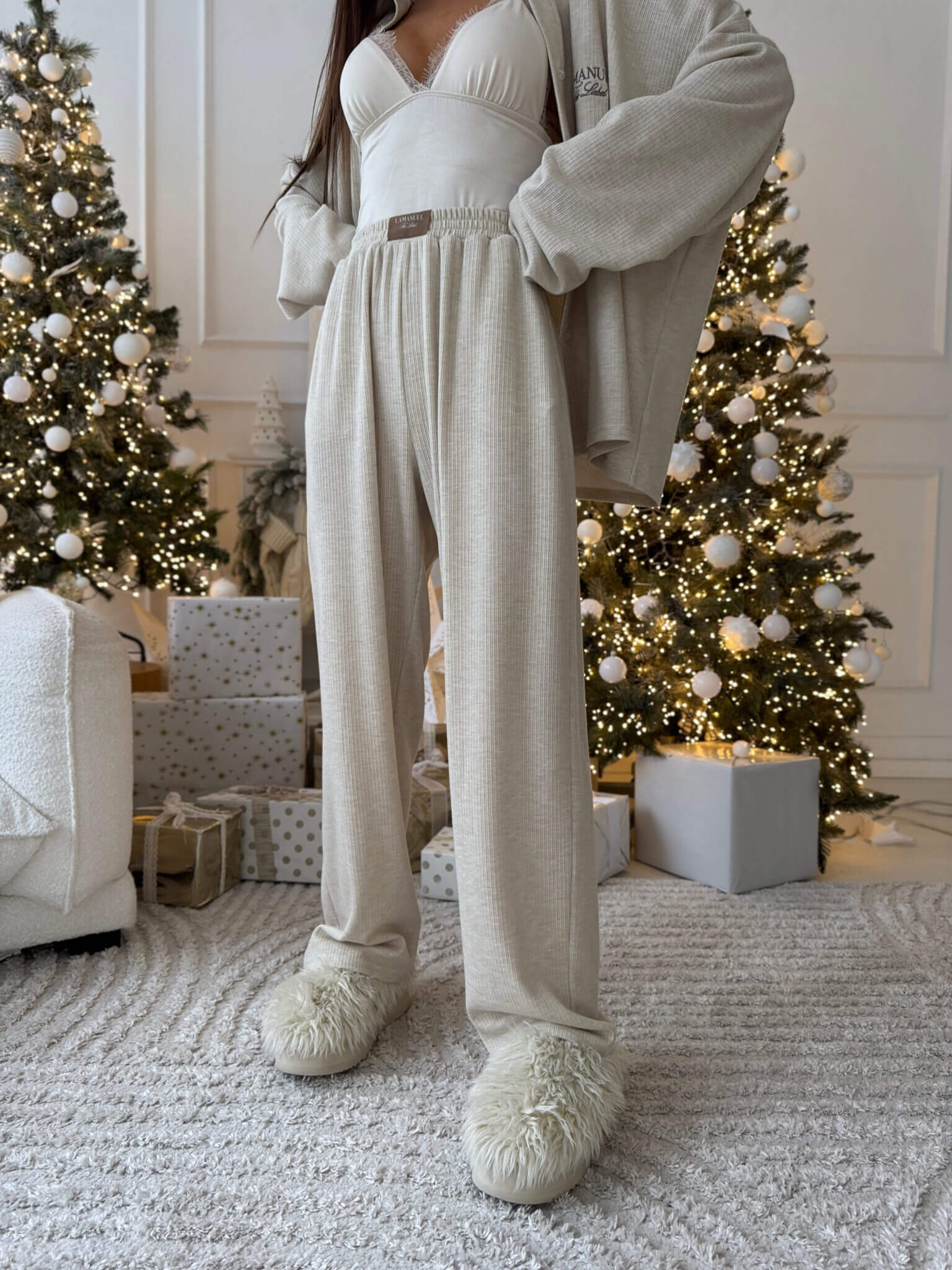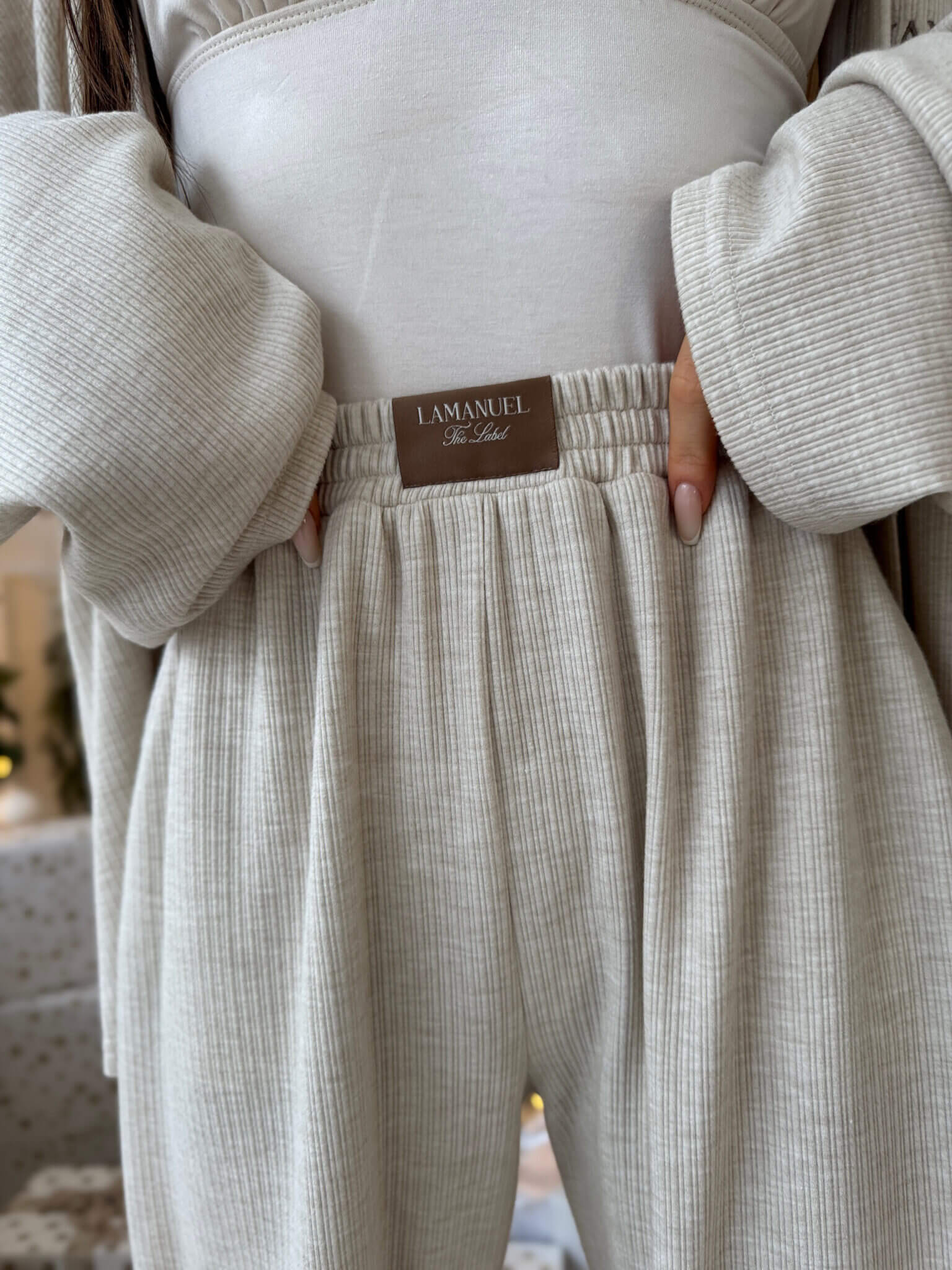 Swobodne, prążkowane spodnie LOOSE LAMANUEL to must-have sezonu – miękkie, elastyczne i stylowe. Ich casualowy krój idealnie balansuje między domowym komfortem a miejskim lookiem. W zestawie z koszulo-bluzą tworzą komplet, który można nosić jak luksusową piżamę lub codzienny uniform – do sneakersów, płaszcza, swetra. Komfort nie musi być nudny – z LAMANUEL staje się elementem stylu.