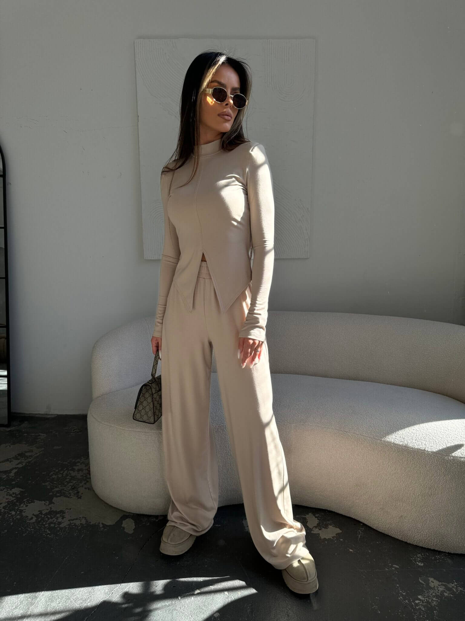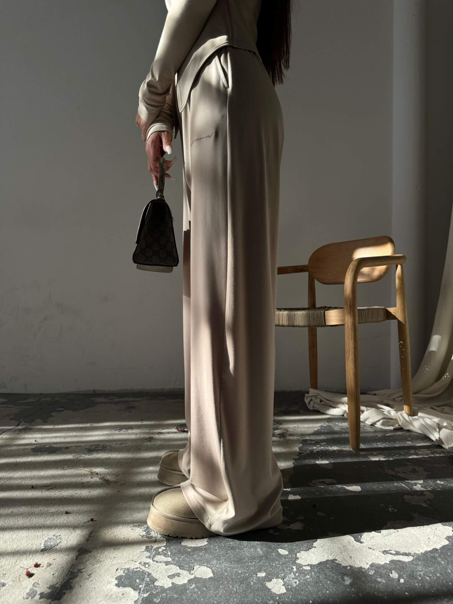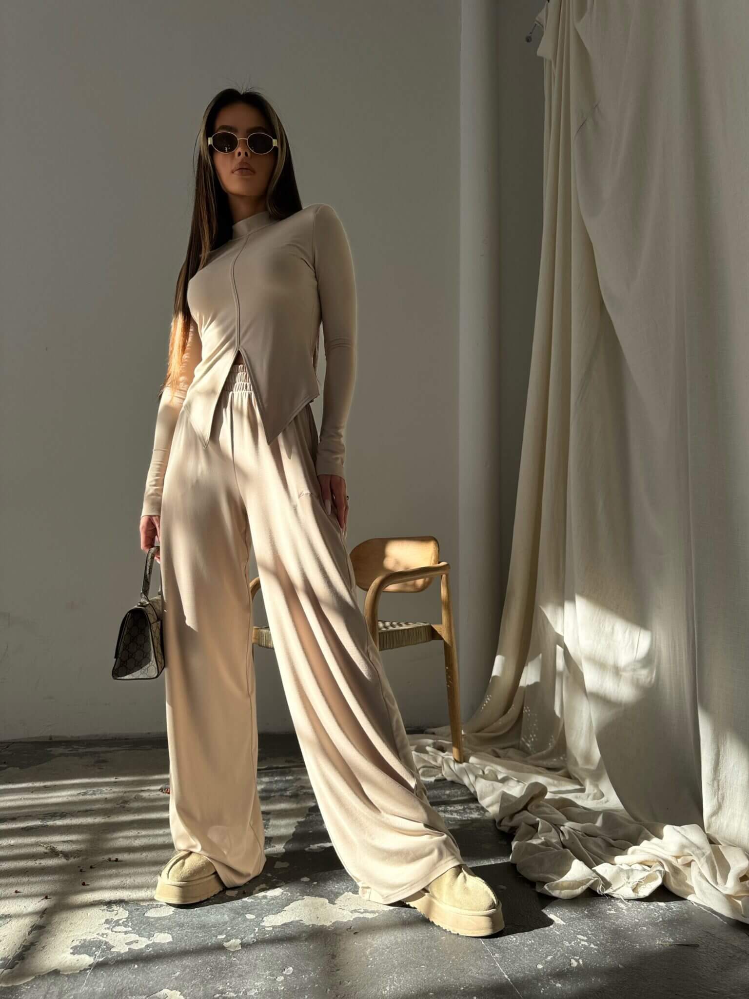 Spodnie z gumką w pasie MOTION LA MANUEL to połączenie komfortu i elegancji. Wykonane z miękkiego, lejącego się materiału, który swobodnie opływa sylwetkę, dodają lekkości każdej stylizacji. Kieszenie zapewniają praktyczność, a rozszerzane nogawki nadają nowoczesny, stylowy wygląd. Idealne do noszenia na co dzień, jak i na bardziej formalne okazje. Świetnie komponują się z dopasowanym topem FEVER z półgolfem, tworząc spójną i elegancką całość.