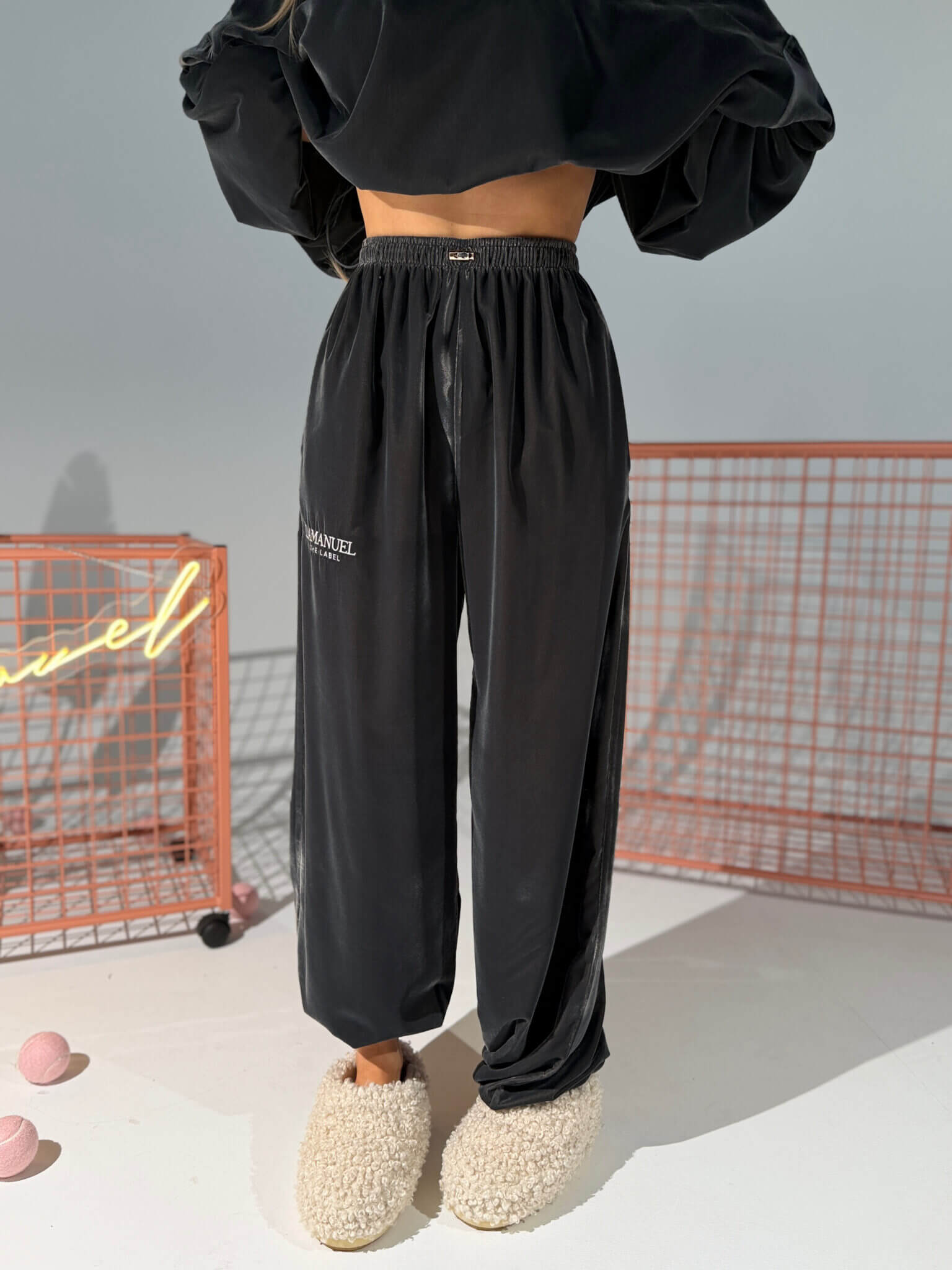 Aksamitna dzianina z delikatnym refleksem – gładka, przyjemna w dotyku, ale bez zbędnego połysku. Wysoki stan, szeroka guma w pasie i dodatkowa regulacja sznurkiem. Nogawki proste, lekko lejące, z możliwością ściągnięcia na dole dzięki ukrytej gumce. Na biodrze haft – detal, który robi różnicę. Subtelny, ale wyczuwalny. Te spodnie wyglądają stylowo nawet w połączeniu z basicowym topem. Efekt jak z setu, nawet gdy nosisz je solo.
