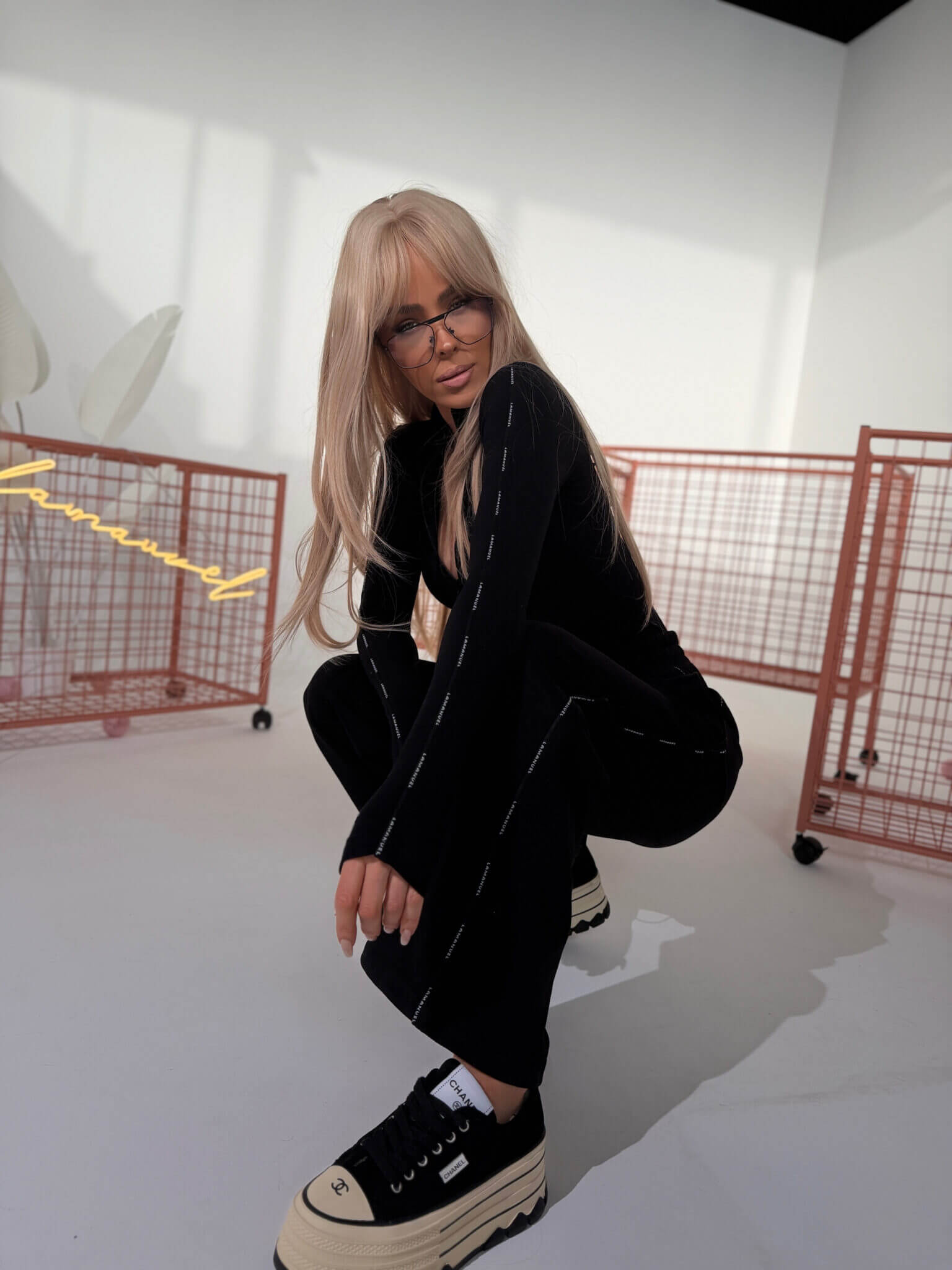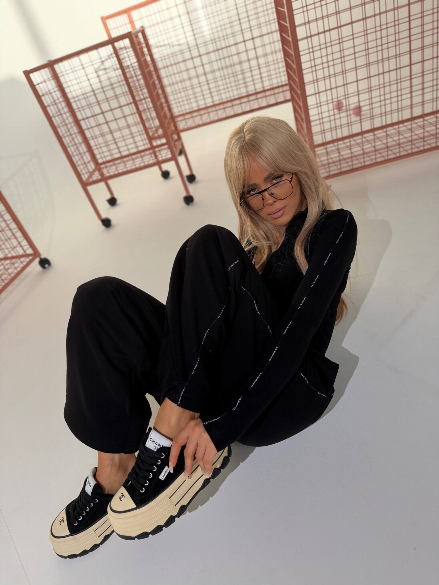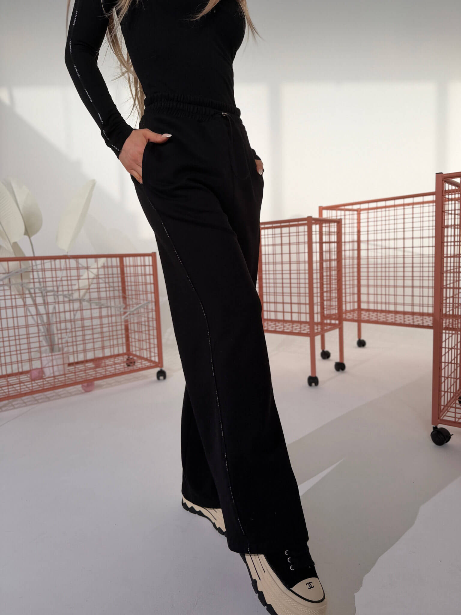 Model oparty na szerokiej, prostej nogawce z wydłużoną linią. Dzianina pętelkowa – miękka, ale stabilna. W pasie elastyczna guma i sznurek do regulacji. Boczna taśma z powtarzalnym logo w odcieniu bazowym. Wykończenie bez ściągaczy. Forma inspirowana sylwetką garniturową, przeniesiona na codzienny materiał. Spodnie, które można nosić jak dres, ale wyglądają jak przemyślany element stylizacji.
