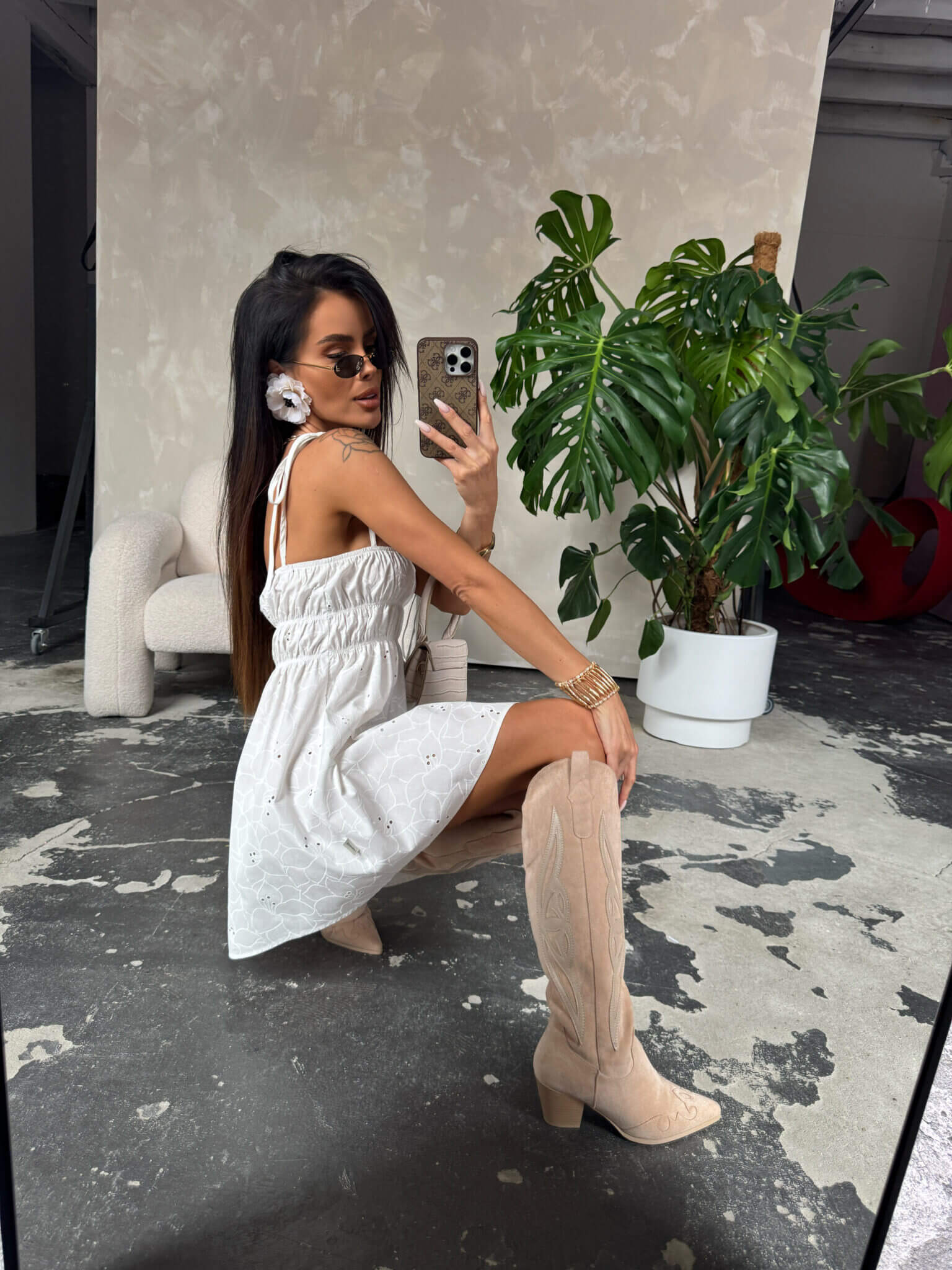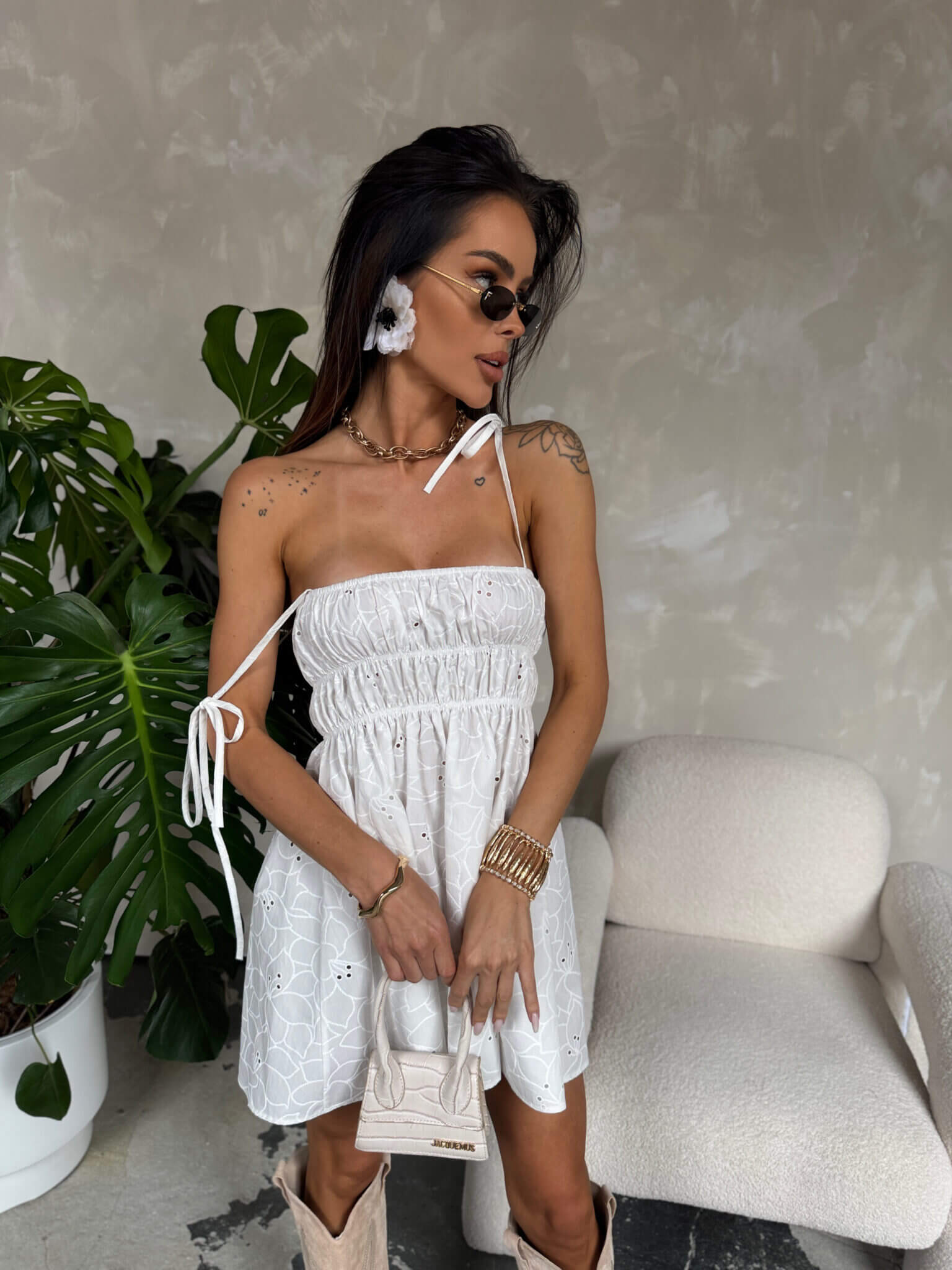 Sukienka mini DAHLIA LAMANUEL o rozkloszowanym kroju wykonana z haftowanej tkaniny z ażurowymi detalami. Góra na gumce z ozdobnym marszczeniem oraz cienkimi ramiączkami do wiązania. Lekki materiał i swobodny fason zapewniają komfort noszenia i sprawiają, że model świetnie sprawdza się w letnich stylizacjach.