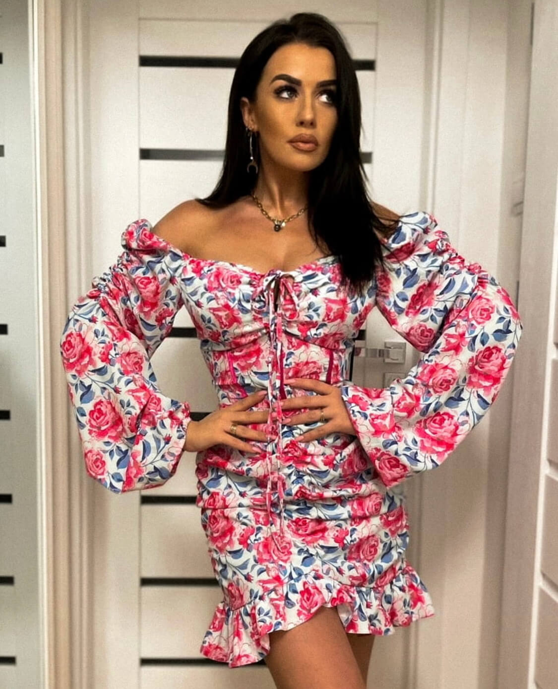 Sukienka EVY LA PERLA w przepiękny kwiatowy print. Dopasowany model z długim rękawem, dekolt  w kształcie serca, można nosić również jako hiszpankę. Posiada marszczenia oraz falbankę na dole sukienki. W pasie posiada wstawki , z tyłu kryty zamek. Idealna propozycja na chrzciny, komunię czy wesele. Rewelacyjnie podkreśla figurę.